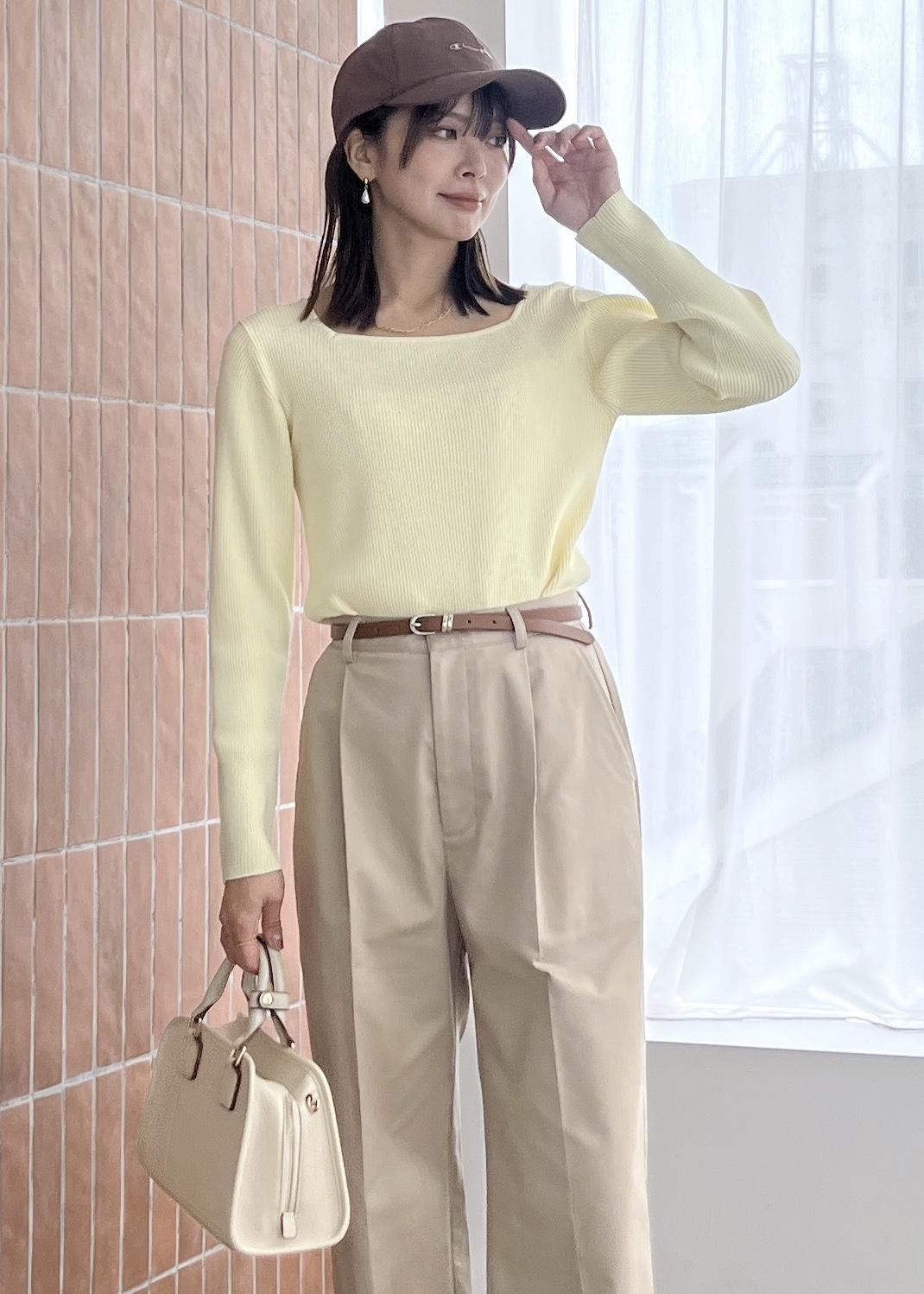 気分も明るくしてくれる春のイエローカラーのニットは、スクエアネックですっきりデザイン。