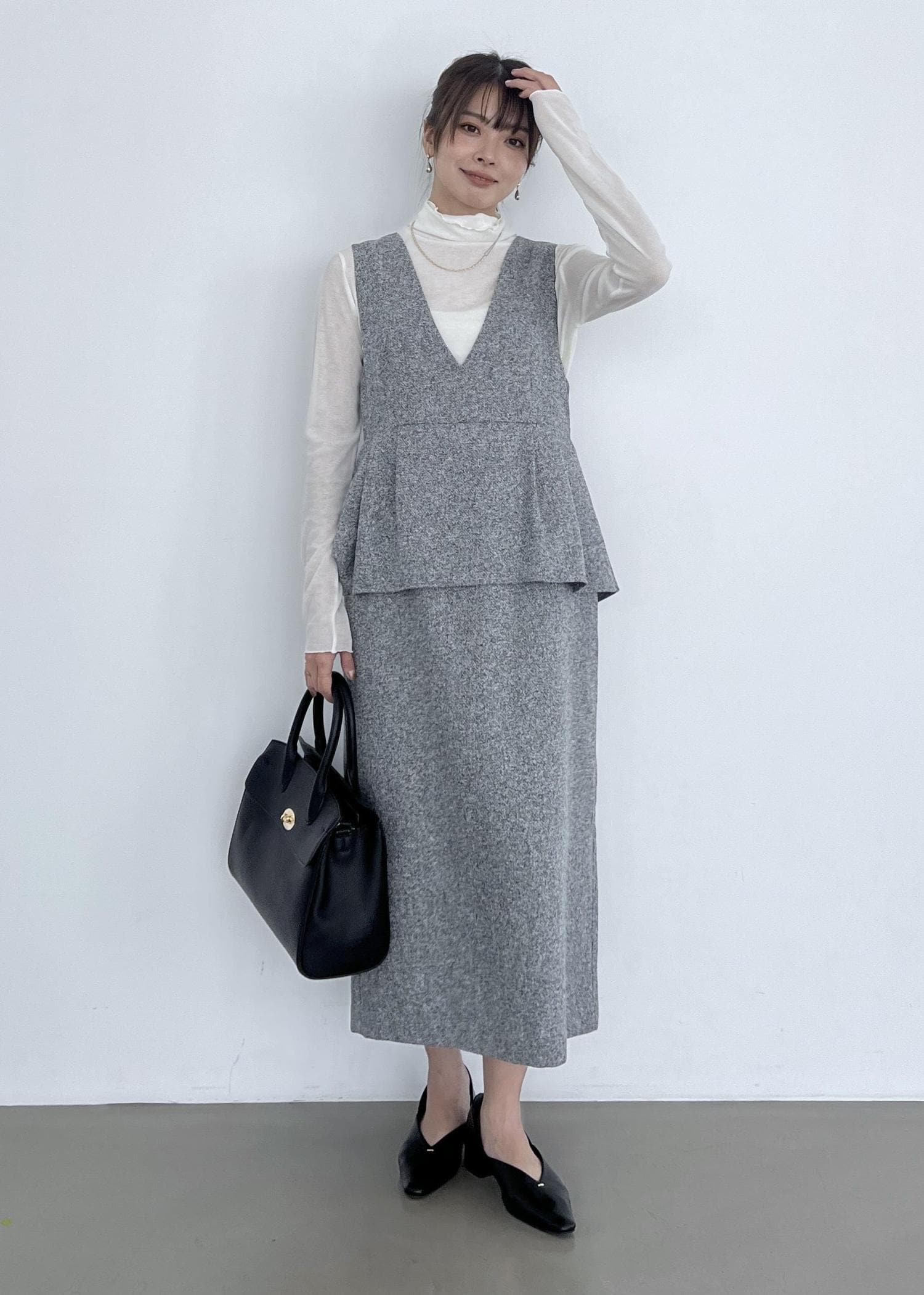 新色のライトグレーは明るく見せてくれるので、今から春まで着回しできます◎。