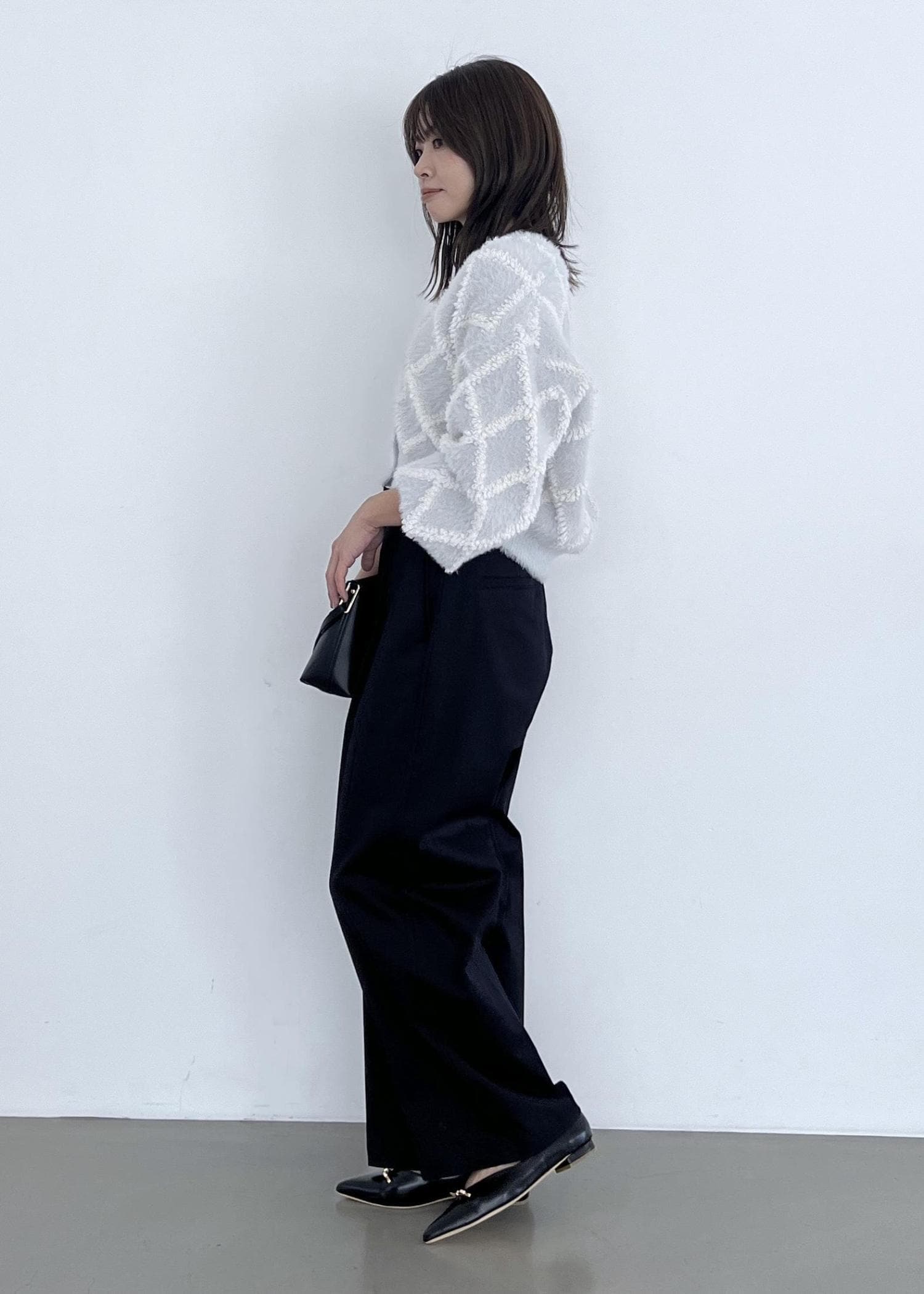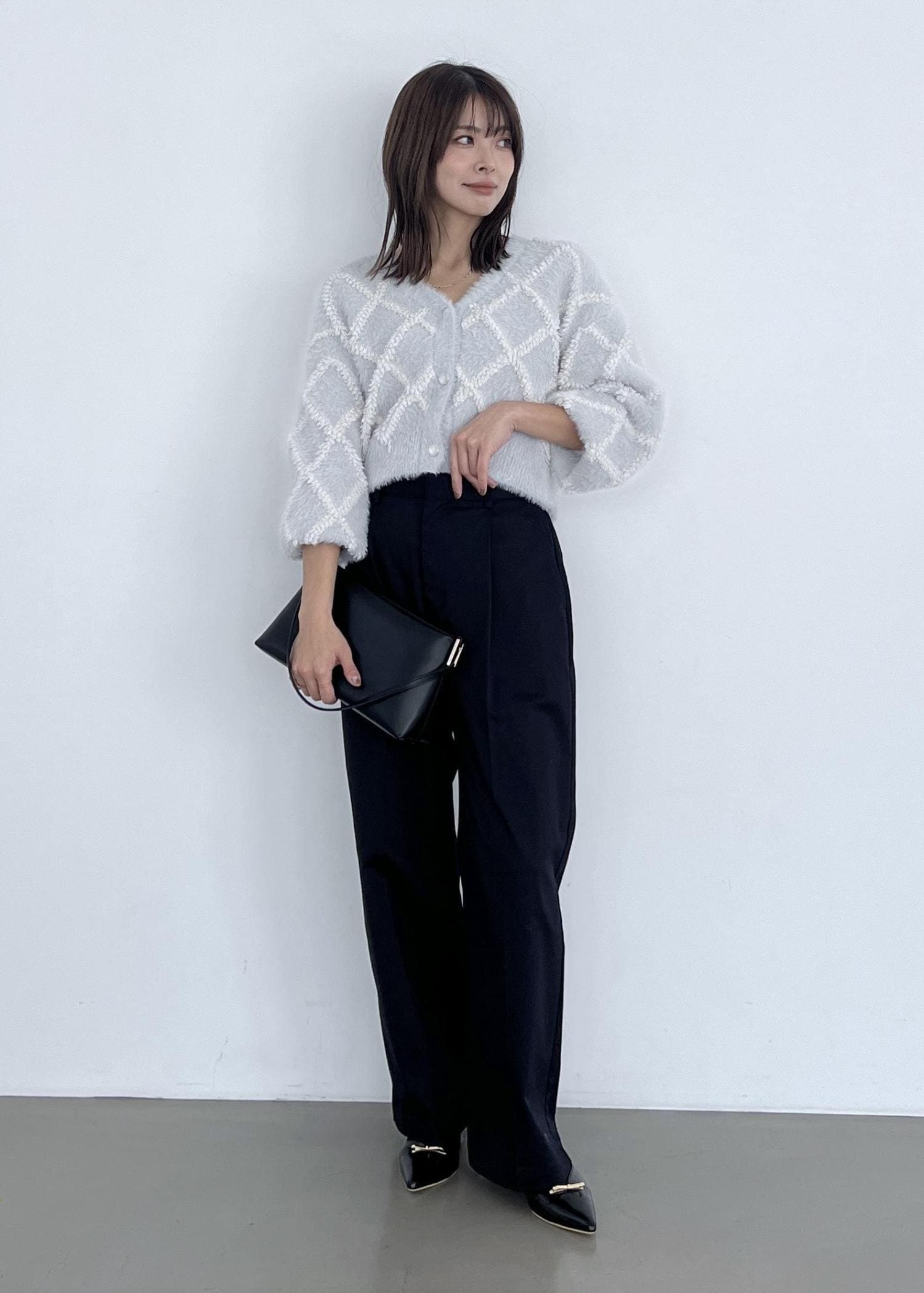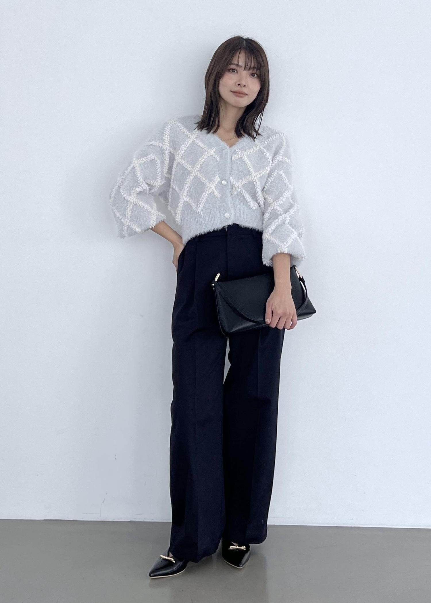 ジャストの着丈のカーディガンなので、ワイドシルエットのボトムにも合わせやすいです。