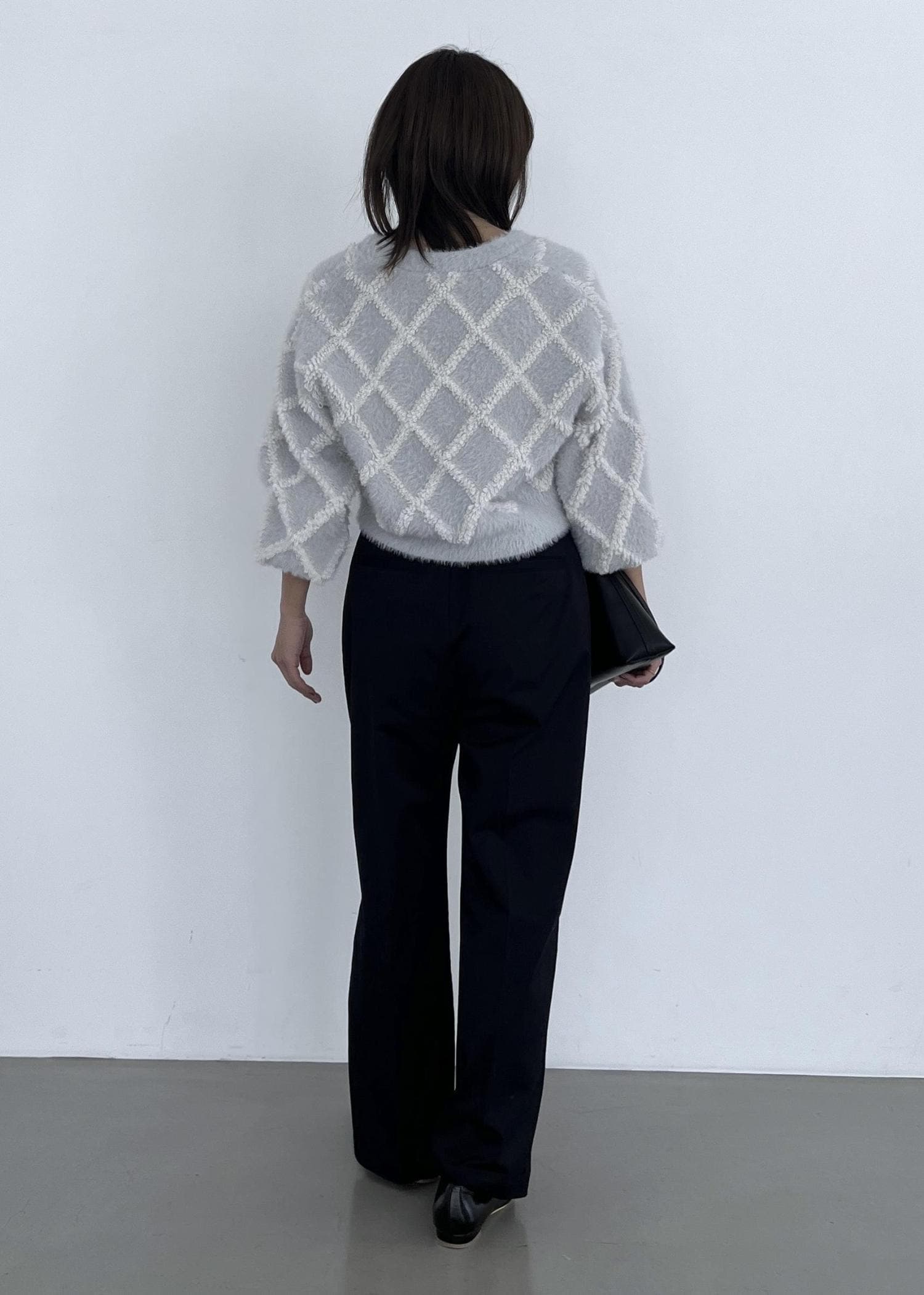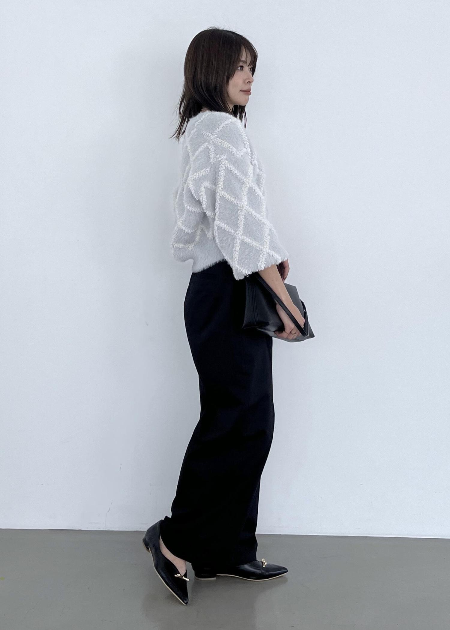 ダイヤチェックの模様がポイントのカーディガンは、Vネックで大人コーデにぴったり。
