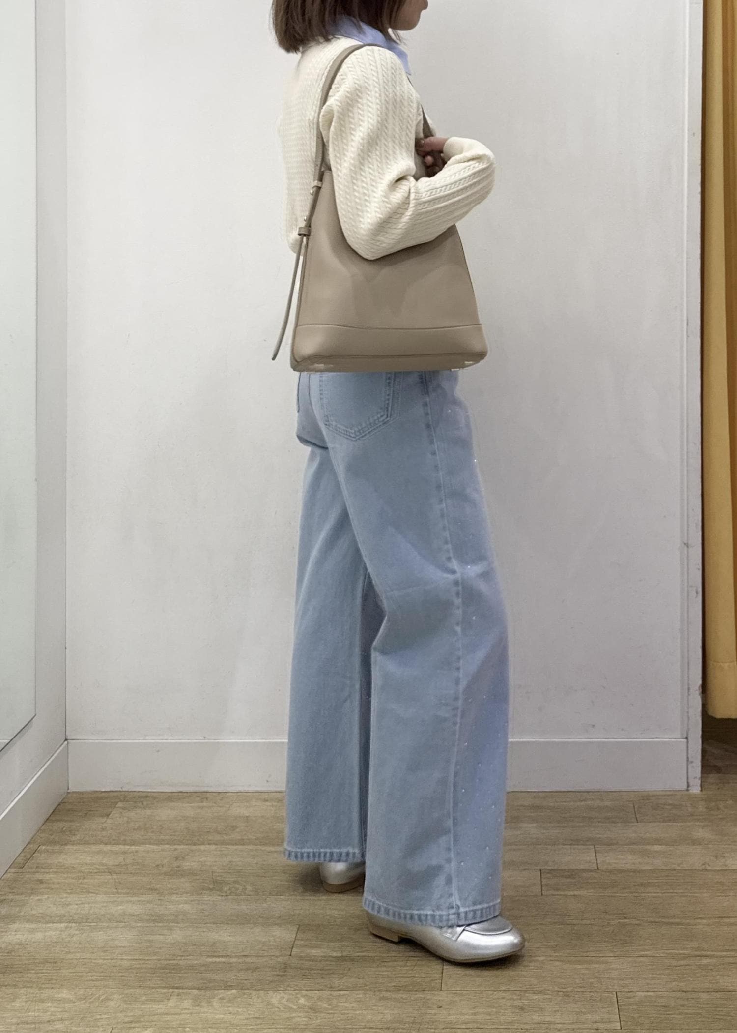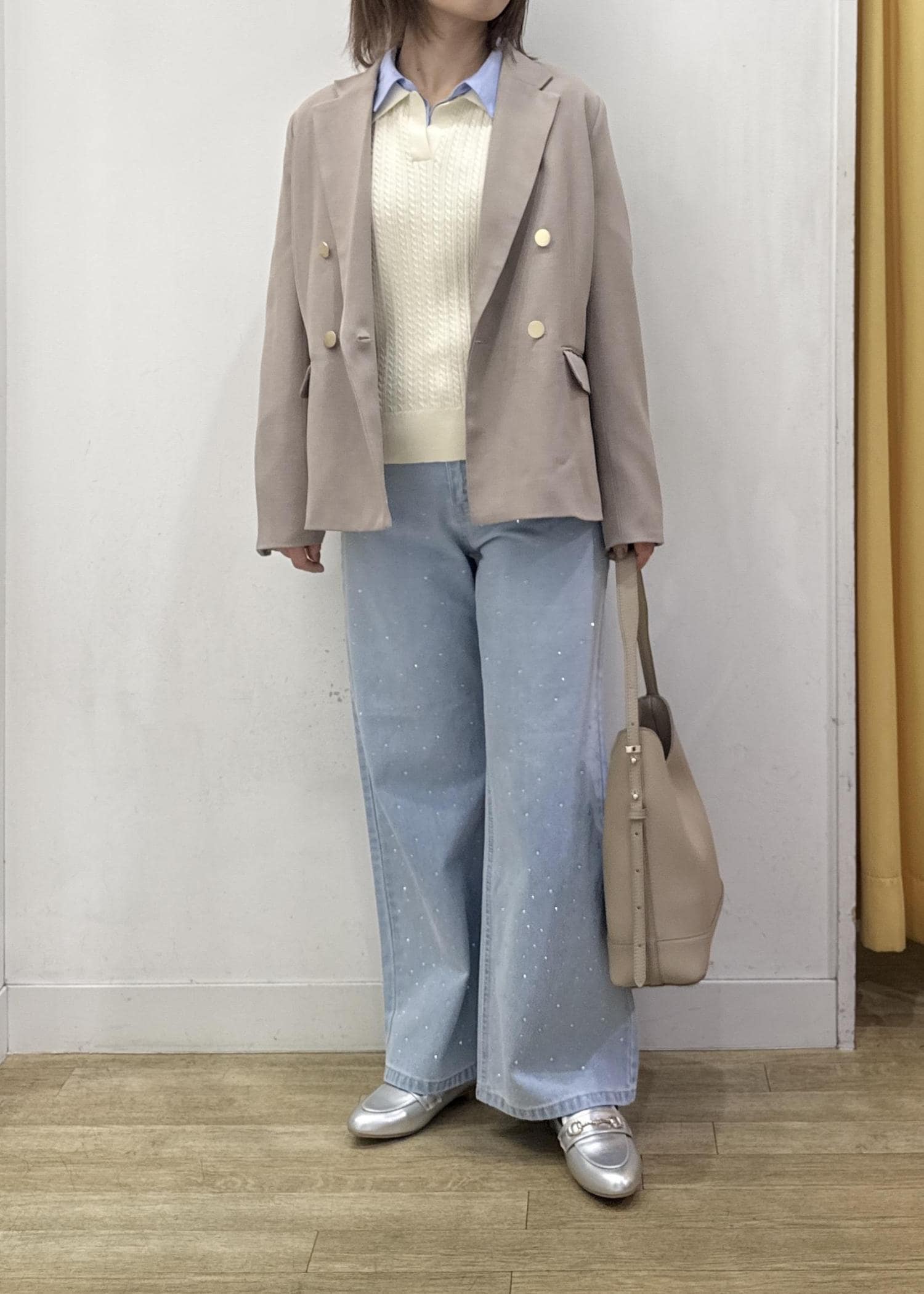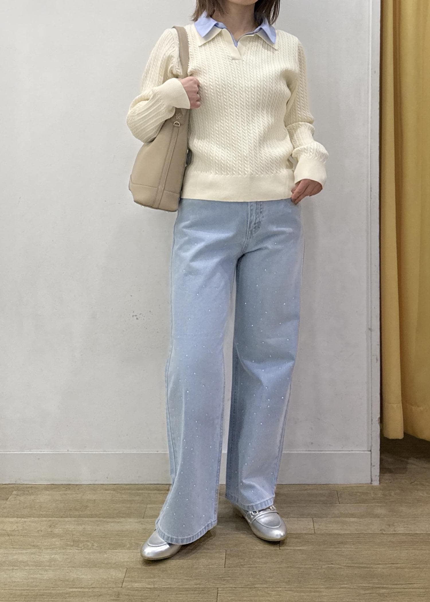 脚のラインは拾わないワイドシルエットで、カジュアルになりがちなデニムもビジューデザインで華やかに着ていただけます。