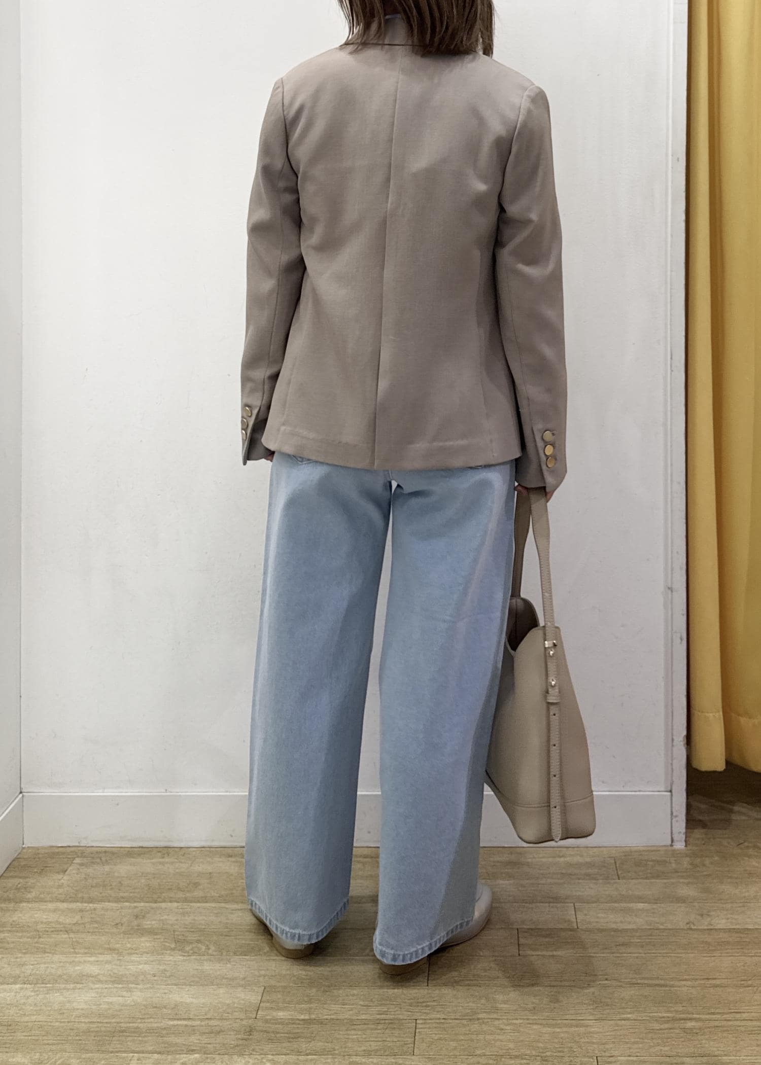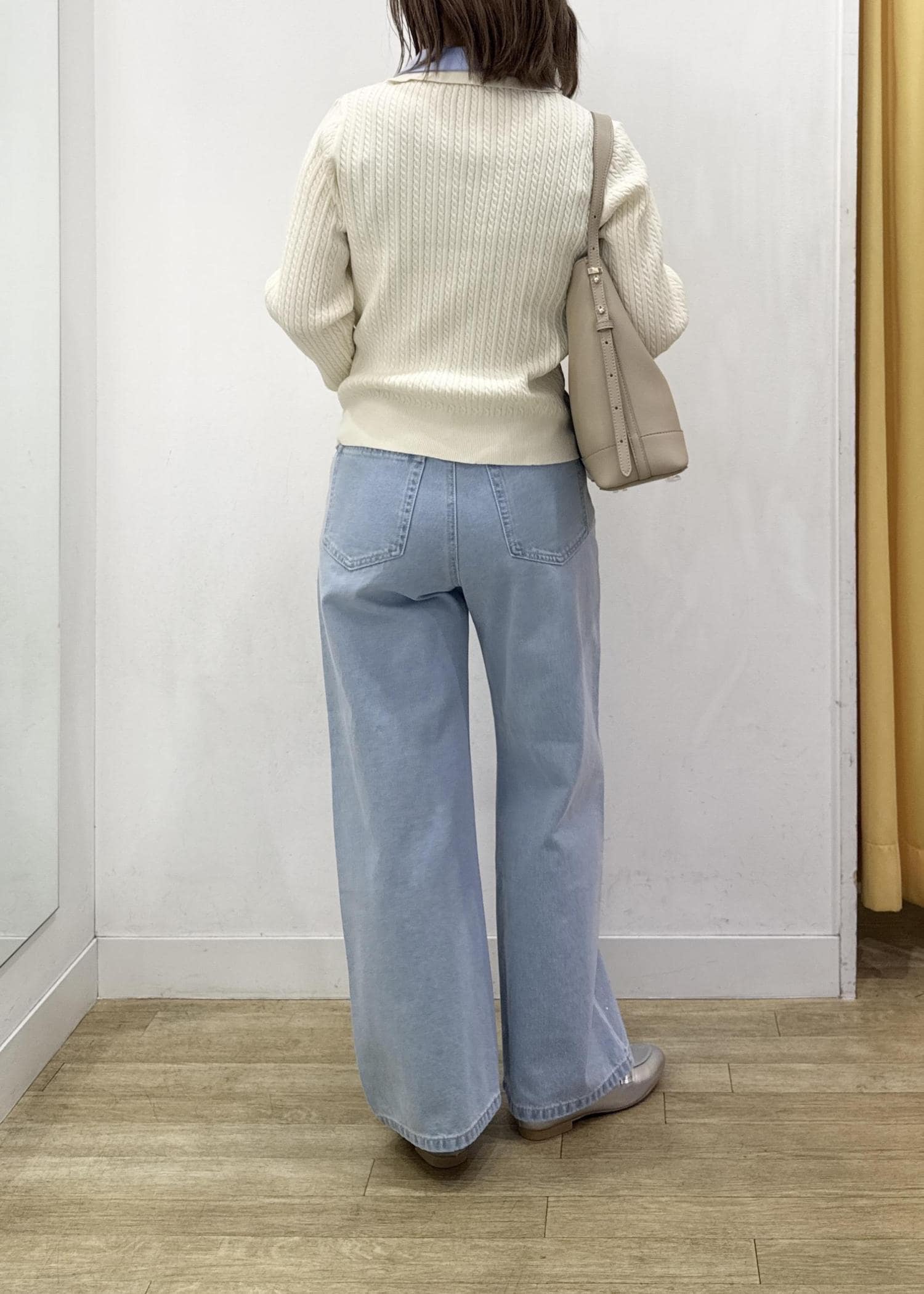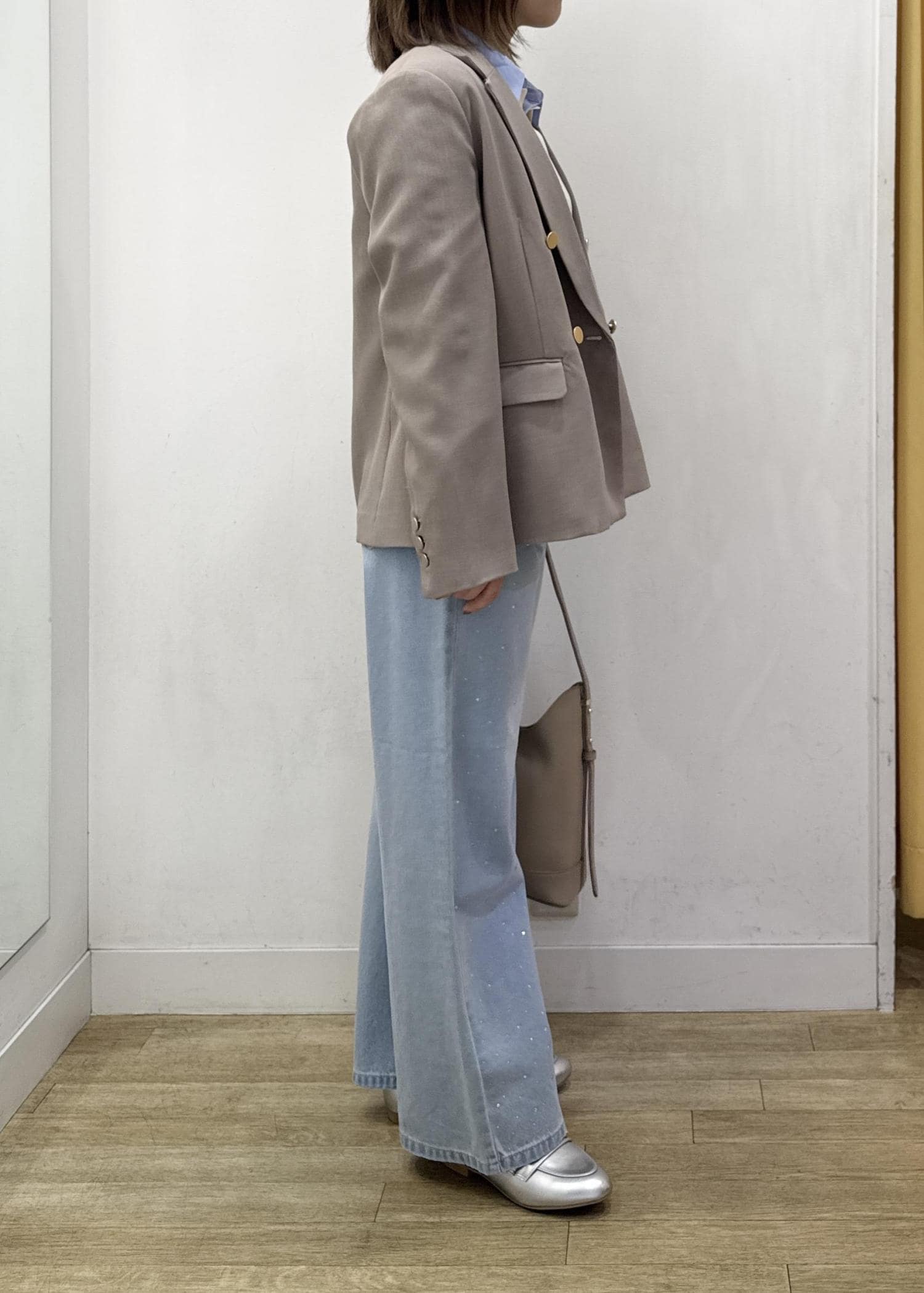 脚のラインは拾わないワイドシルエットで、カジュアルになりがちなデニムもビジューデザインで華やかに着ていただけます。