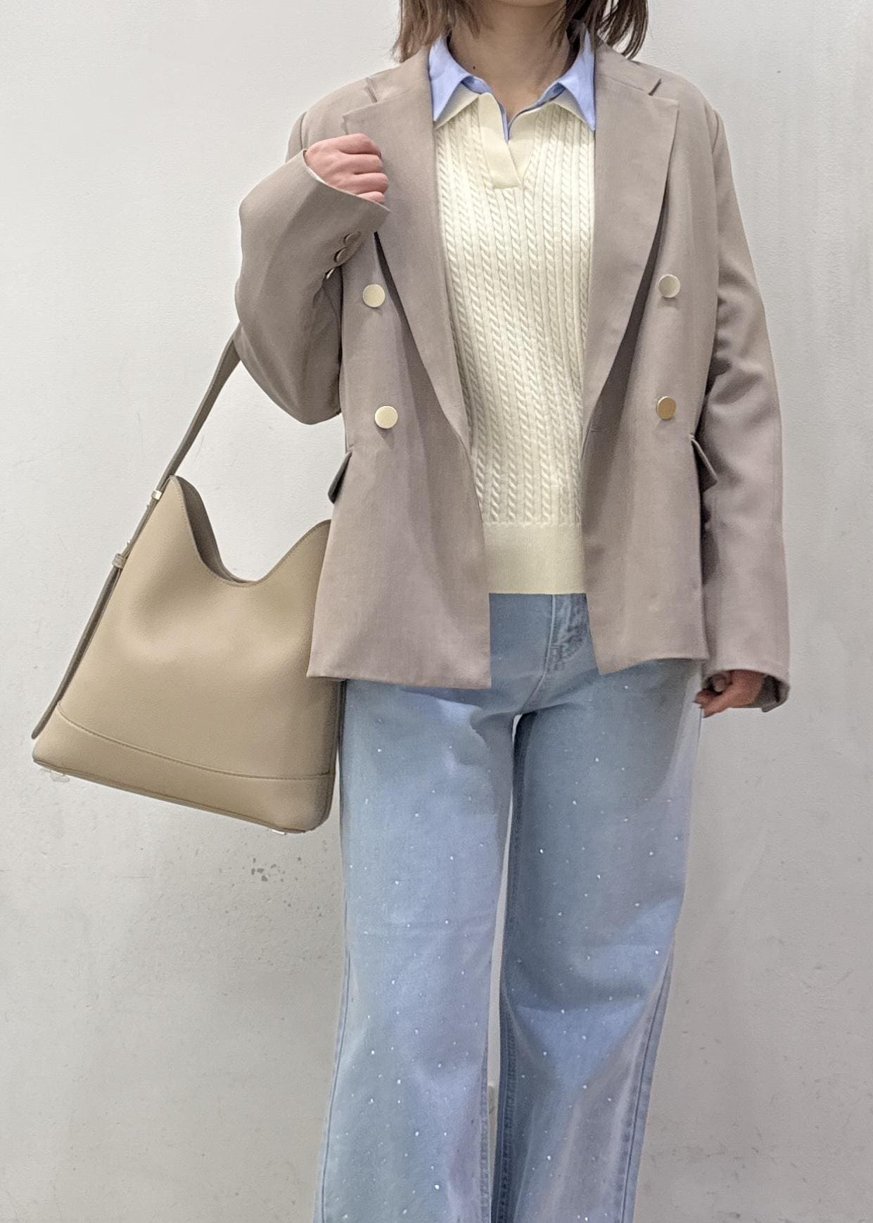 ヒップにかかるぐらいの着丈でスカート、パンツどちらにも合わせやすい長さです。 -