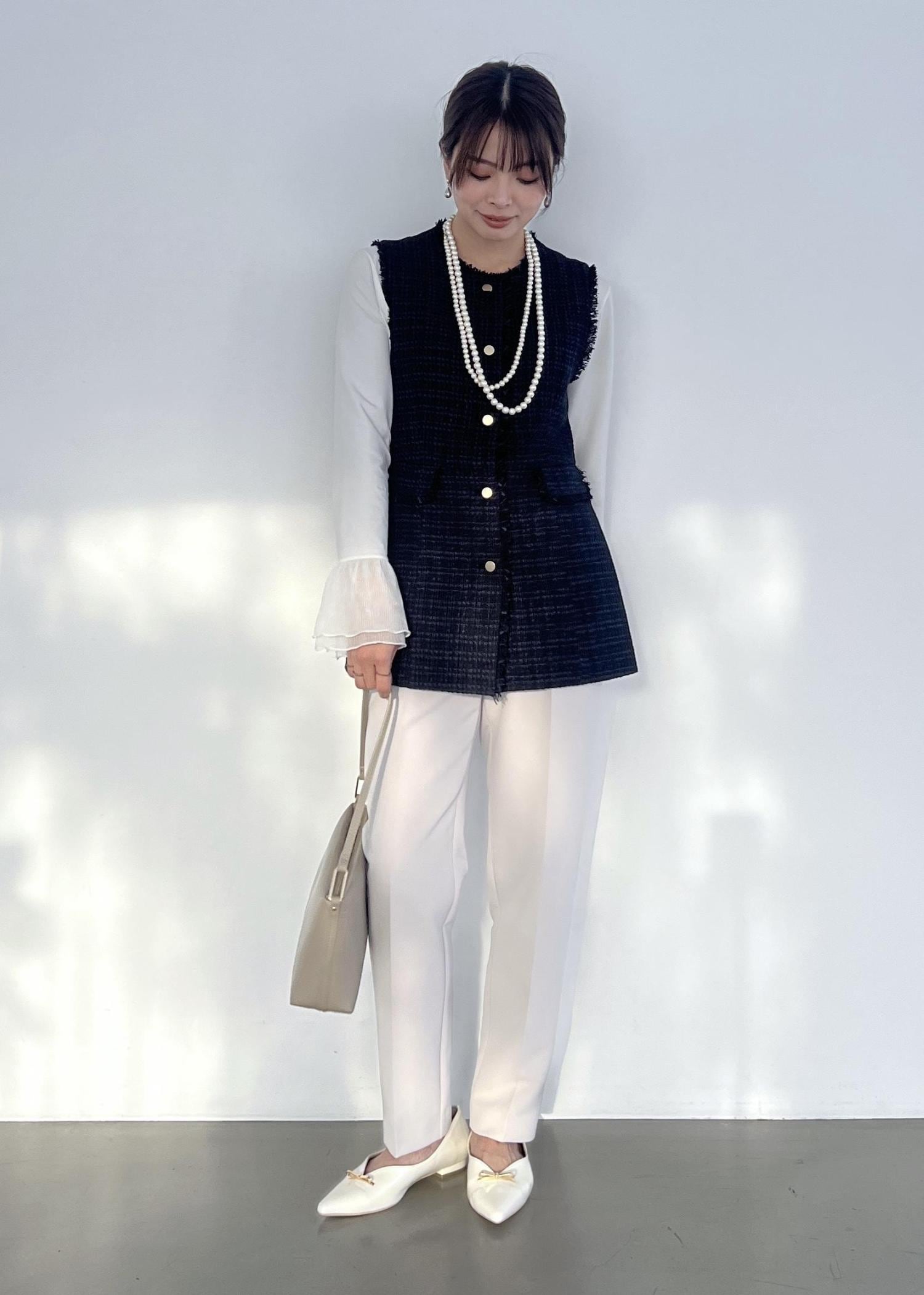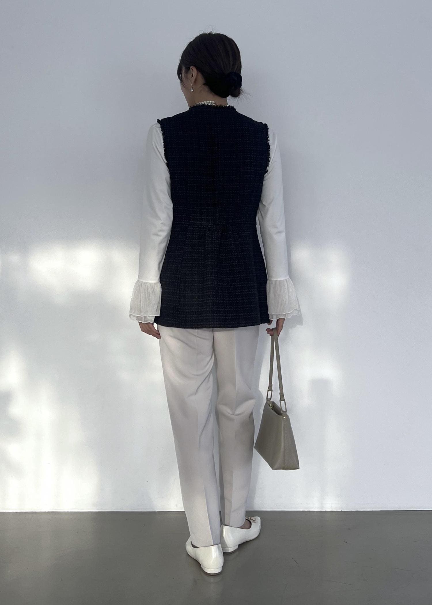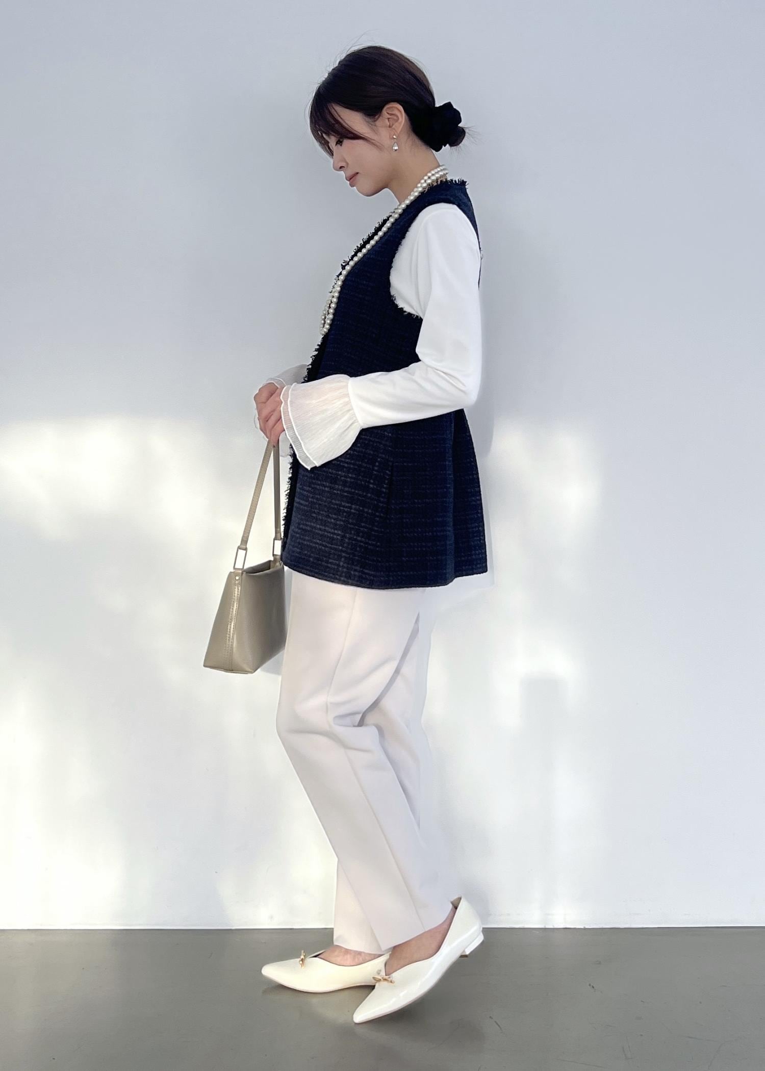 スッキリ感のあるツイード生地のジレは、ウエストがぺプラム調の切り替えで華やか。