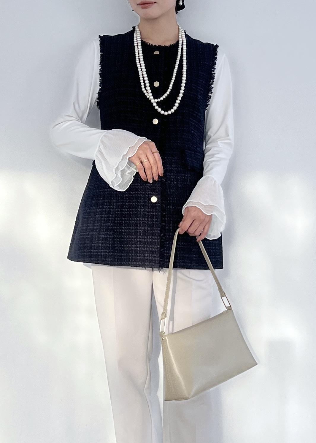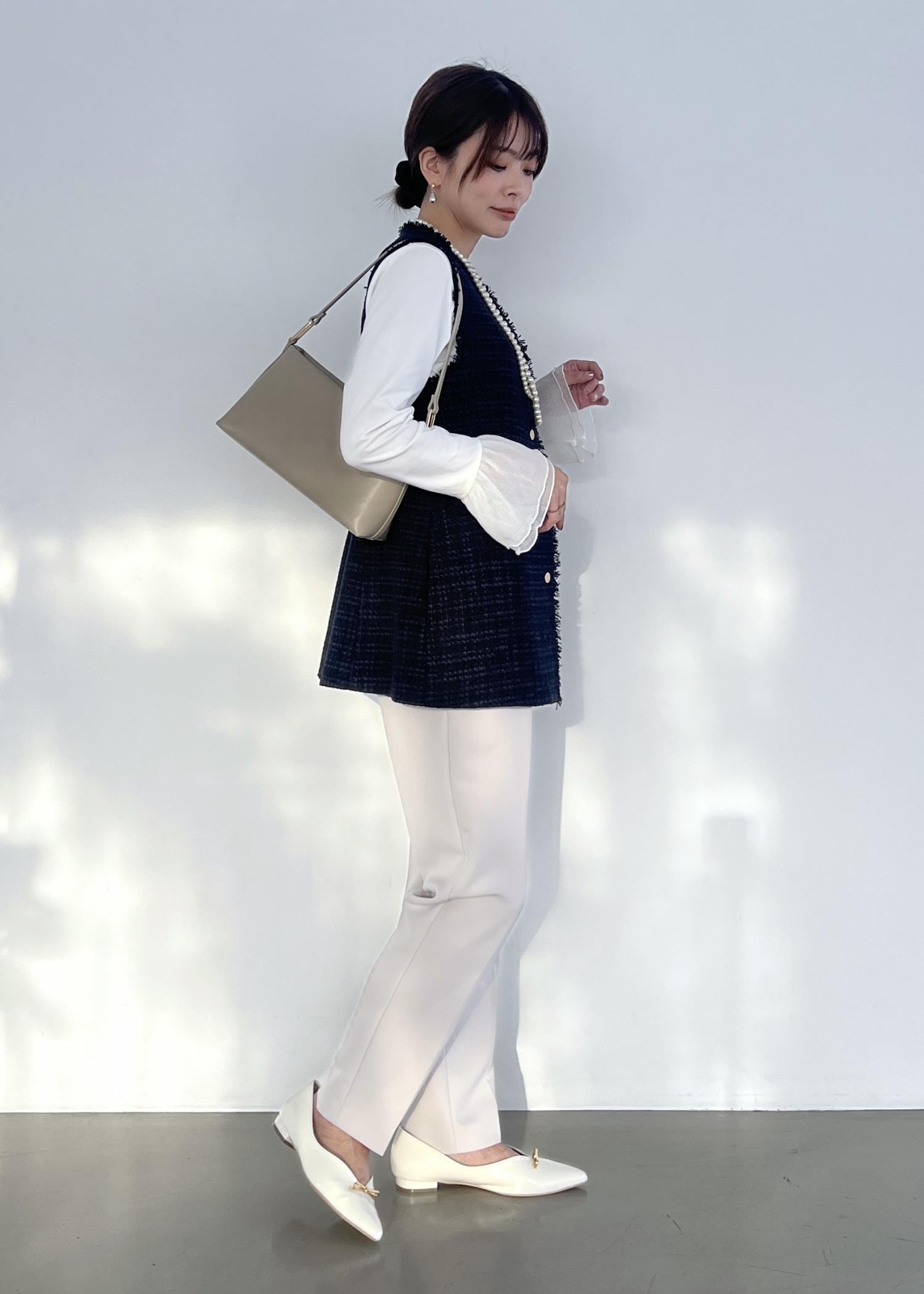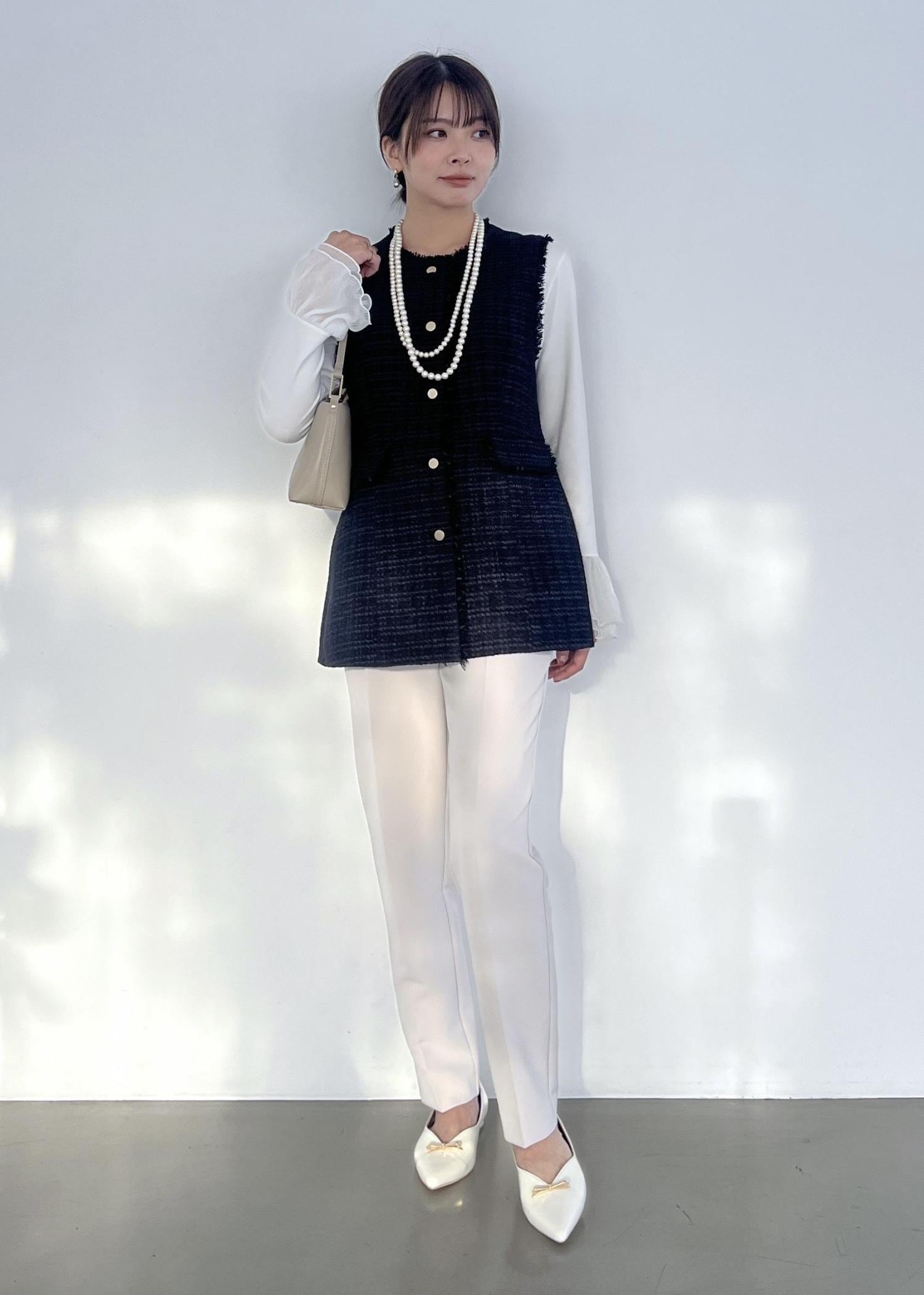 スッキリ感のあるツイード生地のジレは、ウエストがぺプラム調の切り替えで華やか。