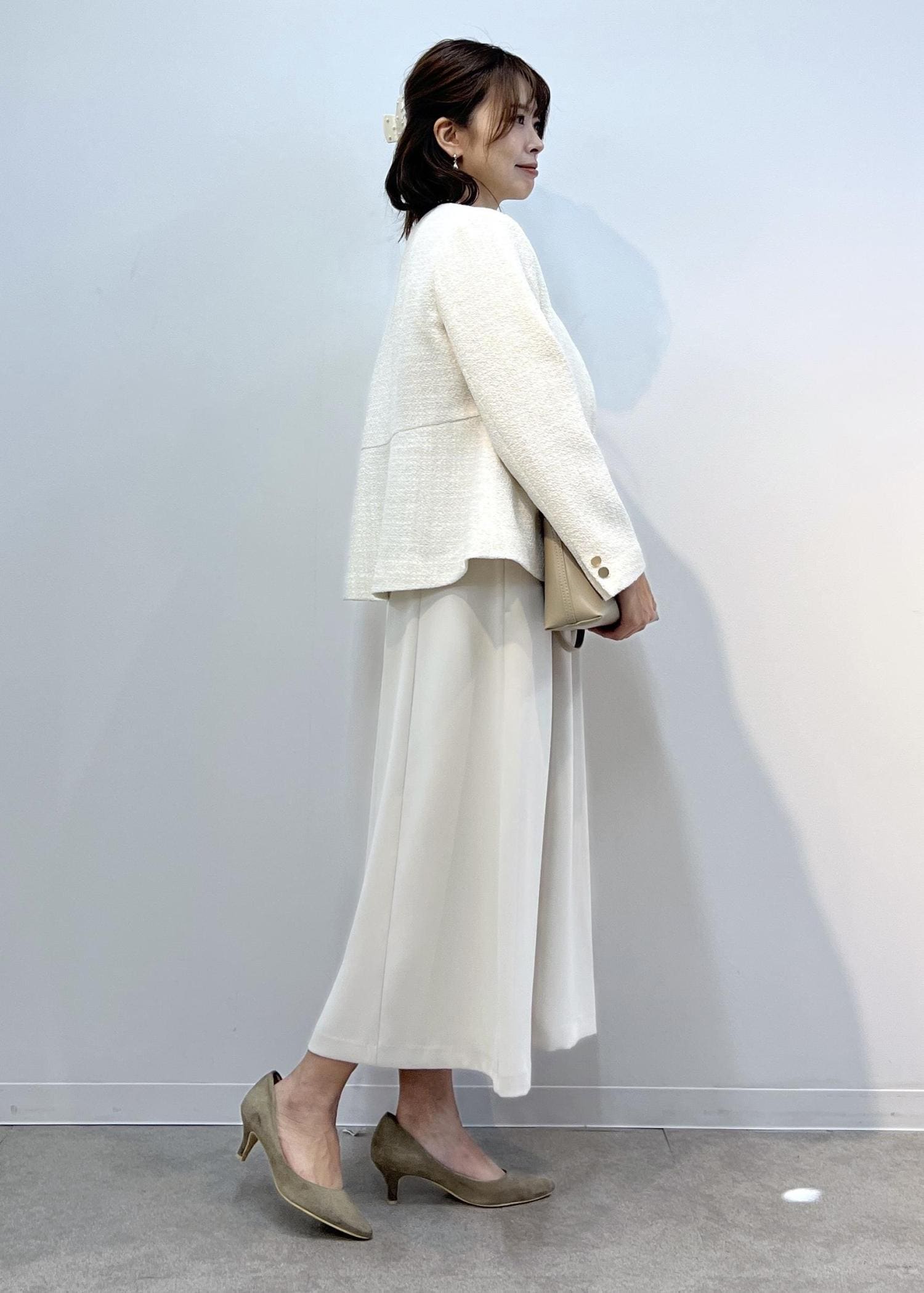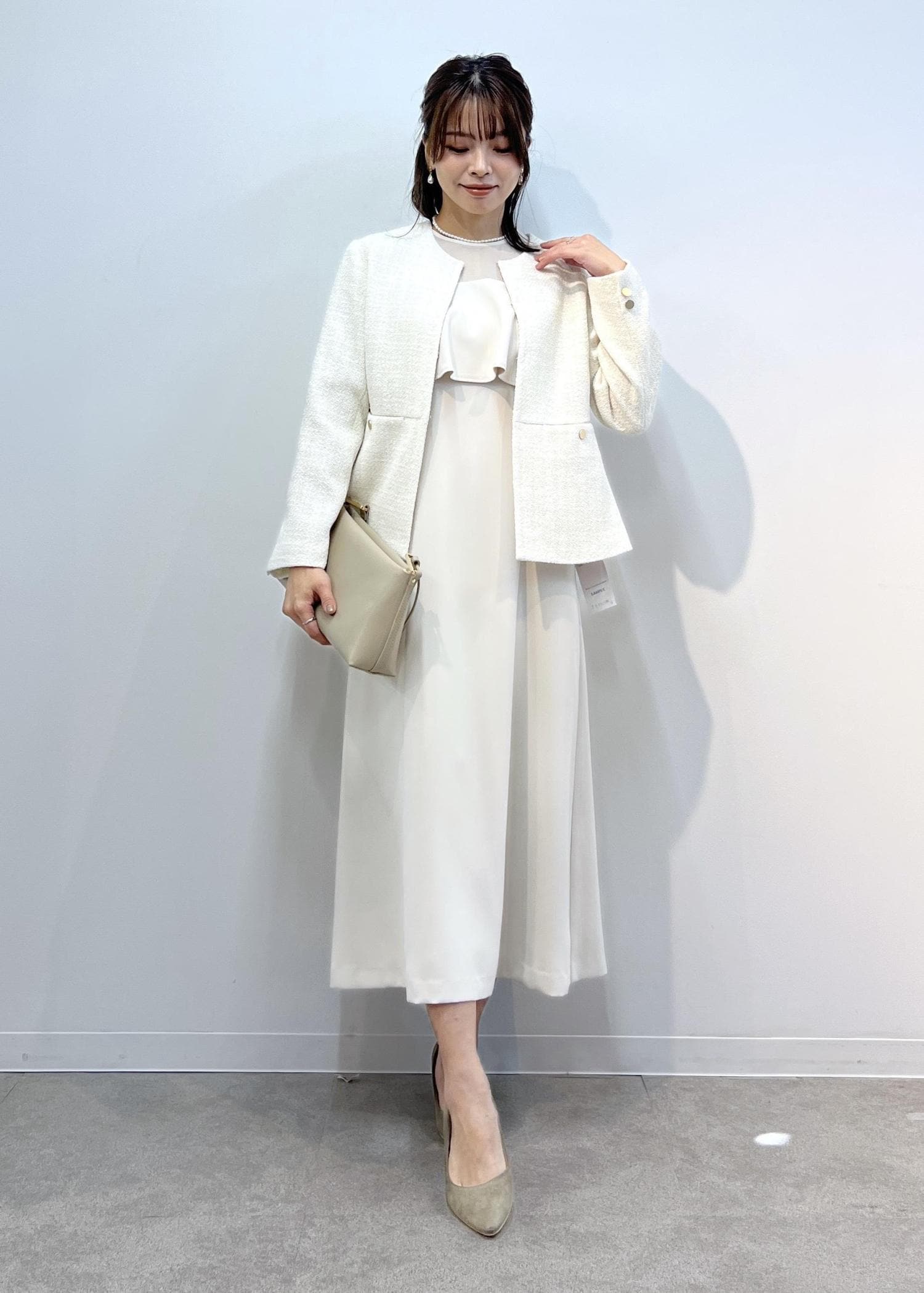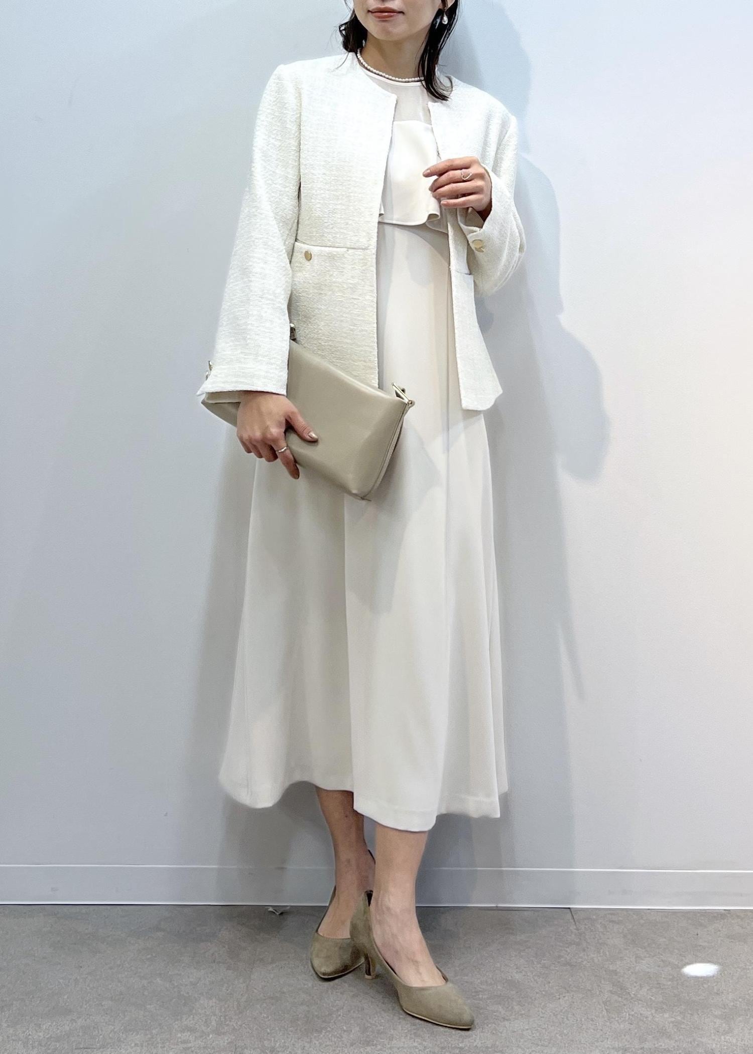 羽織るだけできちんと綺麗めになれるツイードジャケットは、結婚式や入学式のセレモニースタイルにおすすめ。