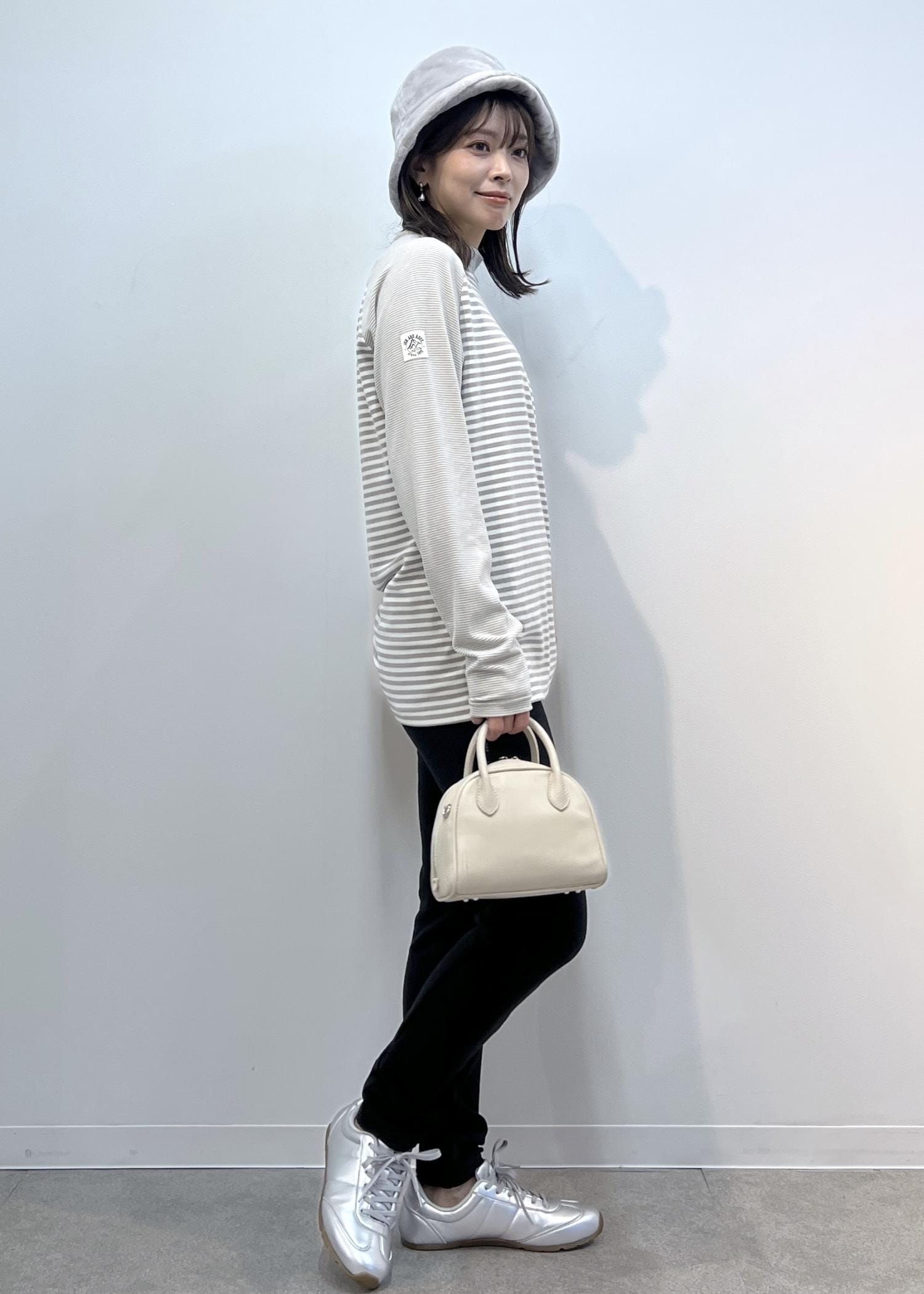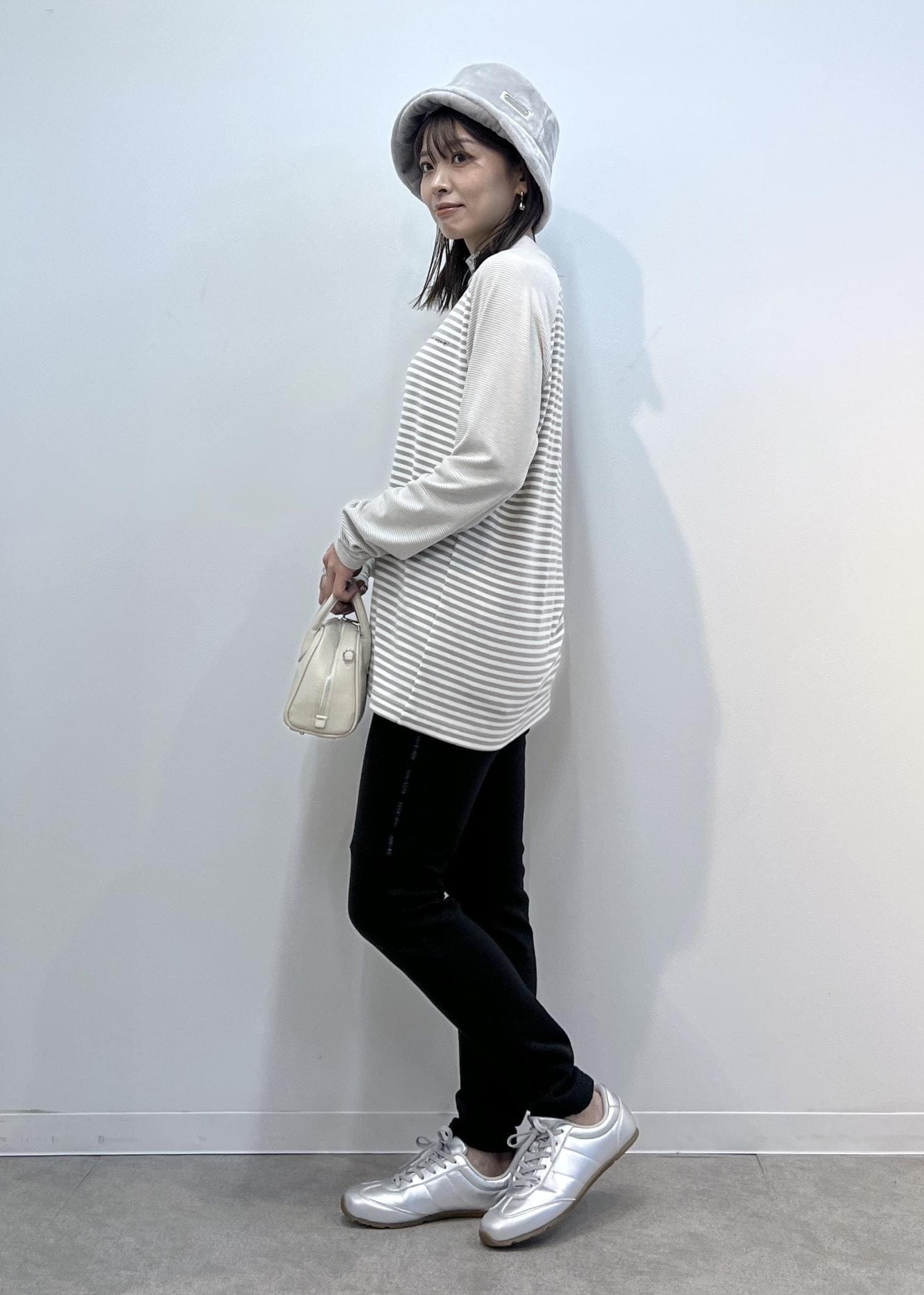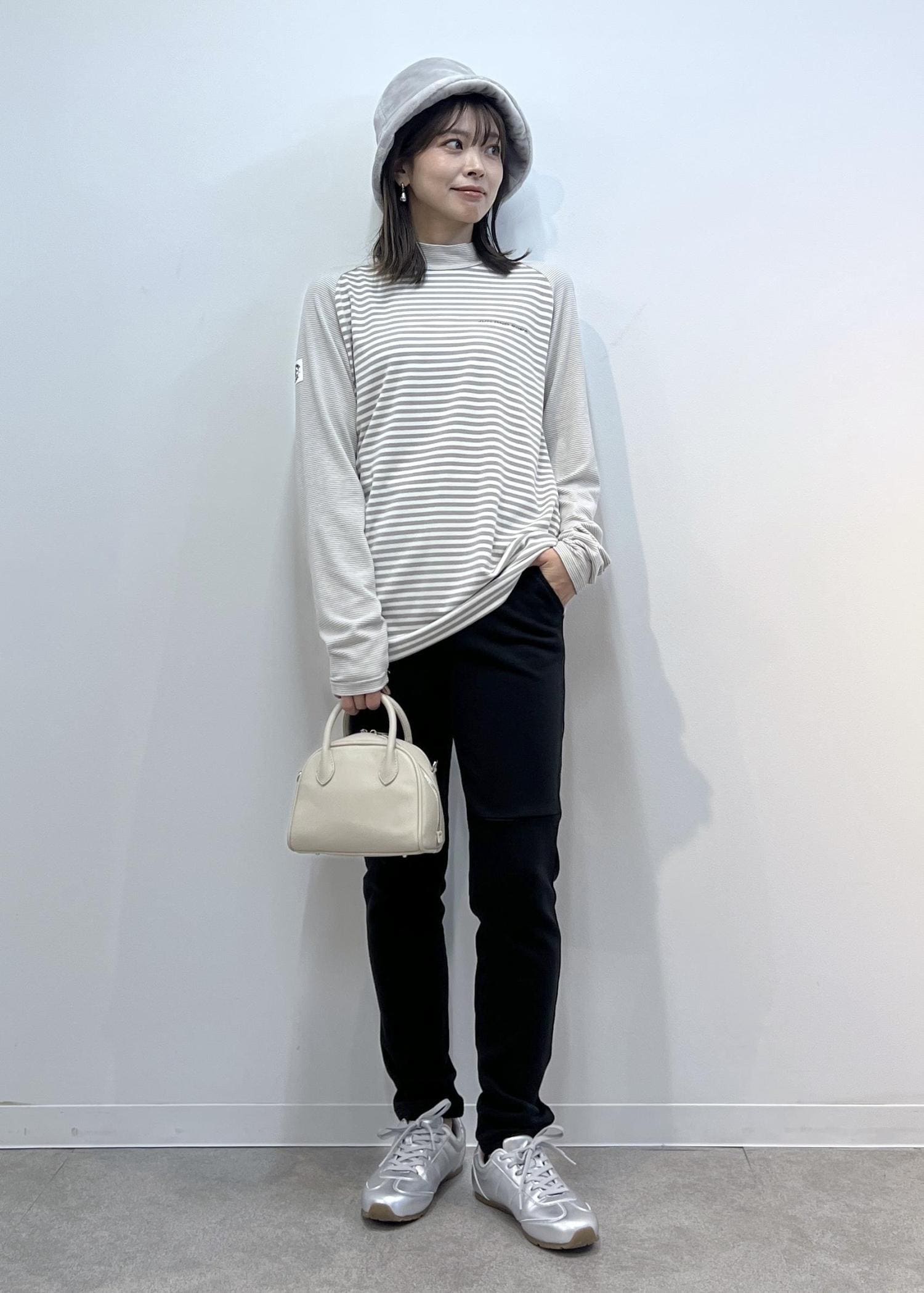 ライトグレーのトップスは柔らかく保温性のある生地で、リラックス感のあるコーデにも。