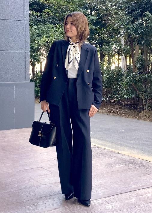 定番のブラウス合わせではなく、シアートップスとスカーフを合わせることで人と被らない個性も出せるセレモニーコーディネートにしました!