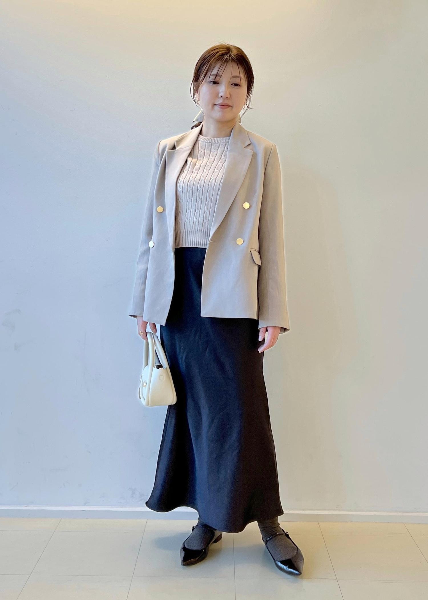 キレイめでもカジュアルでます使える金ボタンジャケットを使った、スカートスタイルです。茶系でまとめてワントーンにしてみました。オフィスカジュアルでもお使いいただけます。