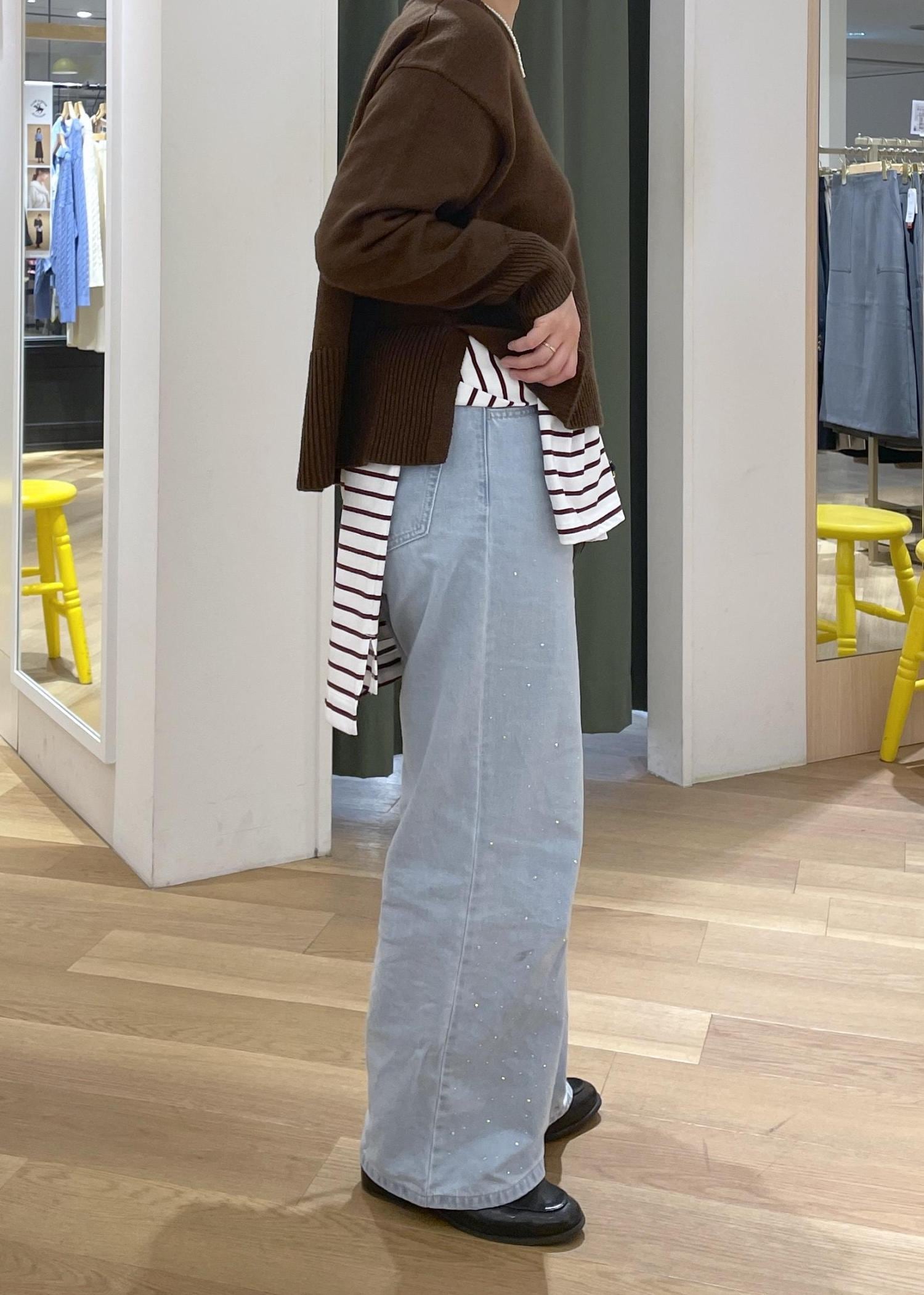 ROPÉ PICNICキラキラビジューデニムブルー / 40¥5,244レビュービジュー使いがいつものデニムスタイルをアップデートしてくれる、主役になるデニムです。細かなビジューなので、そこまで派手過ぎずコーディネートにも取り入れやすいです。シルエットは脚のラインを拾わないワイドシルエットです。少しルーズに履きたかったので、40サイズを着用しています。ウエストや腰回りはゆとりがあり、着丈はフラットシューズだと少し地面に擦りそうな長さです。