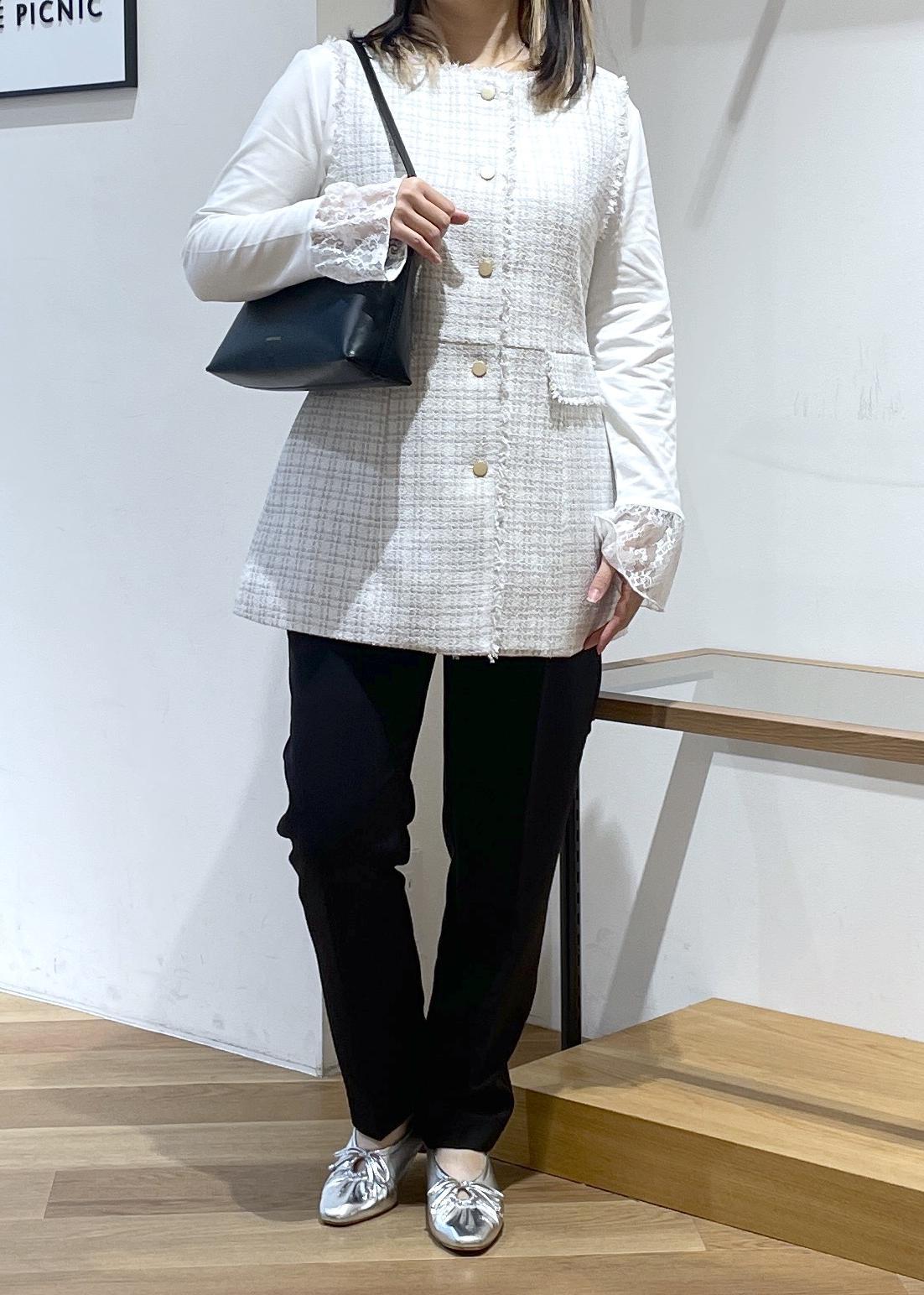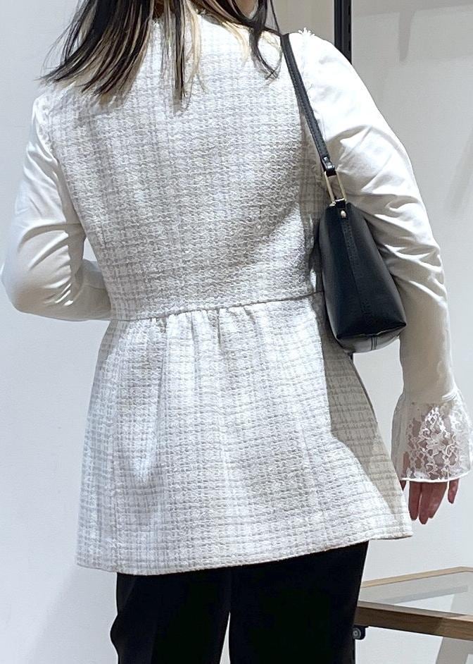 セレモニーにも普段にも着用していただける万能ツイードジレベストです。ウエストのギャザーの切り返しがふわりとしていて、お腹とお尻のカバーができちゃいます○
