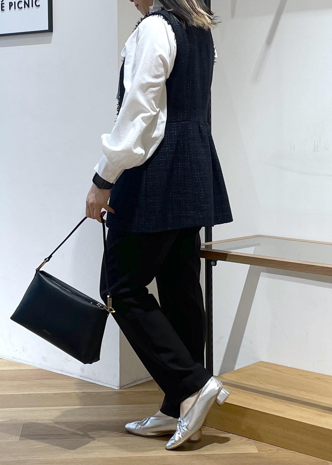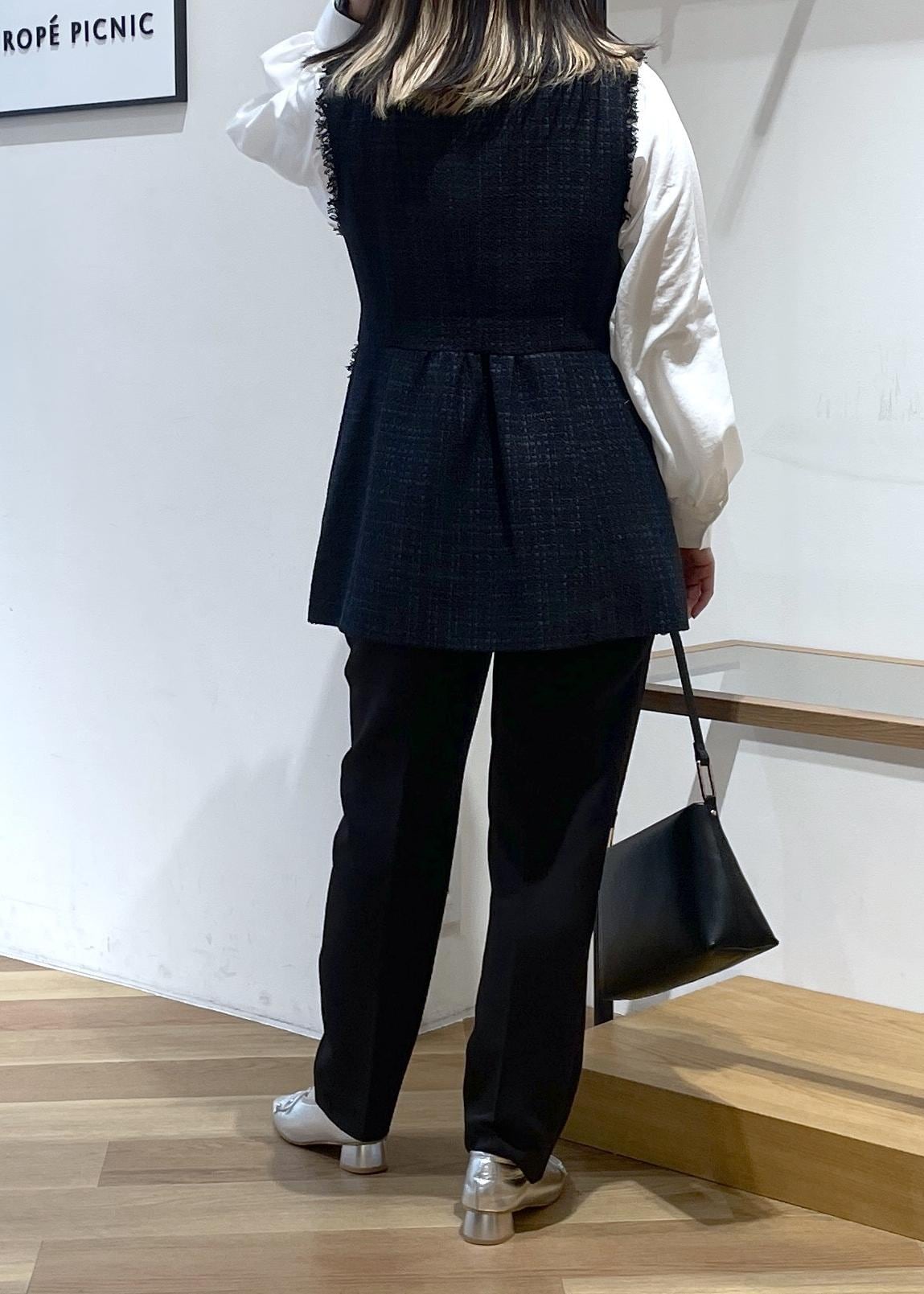 セレモニーにも普段にも着用していただける万能ツイードジレベストです。ウエストのギャザーの切り返しがふわりとしていて、お腹とお尻のカバーができちゃいます○