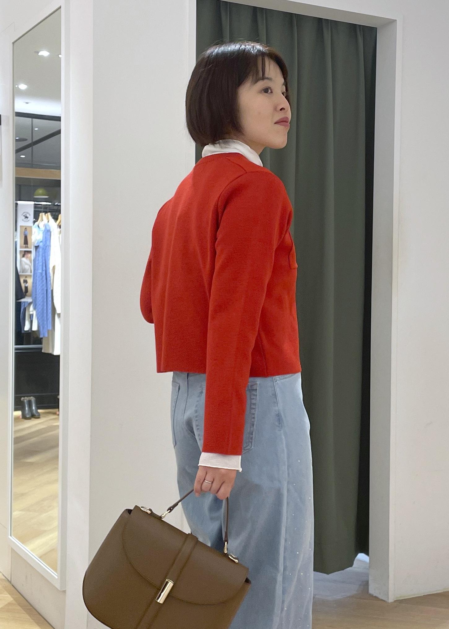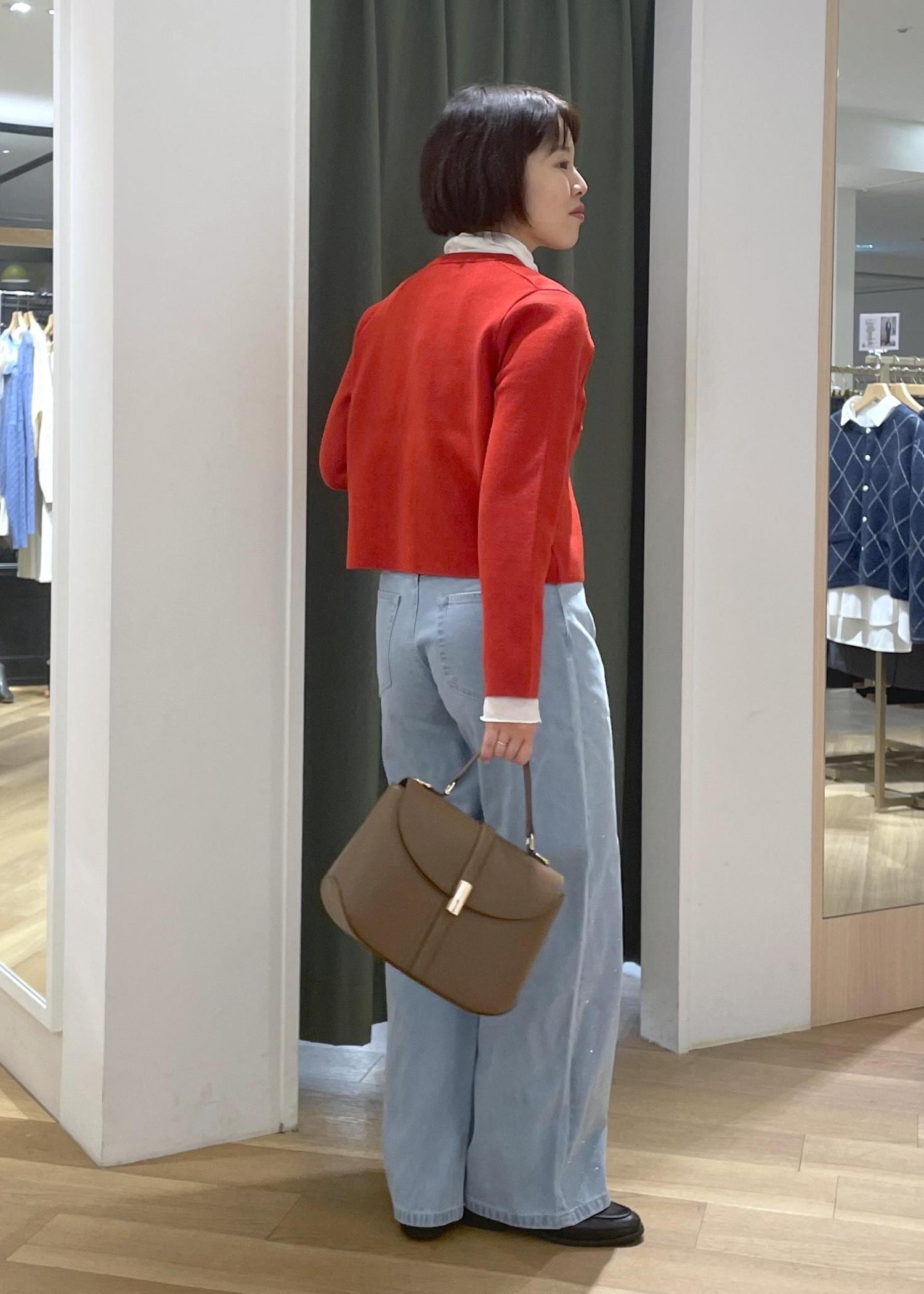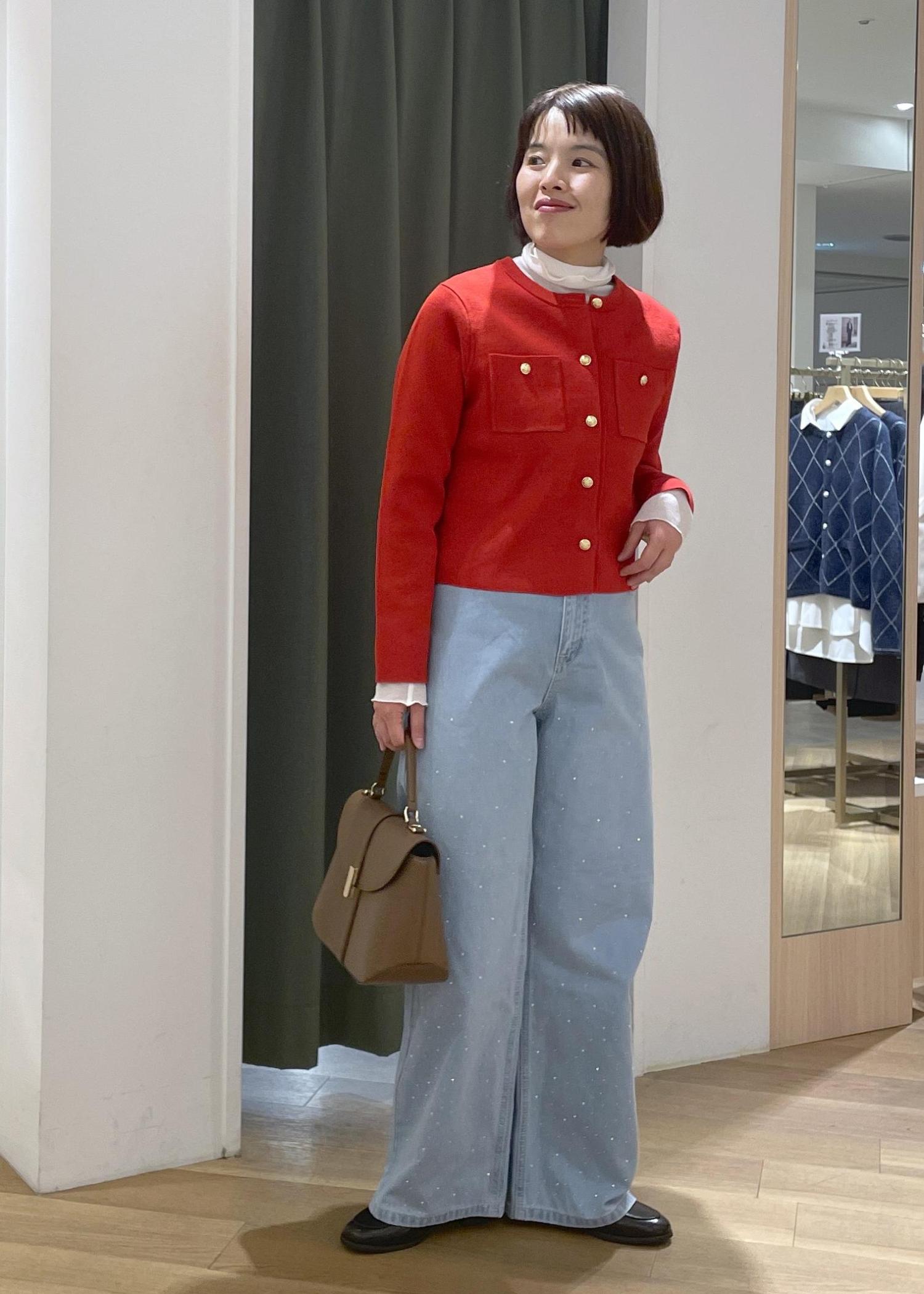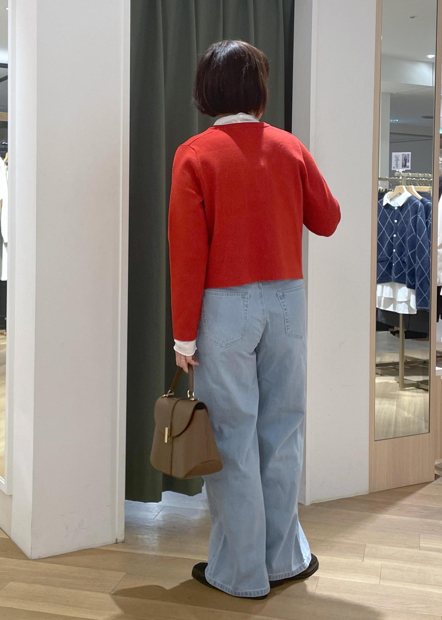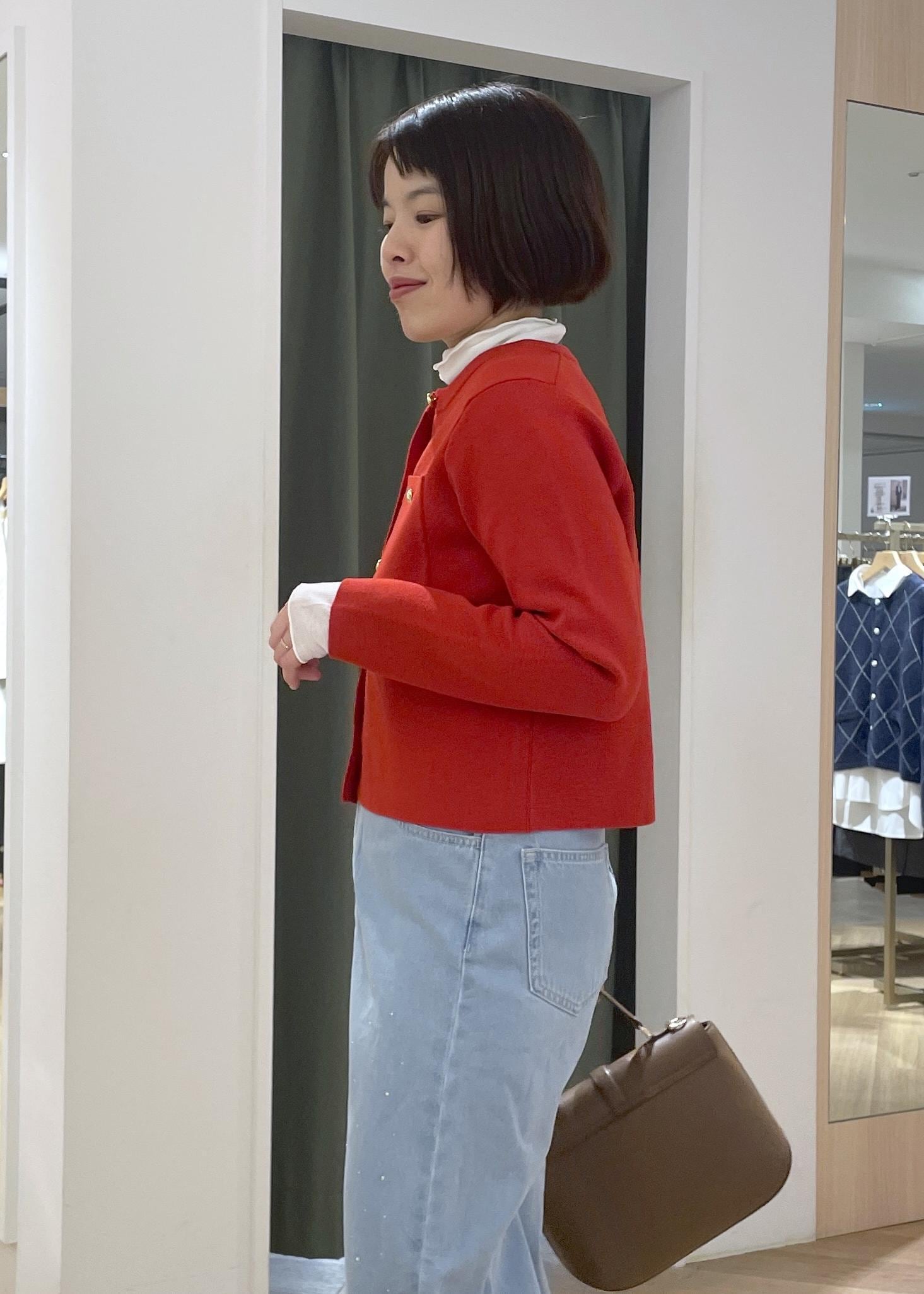 着映えする赤の金釦カーディガンに、サックスブルーのデニムを合わせた、春のお出かけにもおすすめの大人カジュアルコーデです!