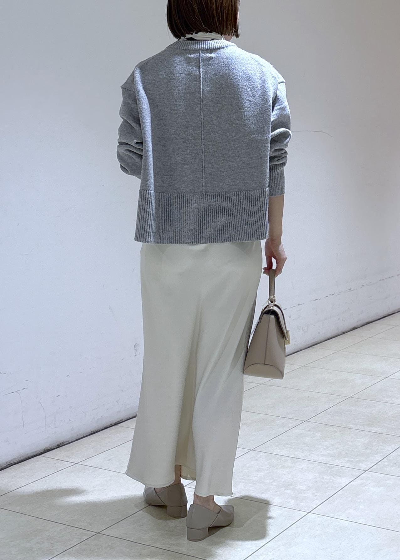 シルエットが綺麗なサテンスカートを合わせた