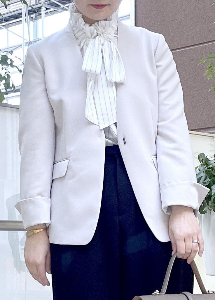 首周りにデザインのあるブラウスを合わせて華やかさをプラスしました。