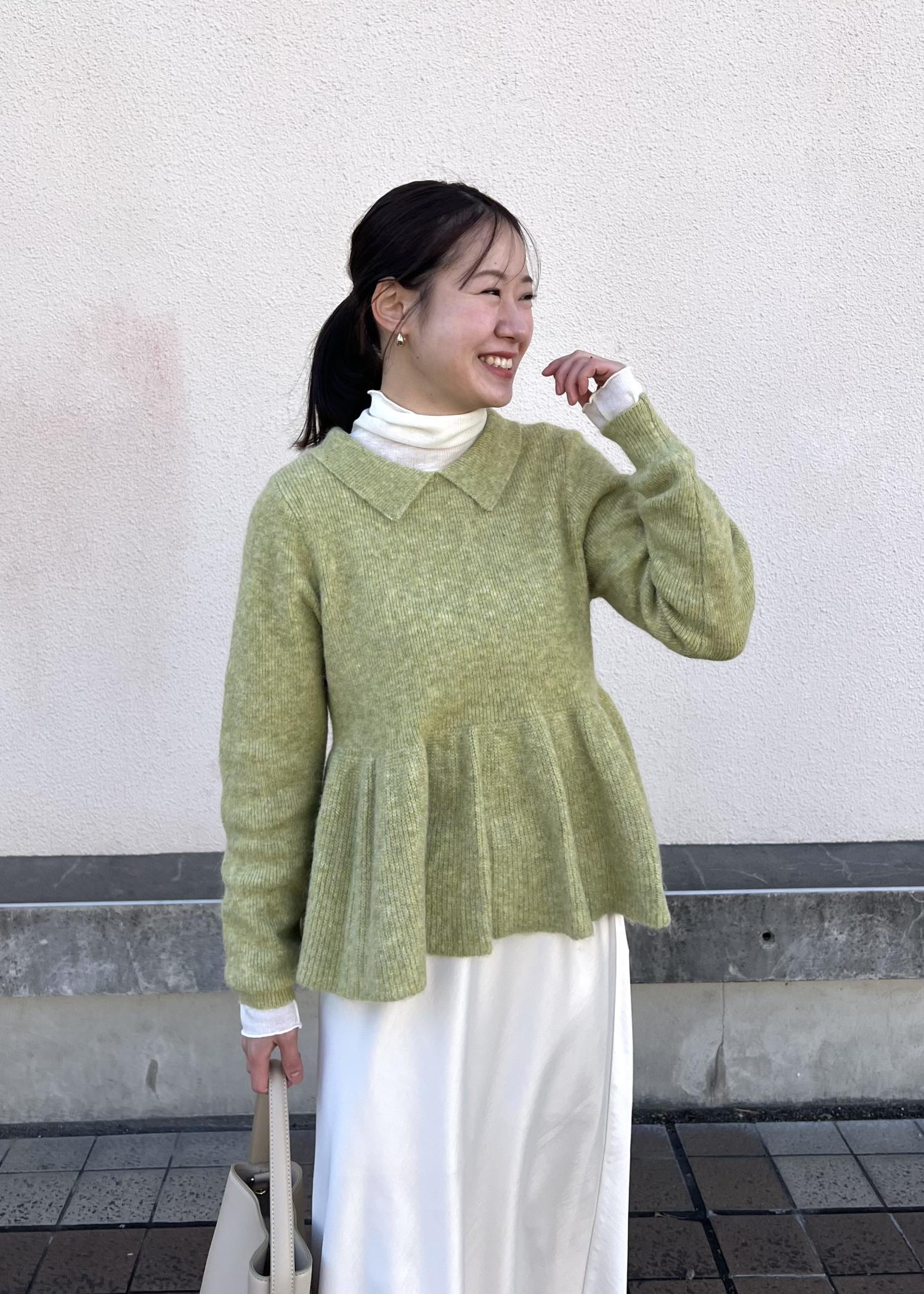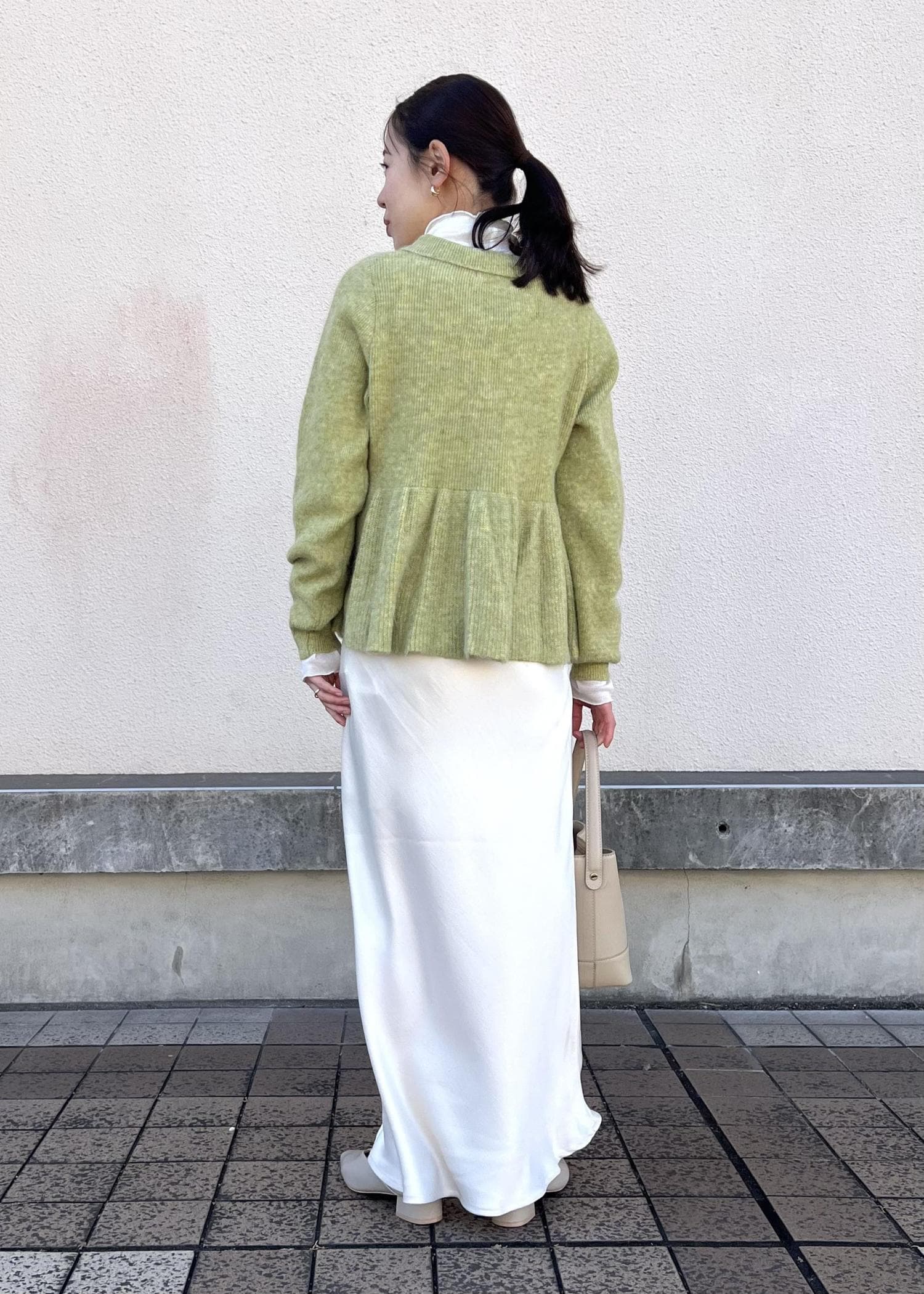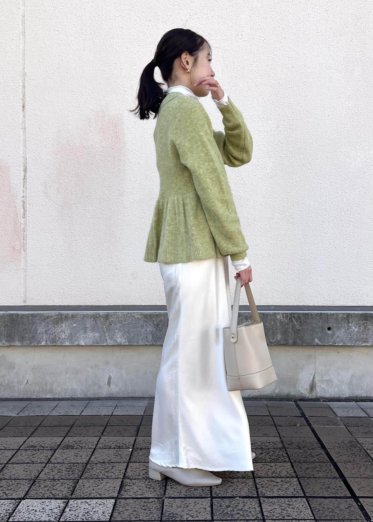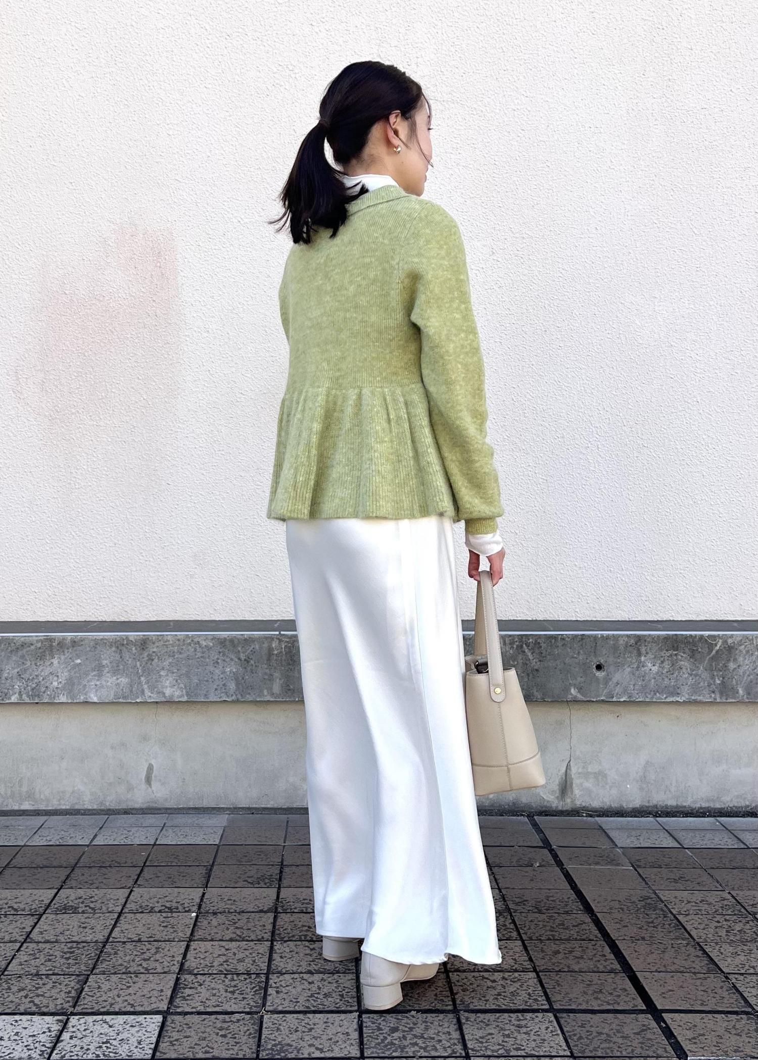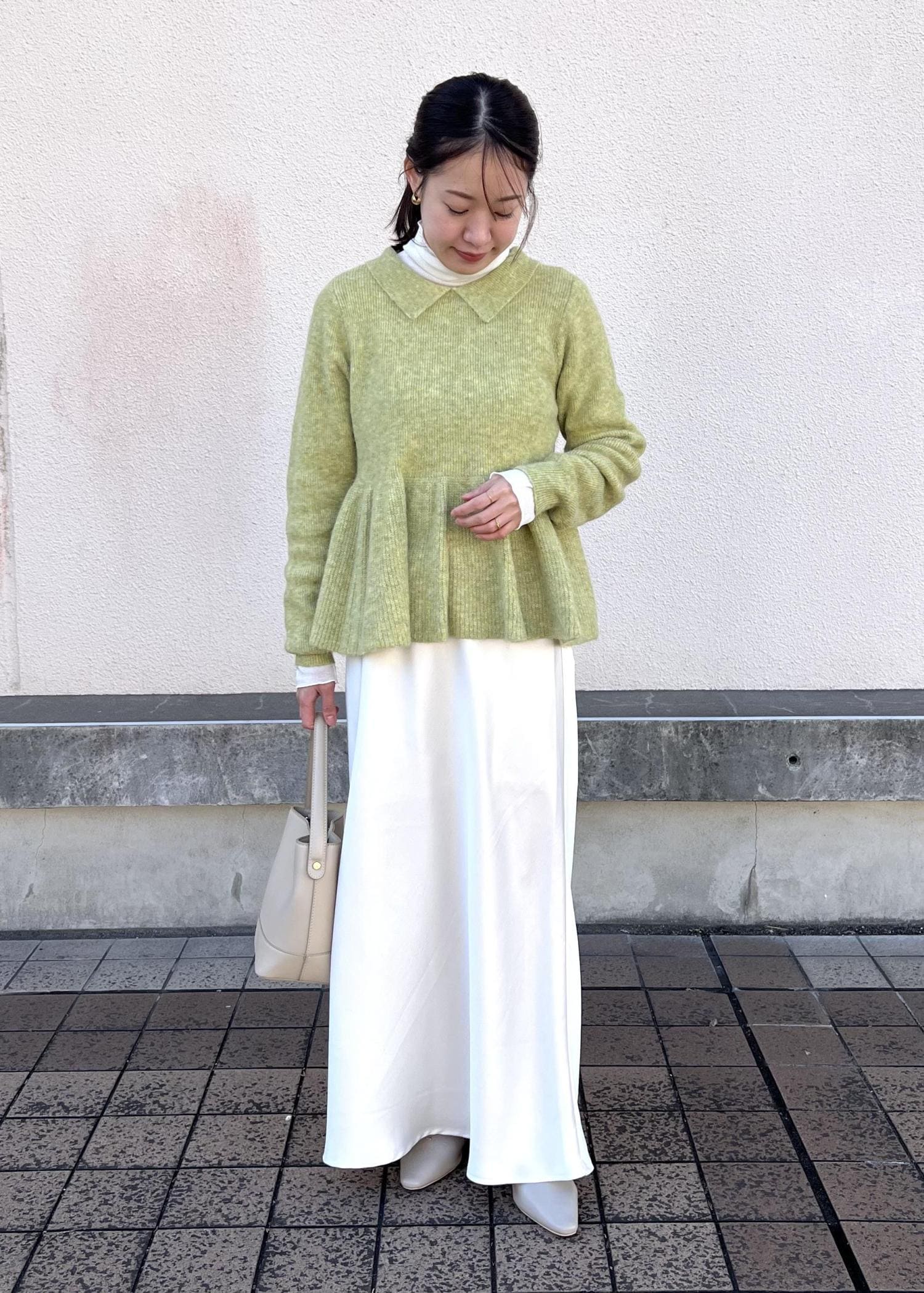 ペプラムニットに、ホワイトのスカートとインナーできれいめなコーディネートに!