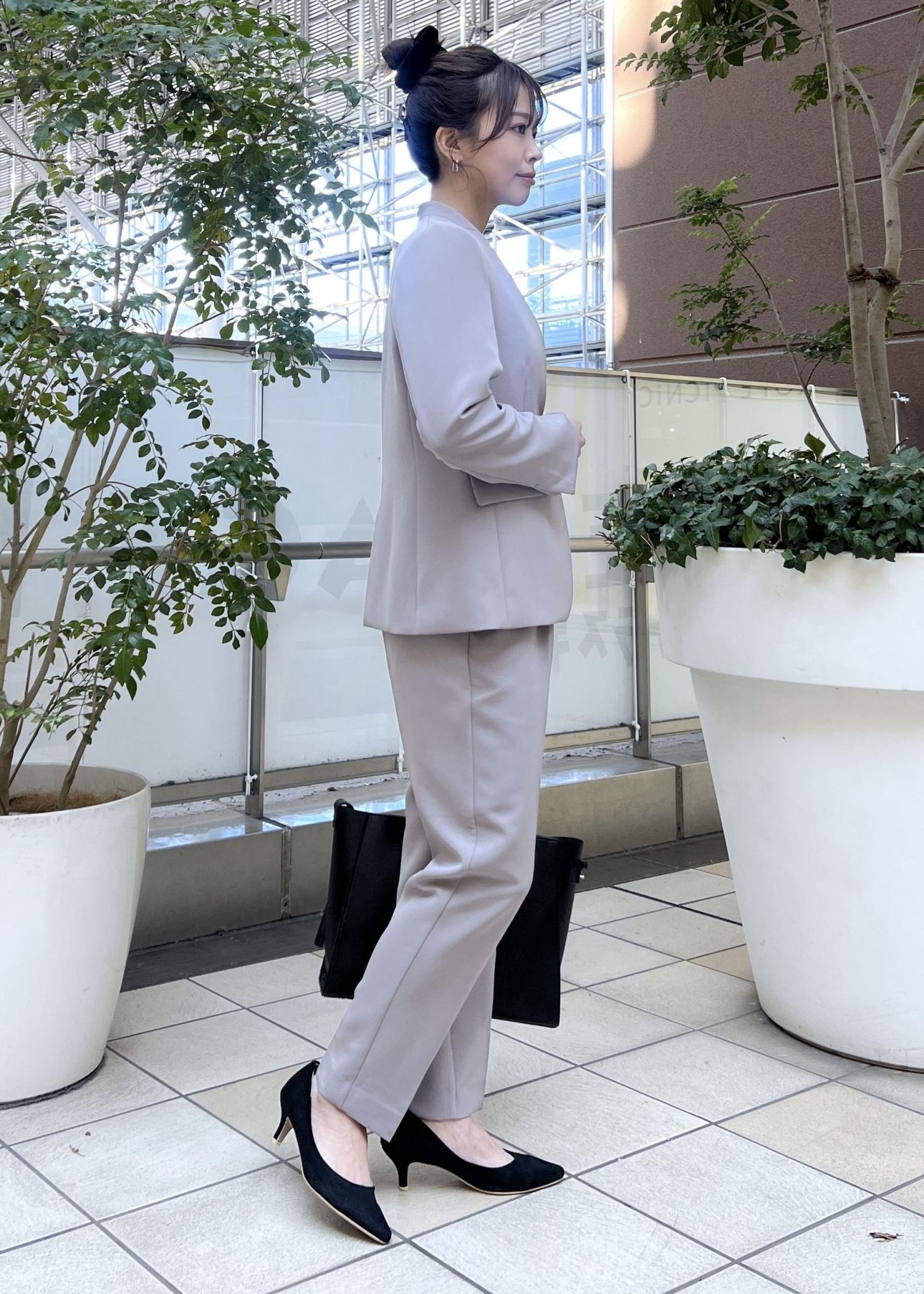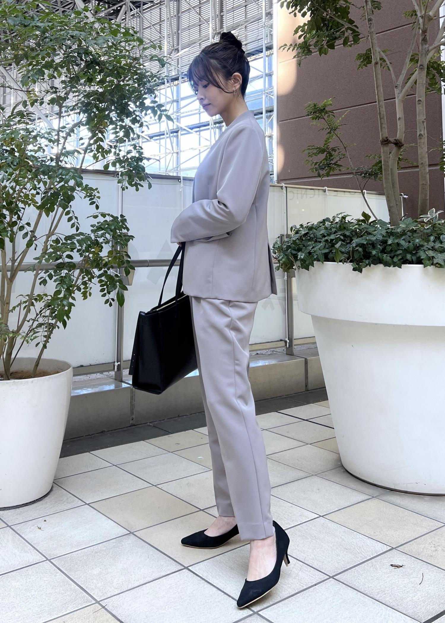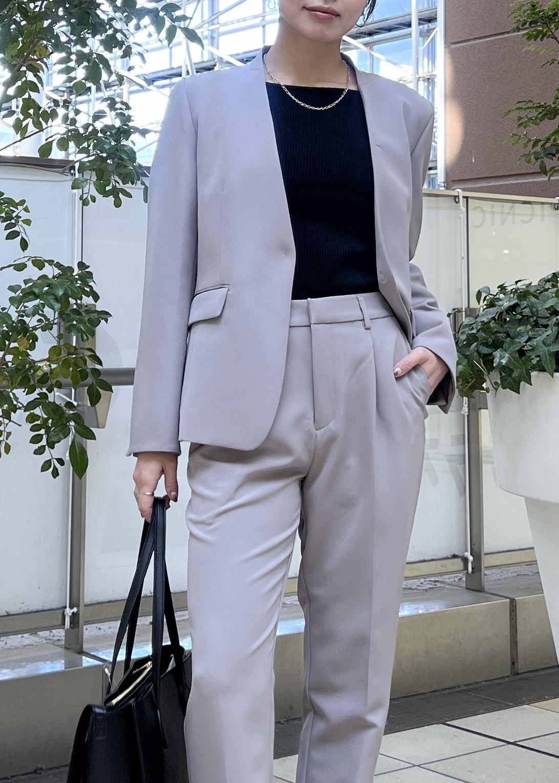 人気のウルトラストレッチシリーズのジャケットとテーパードパンツは、スッキリしたシルエットが綺麗めスタイルにぴったり。