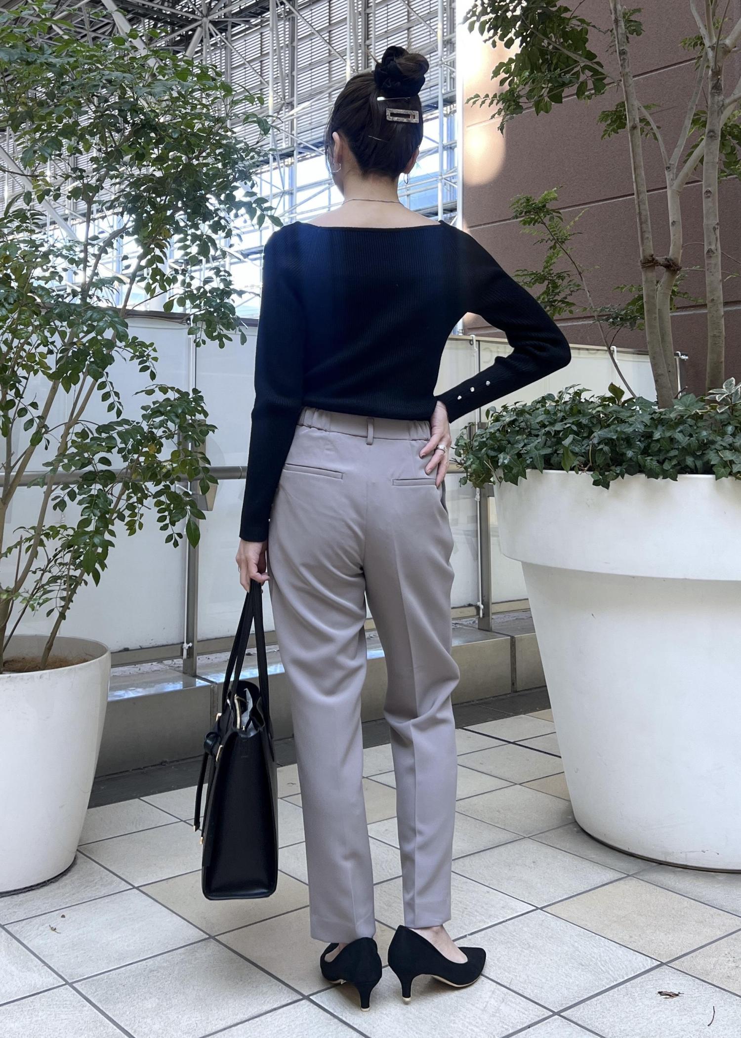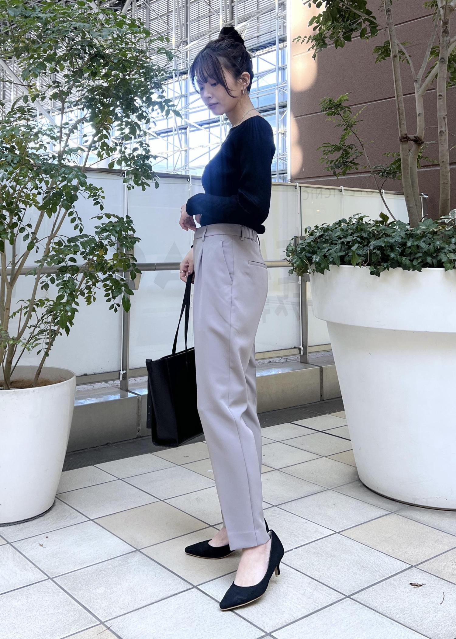 ベージュ系にはブラックを引き締めカラーに合わせて、お仕事などフォーマルなシーンに着られるコーデにしました。