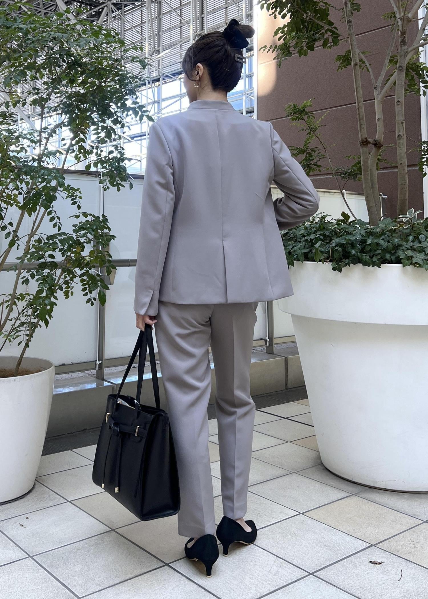 ストレッチ性の高いジャケットとパンツのセットアップは、通勤コーデにおすすめ。