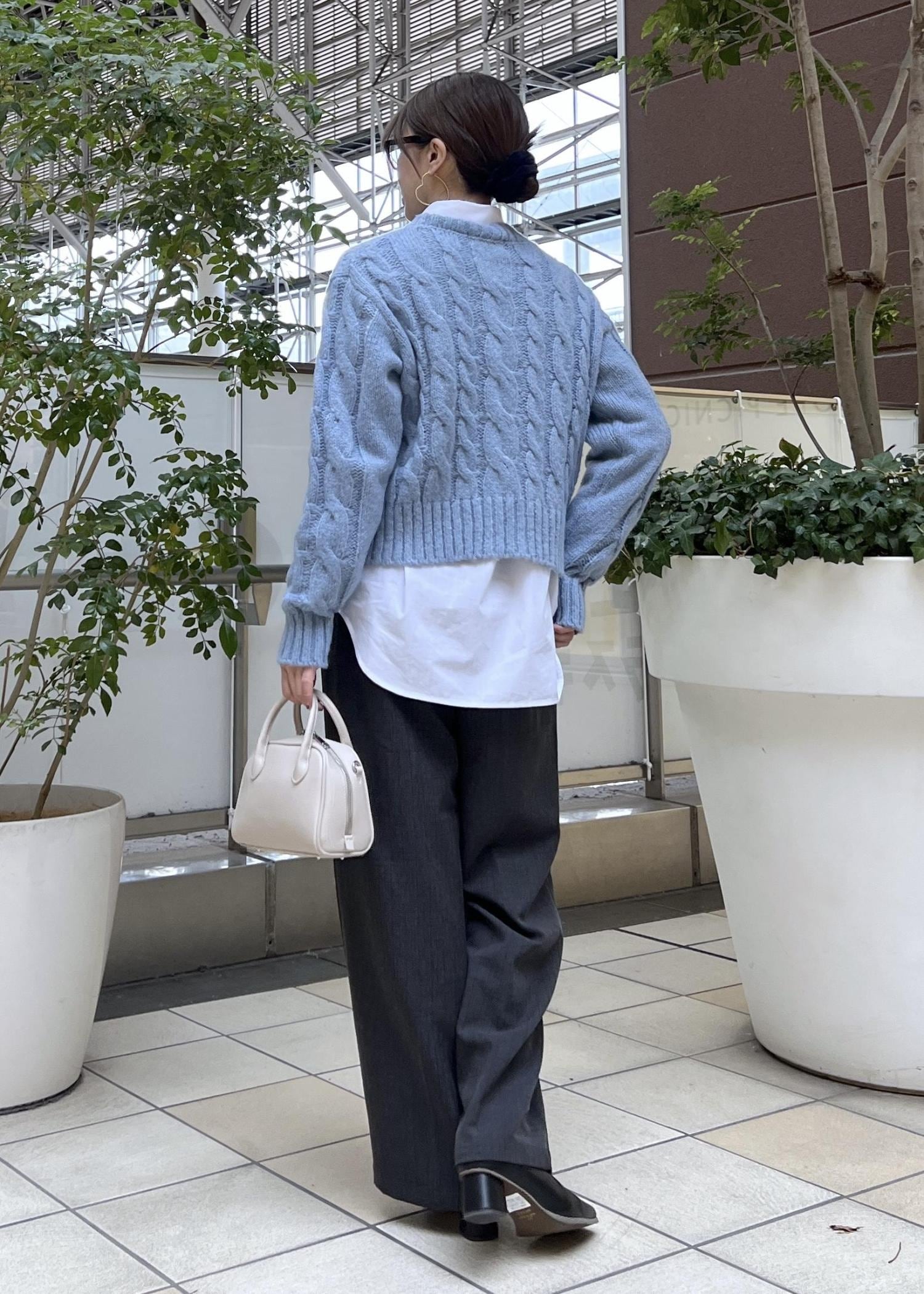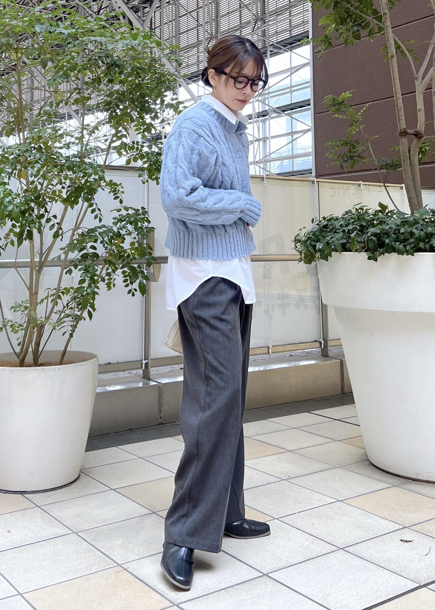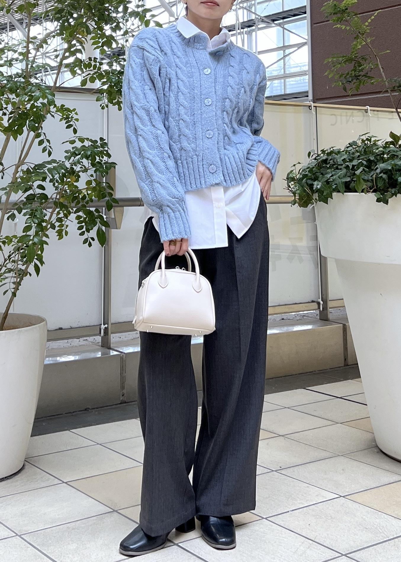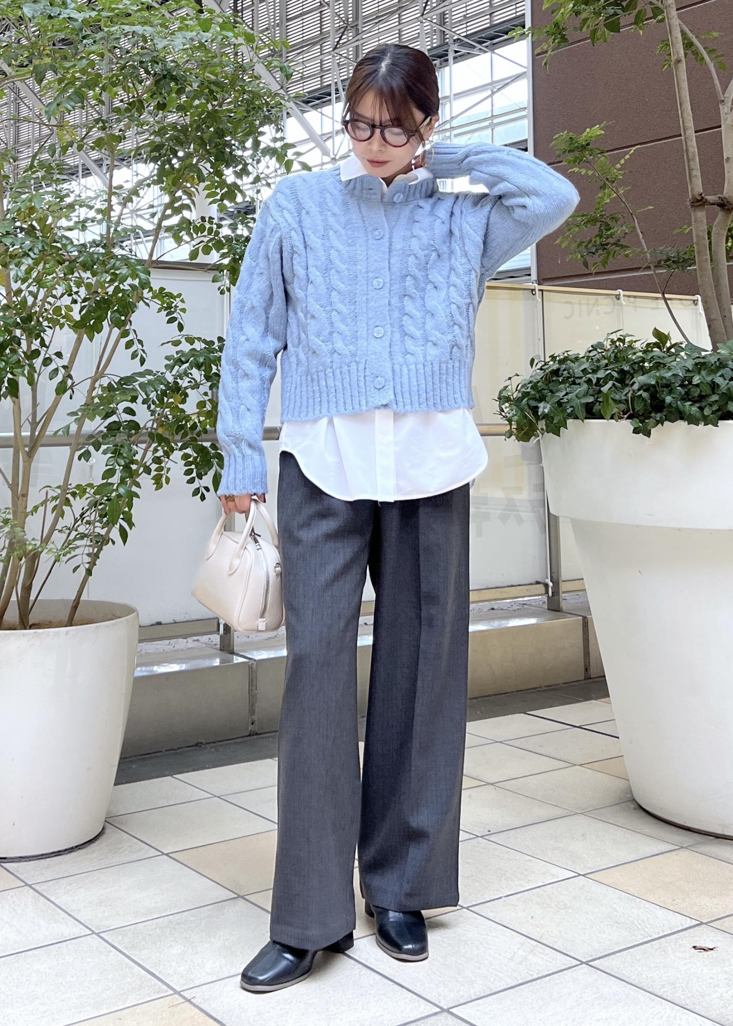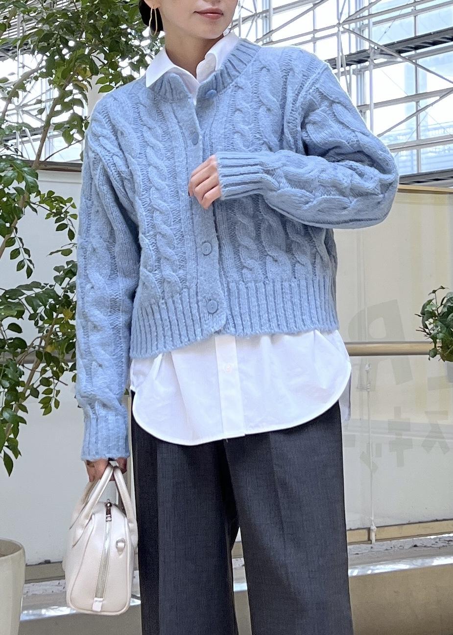 ふんわり厚みのあるケーブル編みのカーディガンは、シャツをレイヤードしてカジュアルコーデに。