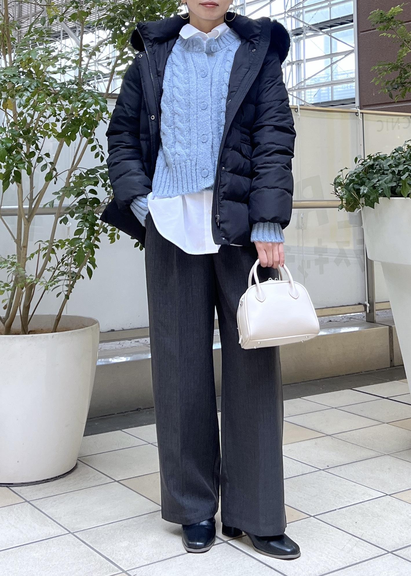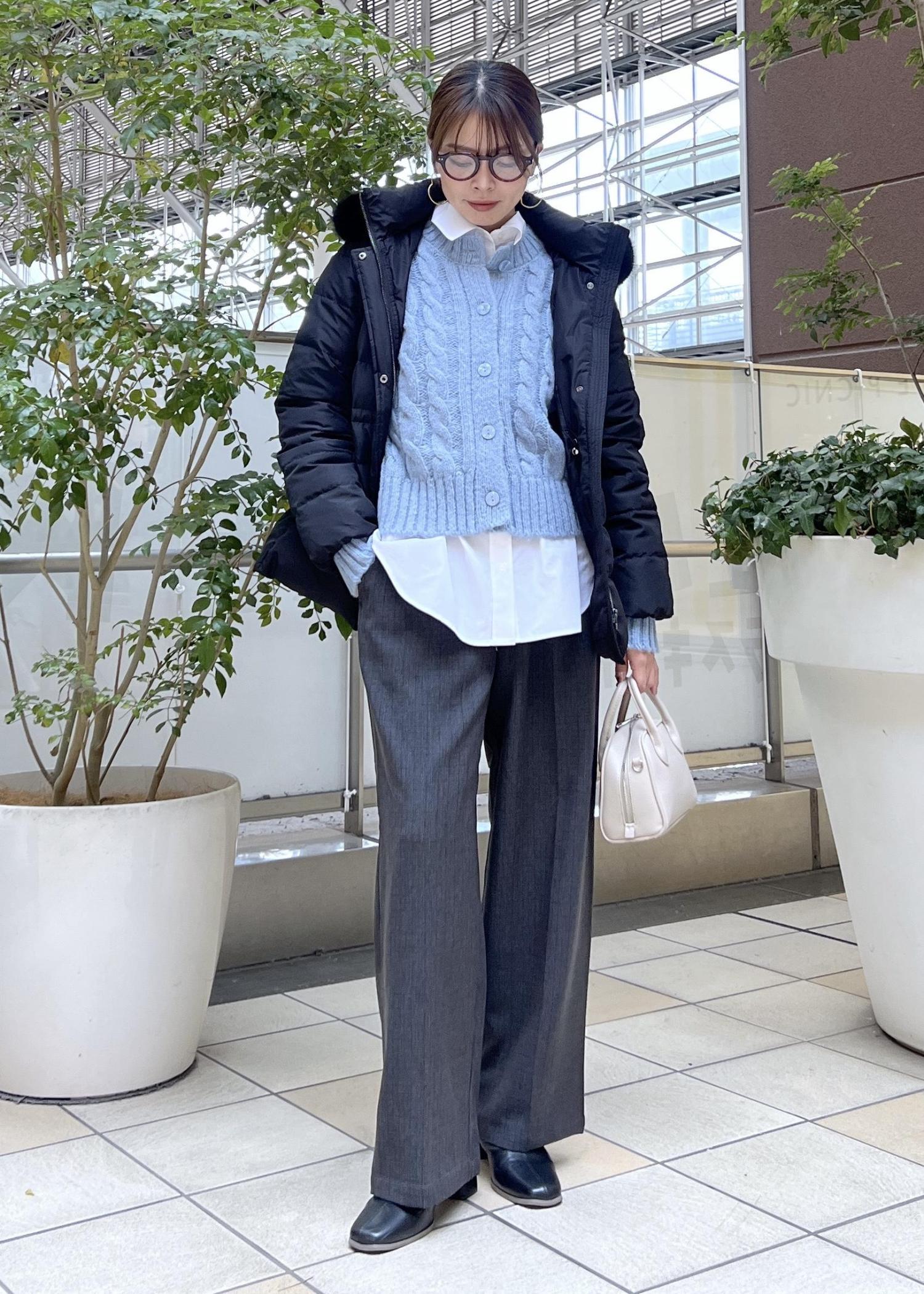 ニットカーディガンとシャツの重ね着でしっかり防寒も兼ねた、レイヤードコーデにしました。