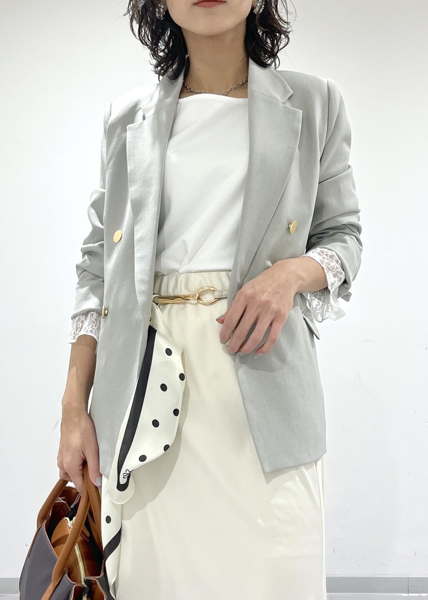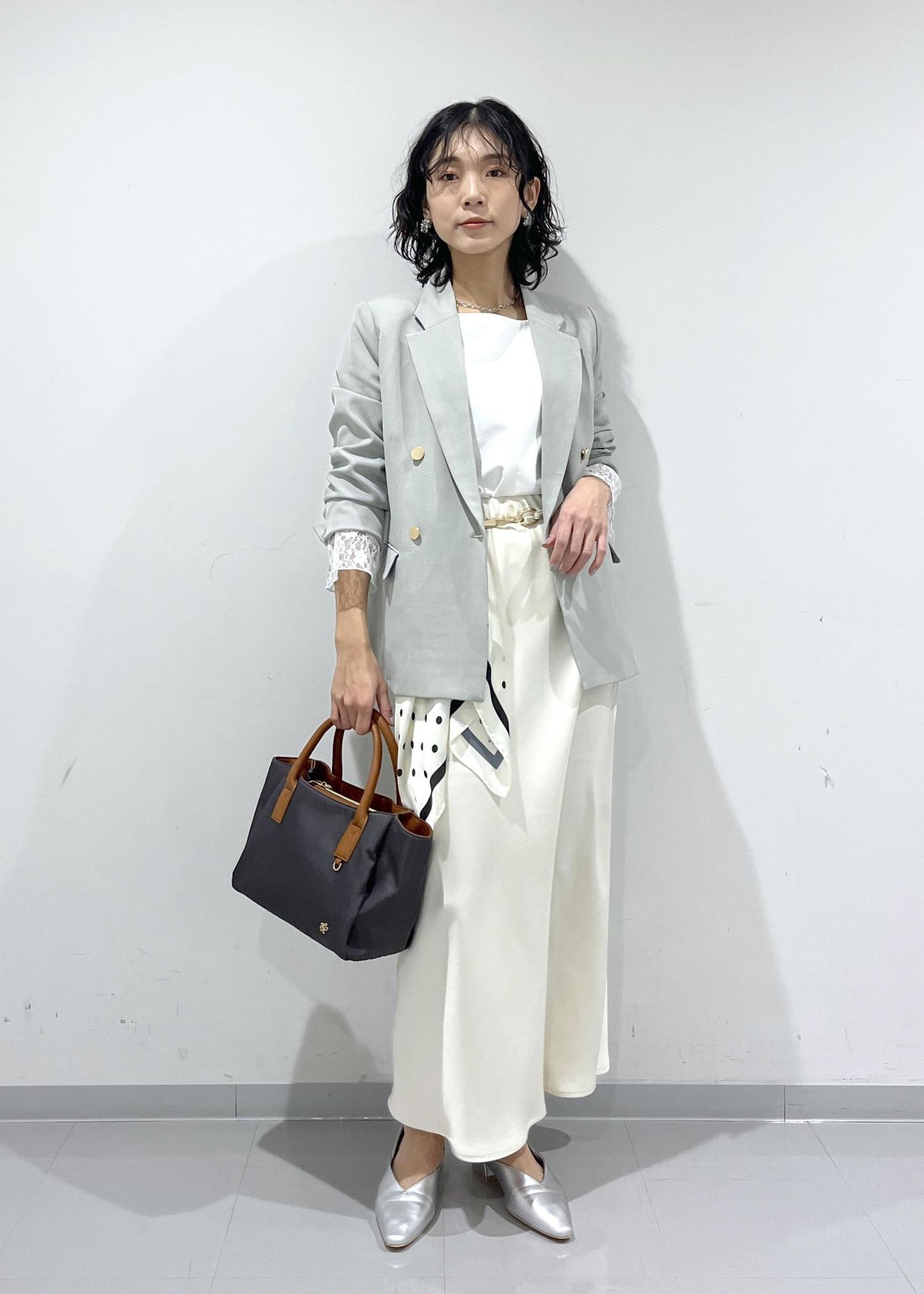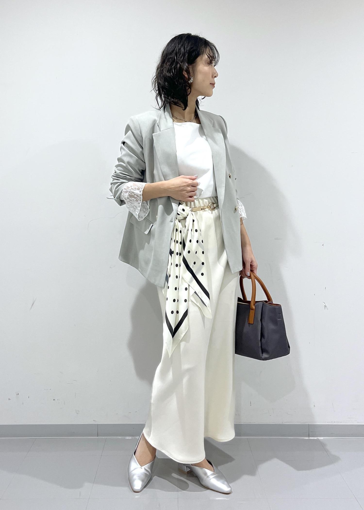 ちらっと見える黒のドットスカーフで程よく引き締め効果も。
