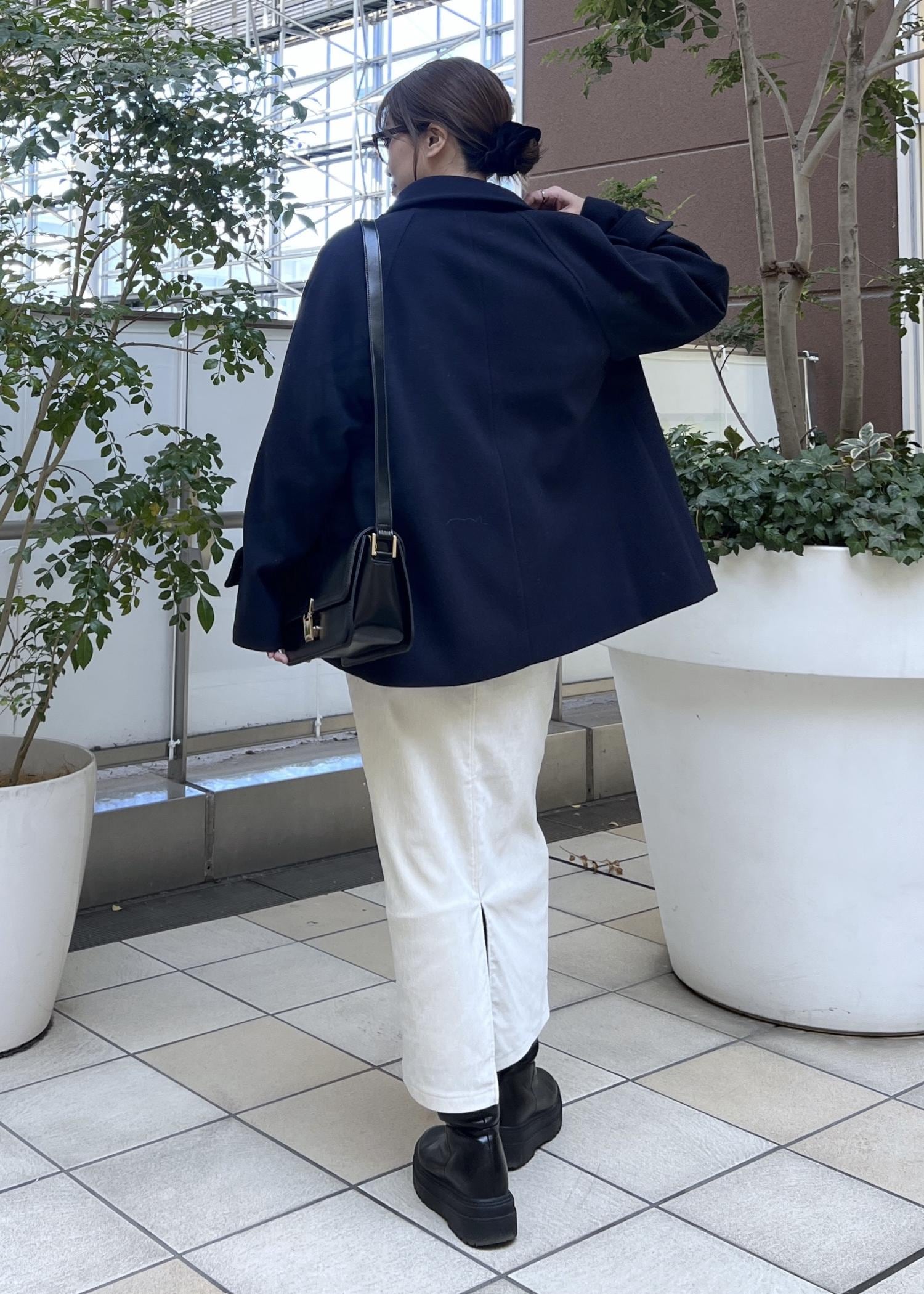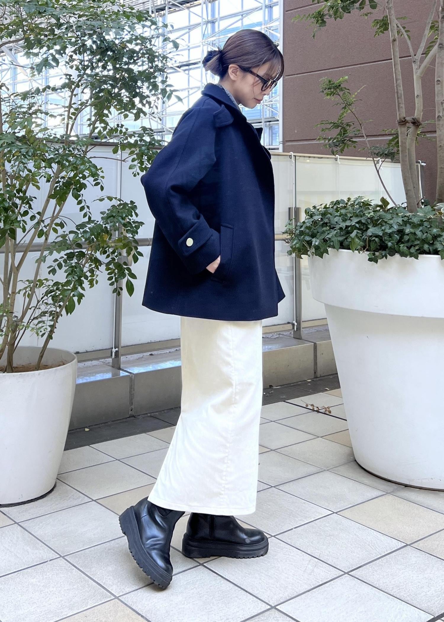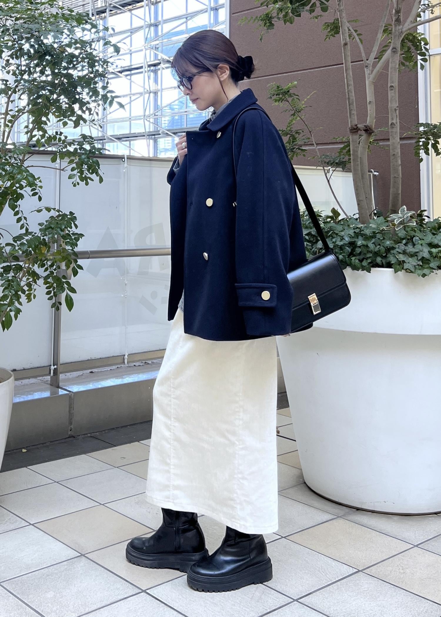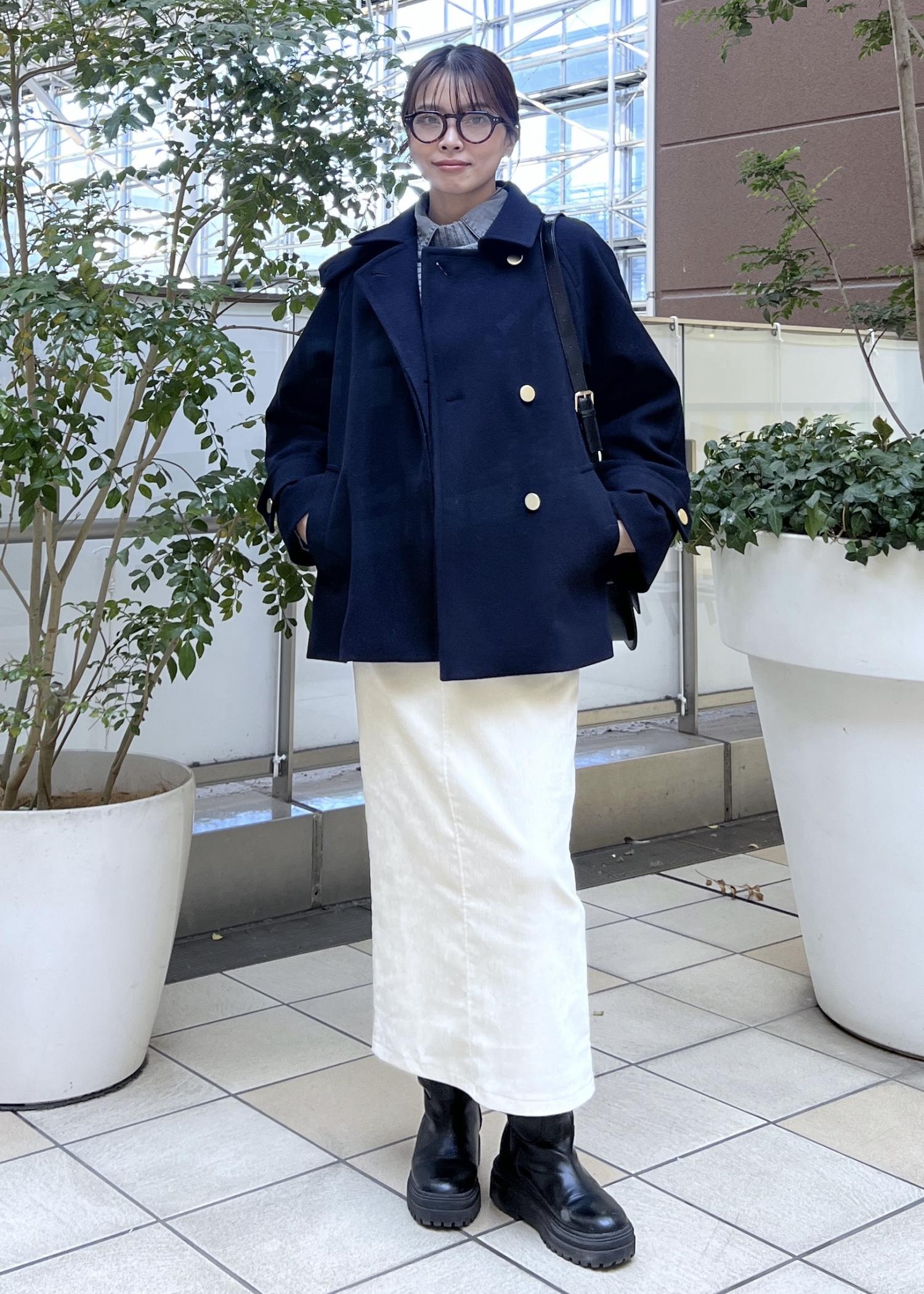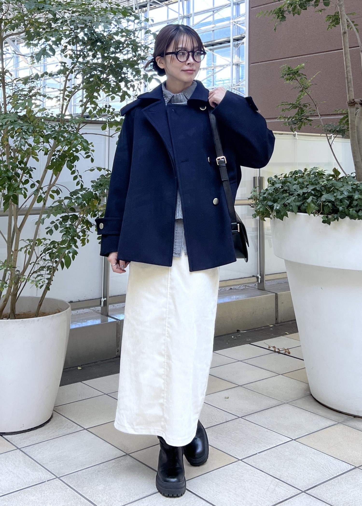 大人カジュアルなコーデにぴったりのネイビーのコートは、さりげない金ボタンがコーデのワンポイントに。