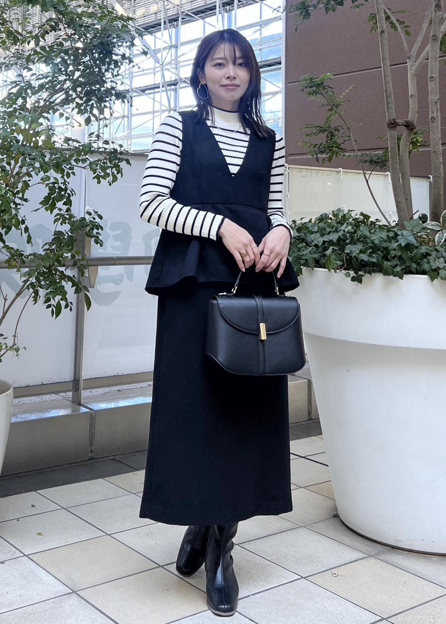 ブラックにはボーダーのトップスをインして、きれいめカジュアルコーデにしました。