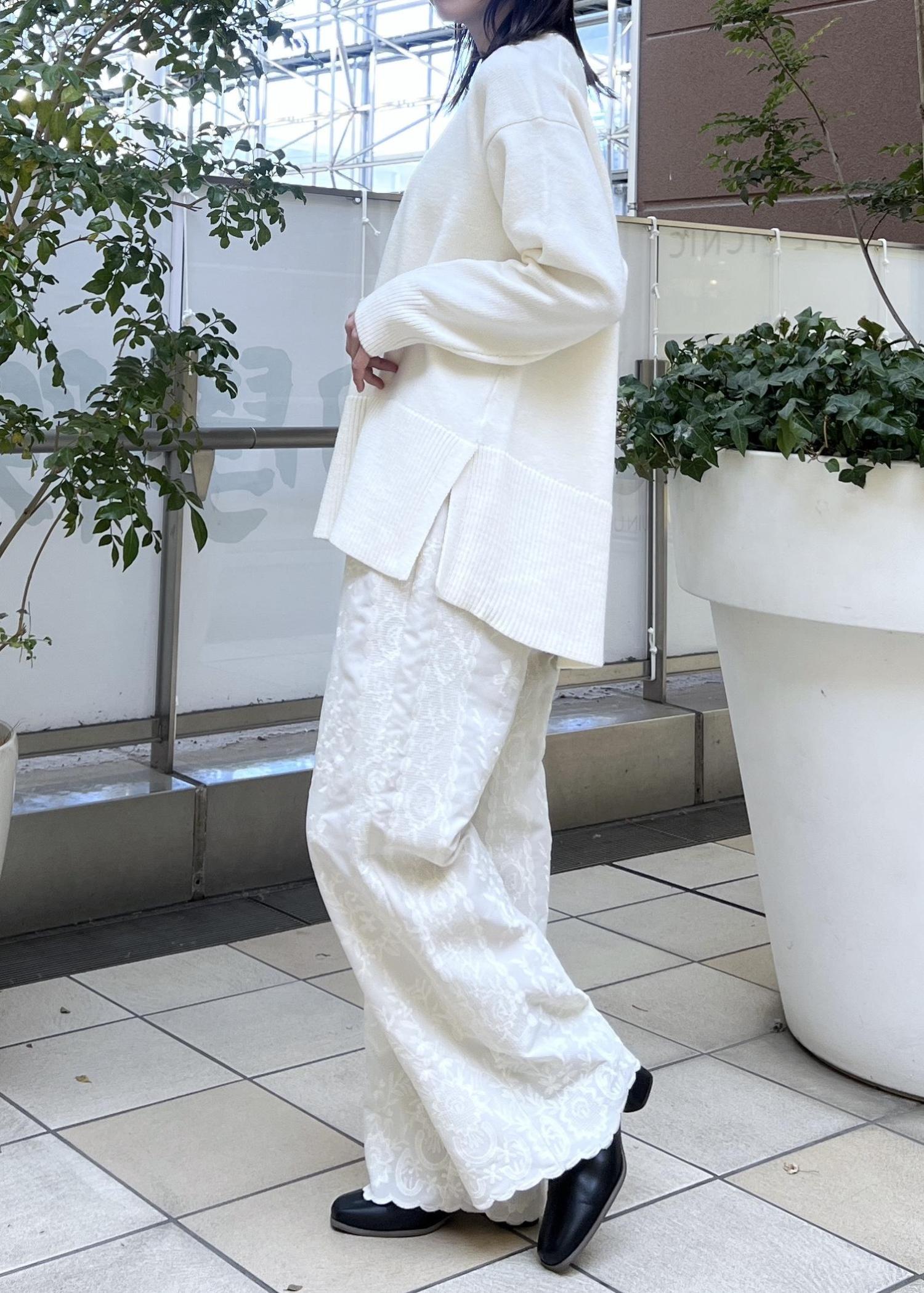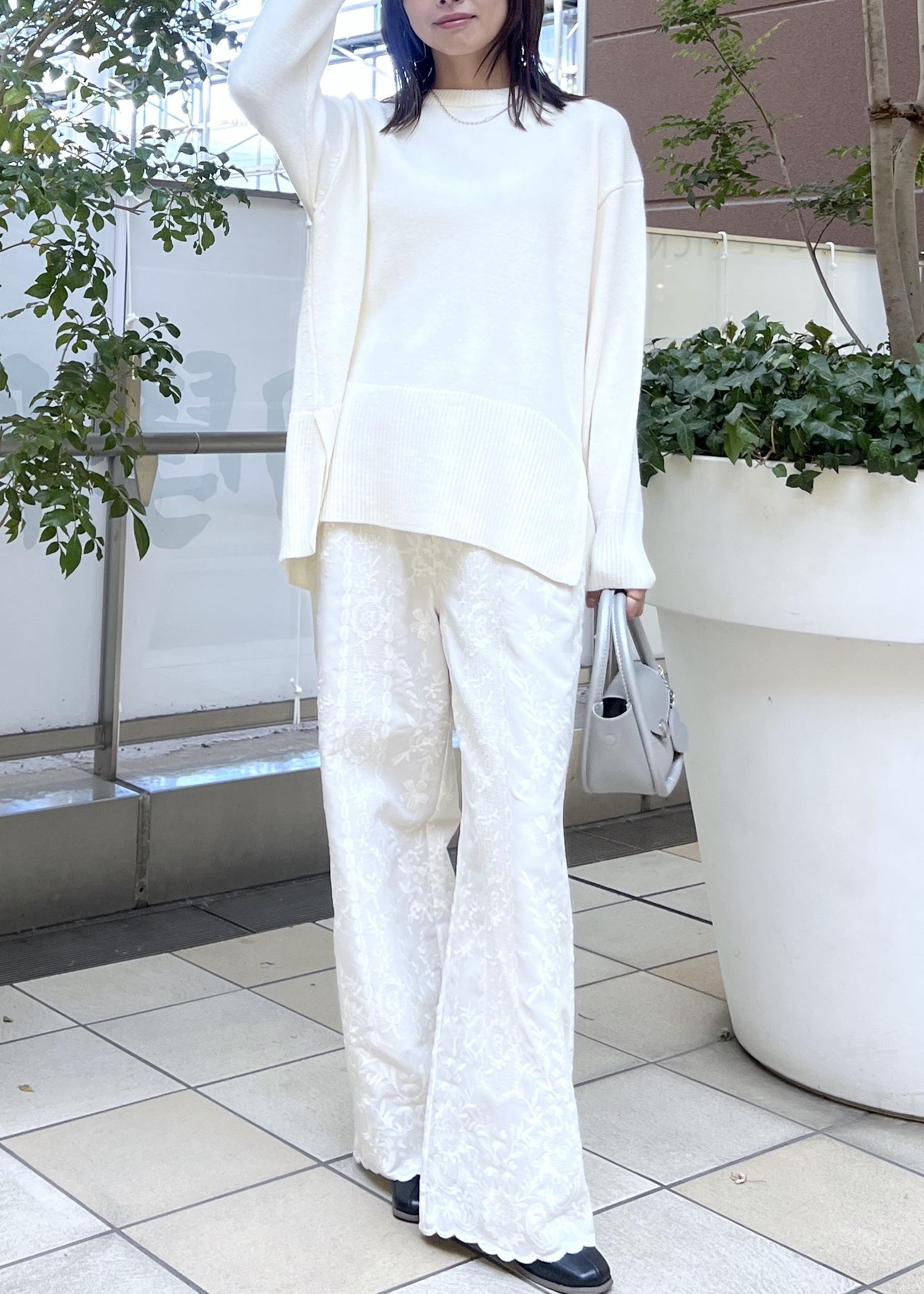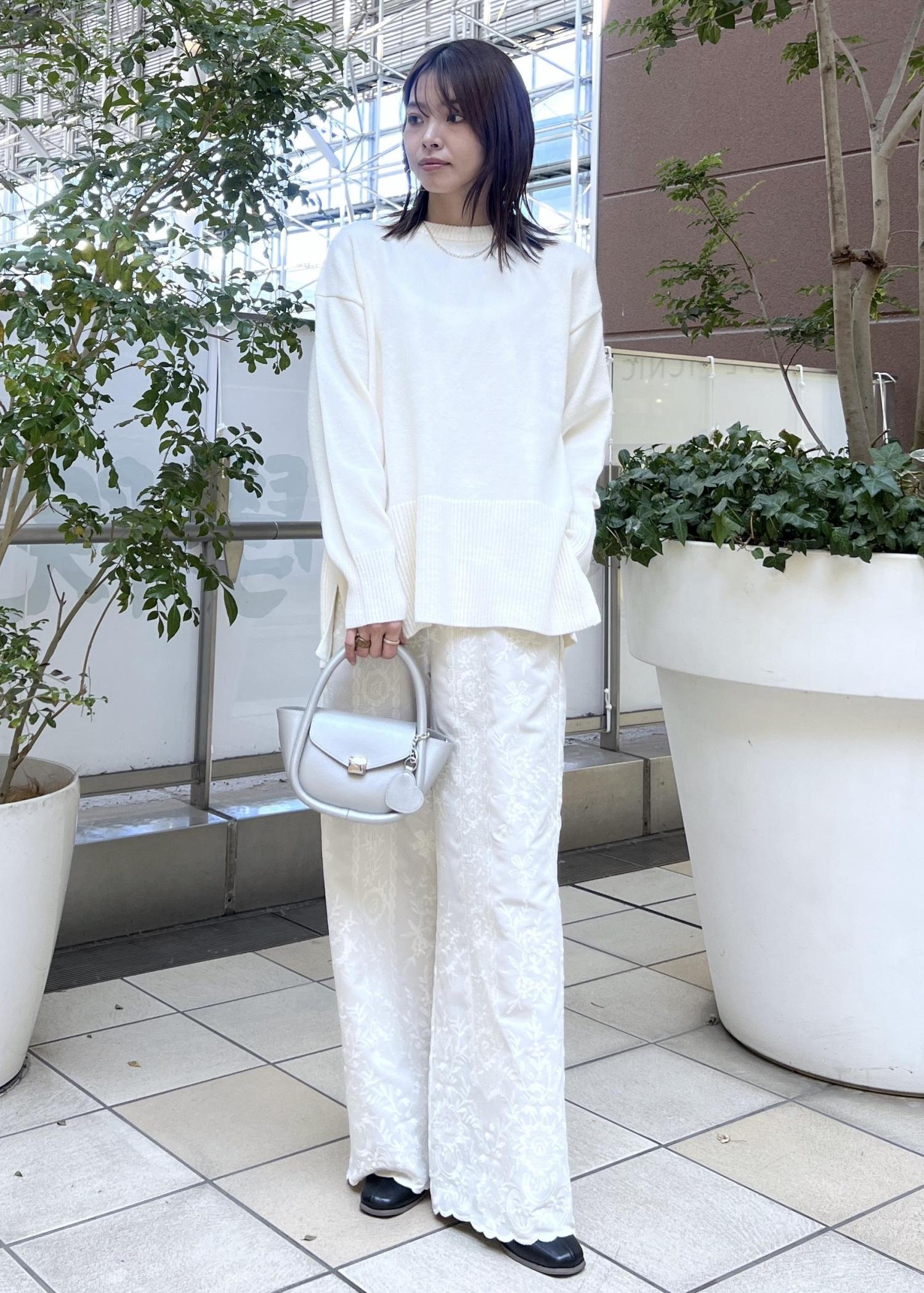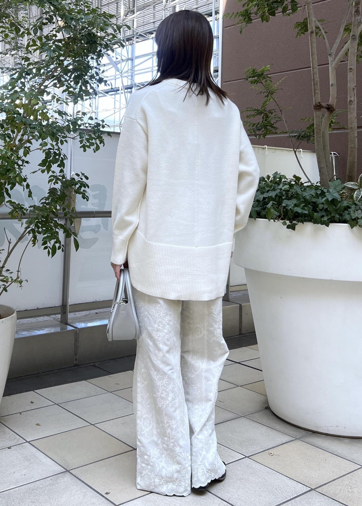 ゆるっと楽ちんな白ニットは、着丈の選べるシリーズでヒップにかかる長さは安心感のある丈感。
