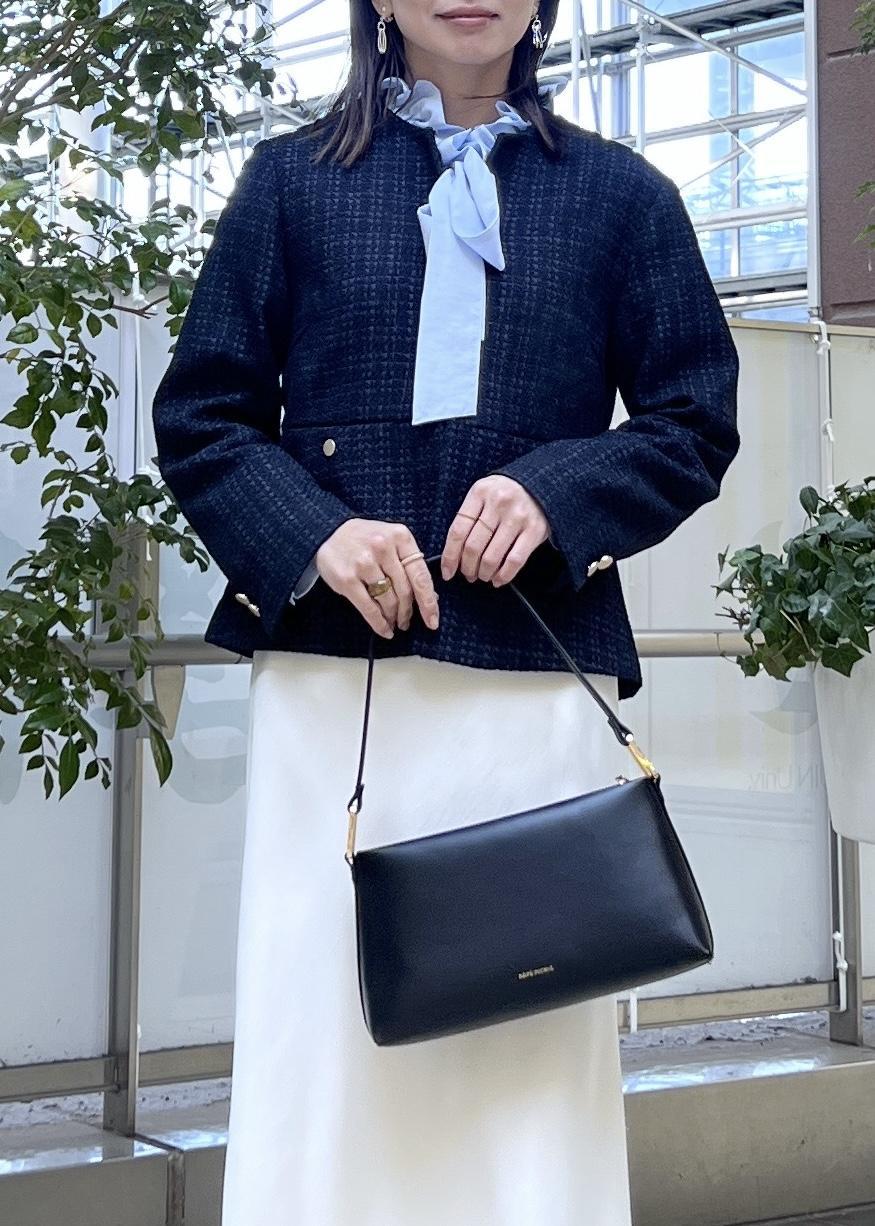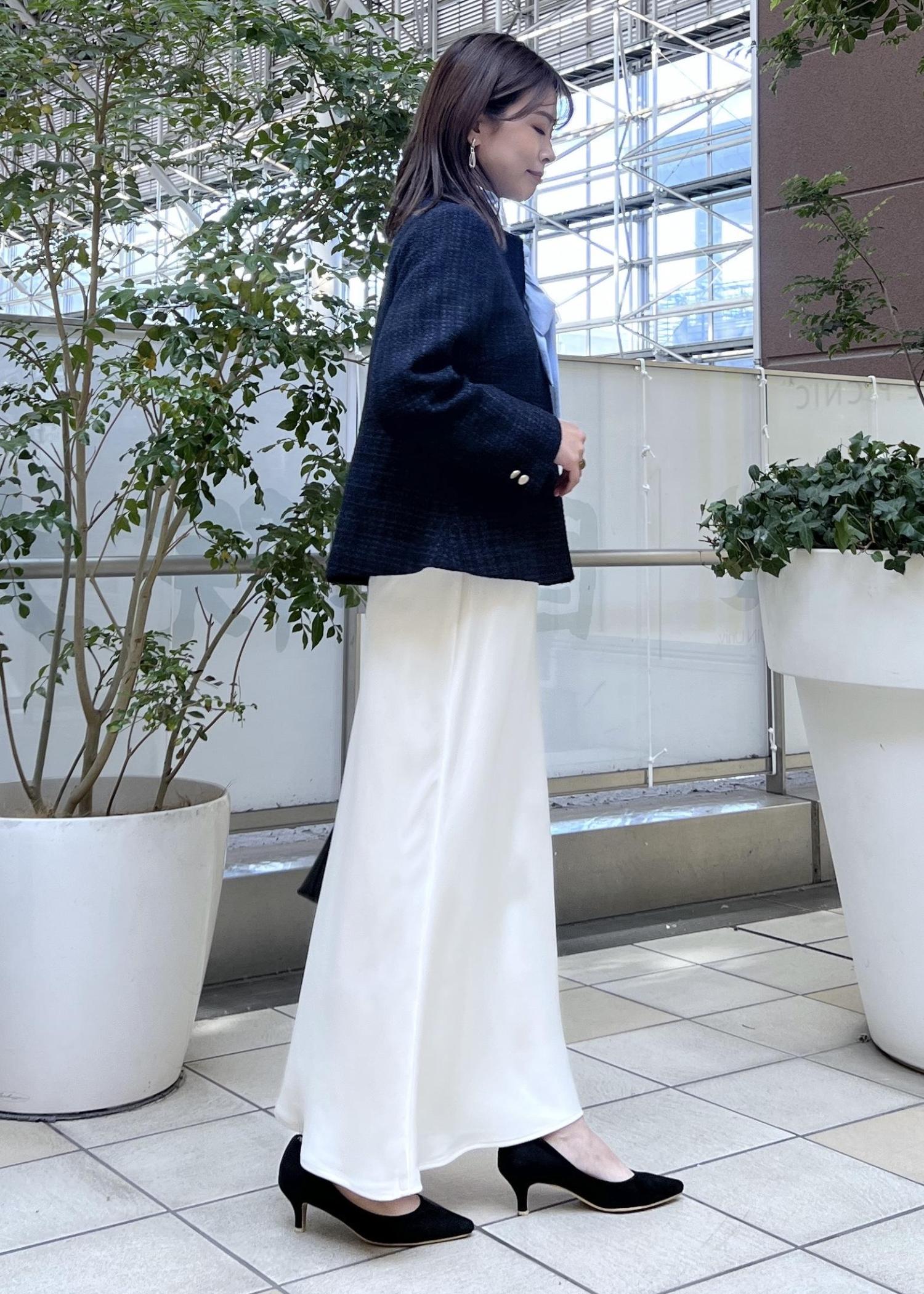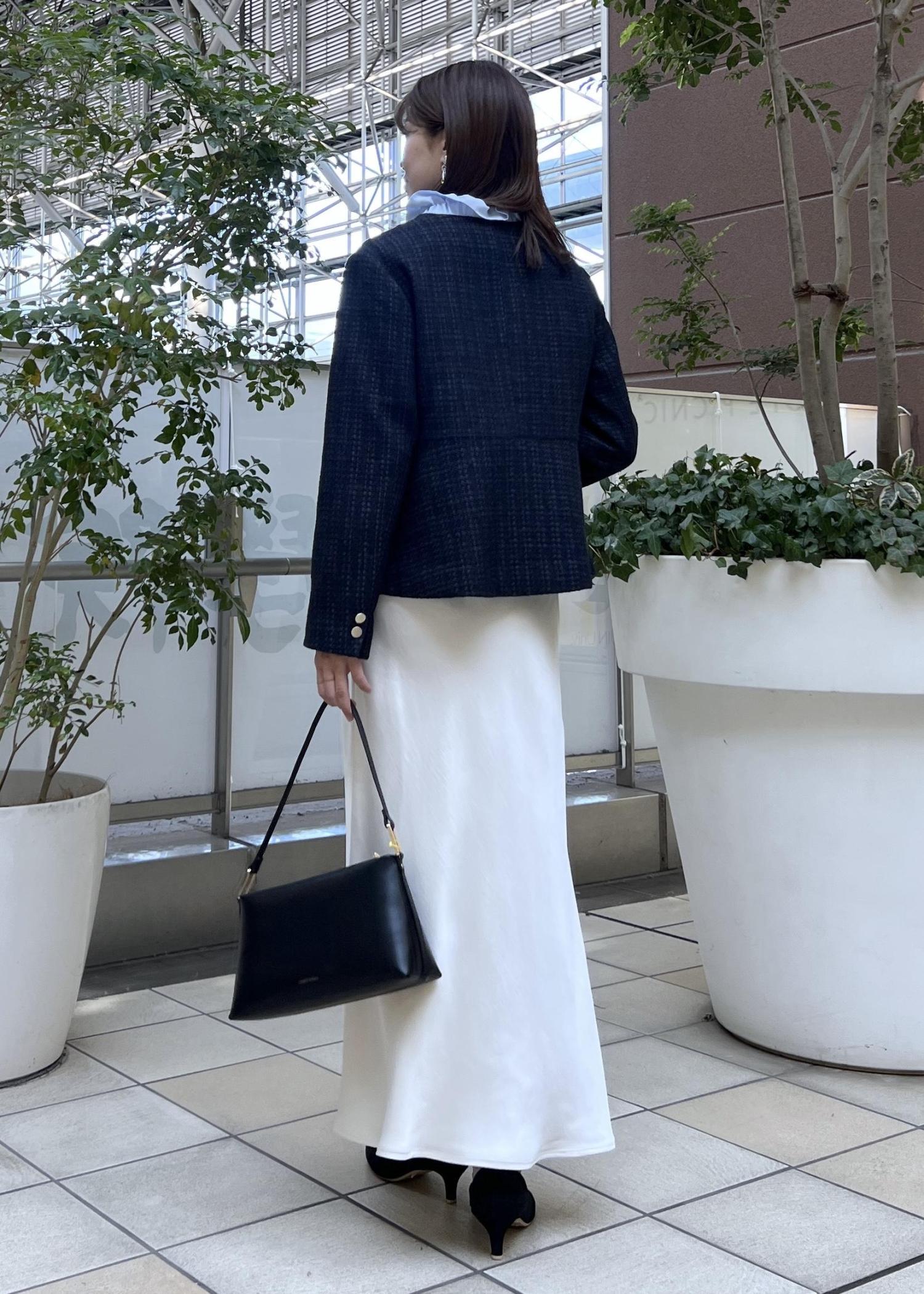 広がりすぎないぺプラムシルエットが綺麗なツイードジャケットは、スカートに合わせても◎。