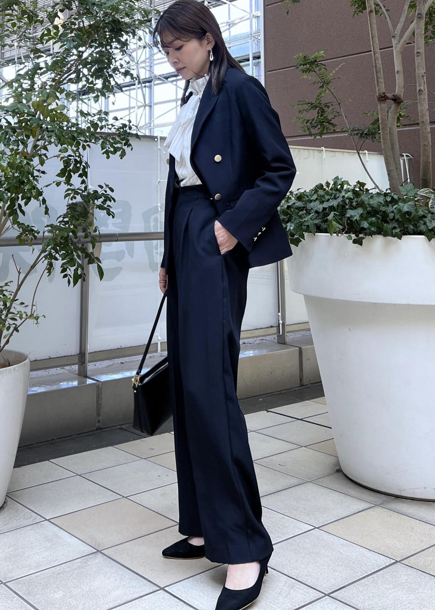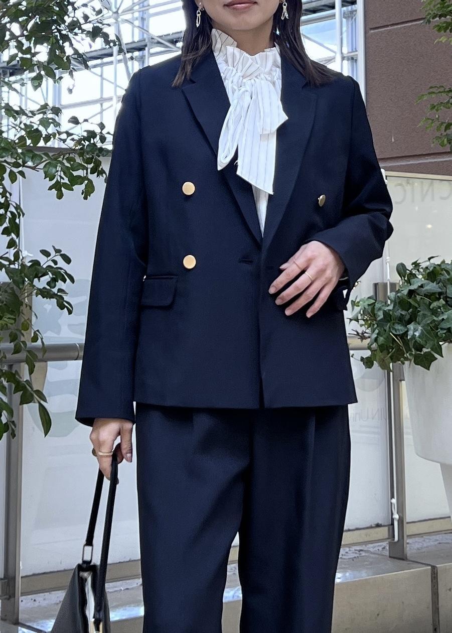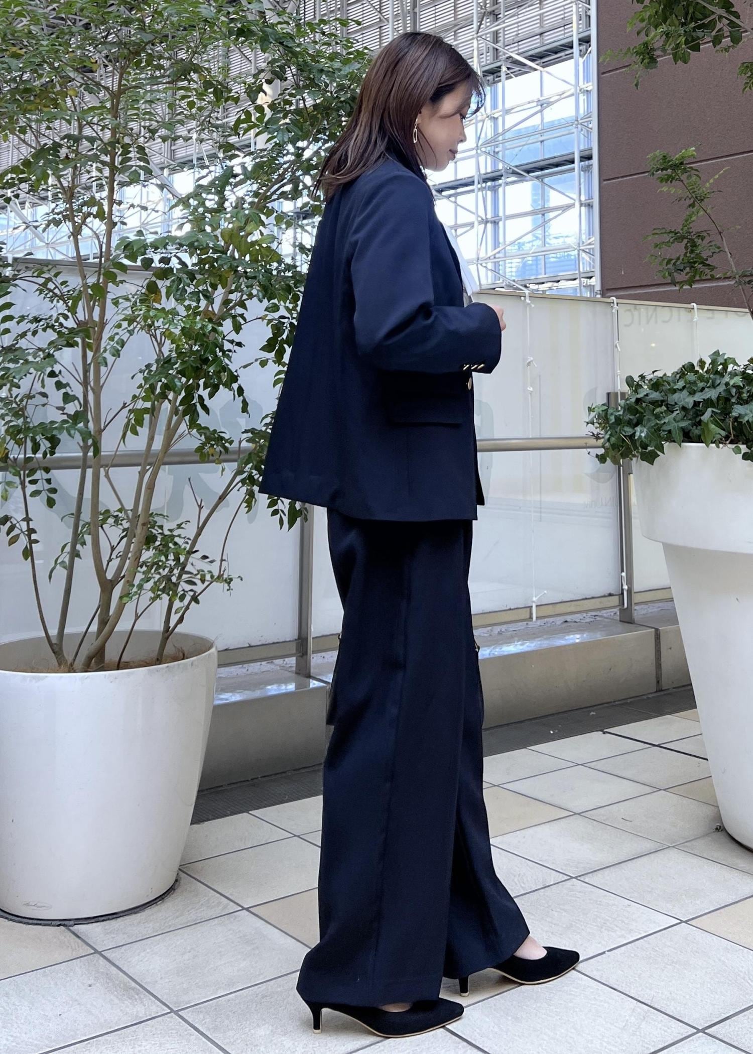 サラッと着やすいジャケットは同素材のパンツを合わせてきれいめスタイルに。