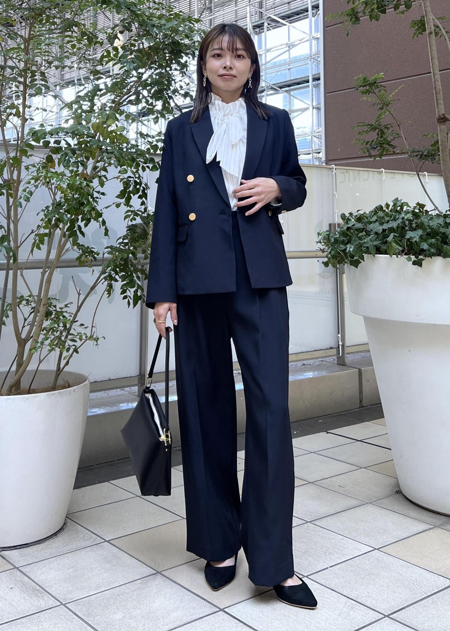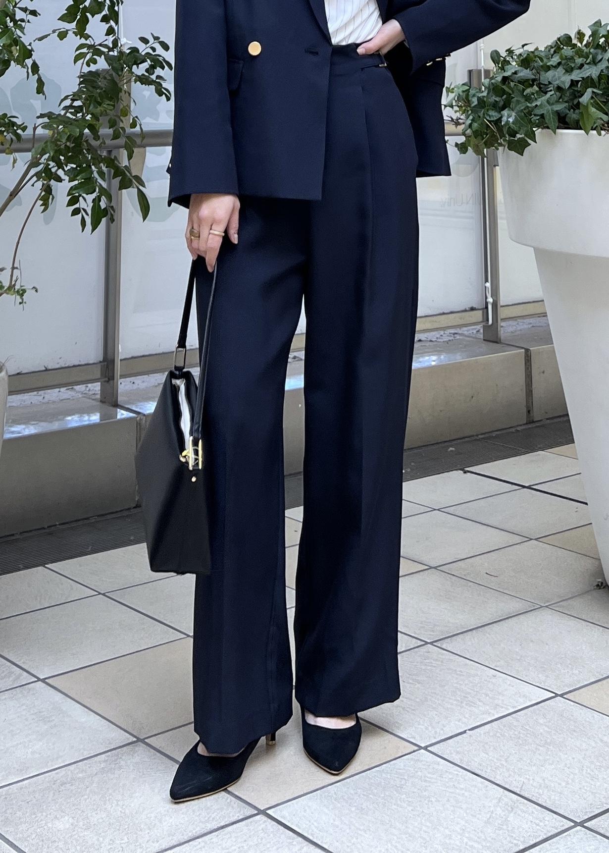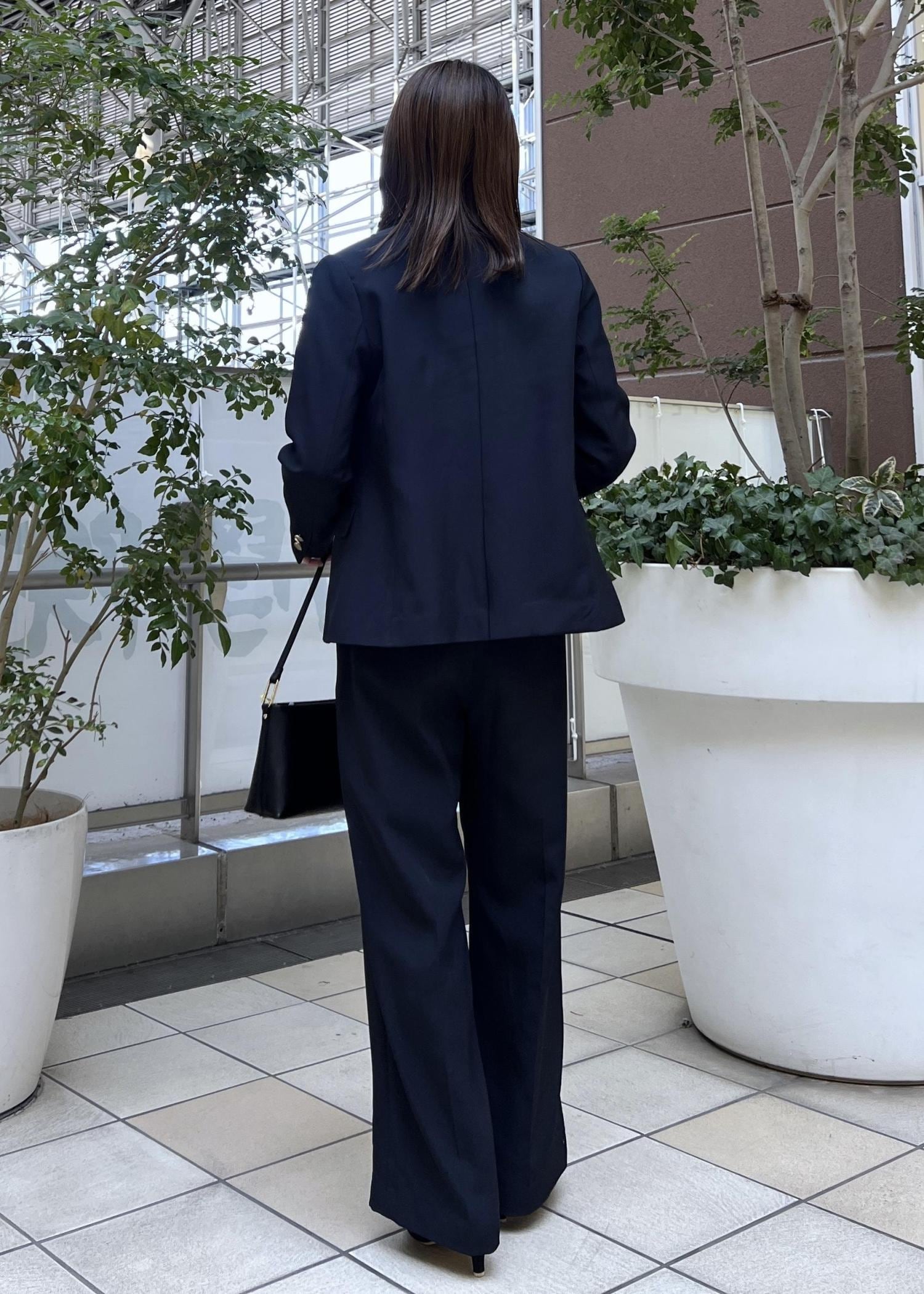 サラッと着やすいジャケットは同素材のパンツを合わせてきれいめスタイルに。