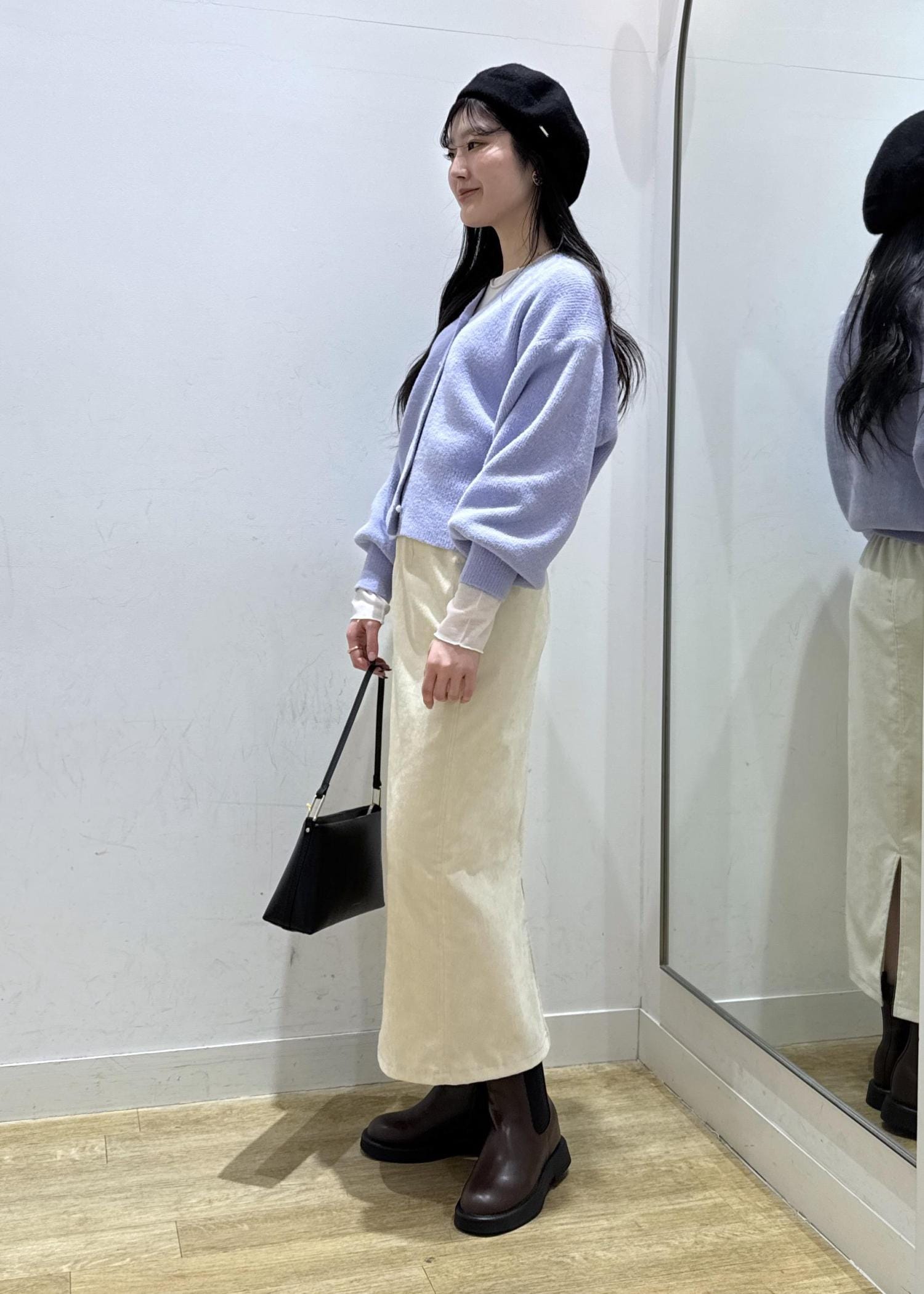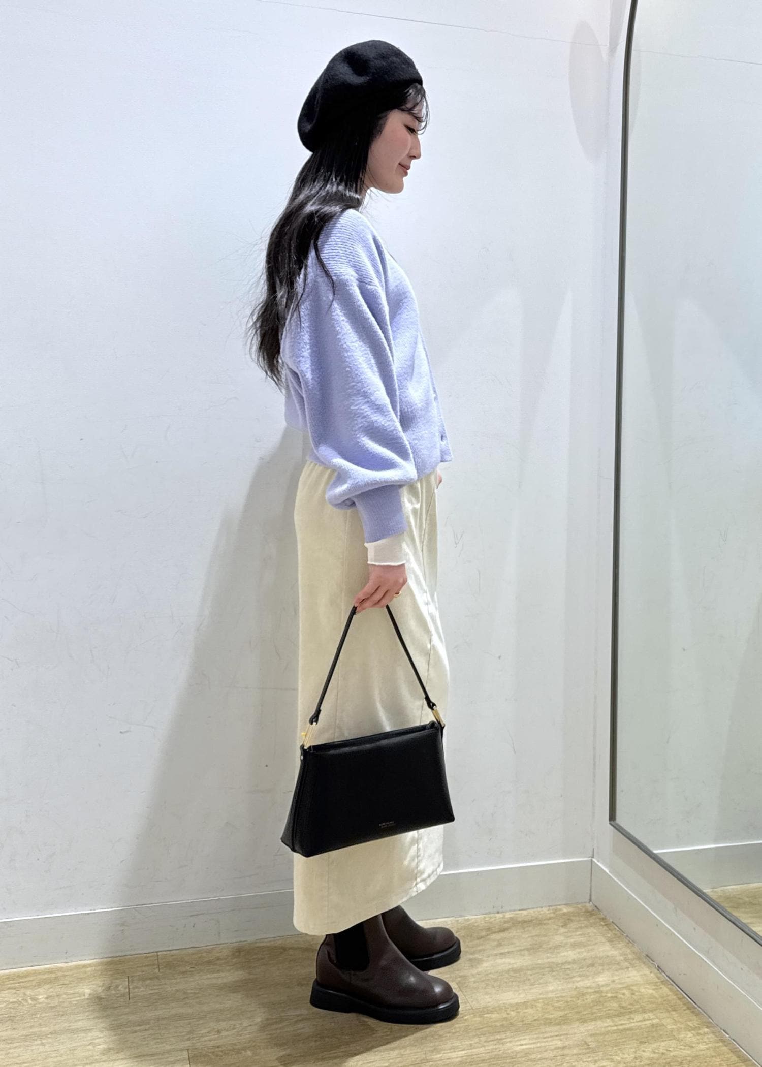 パステルラベンダーとアイボリーカラーで柔らかい女性らしいコーディネートを組んでみました。