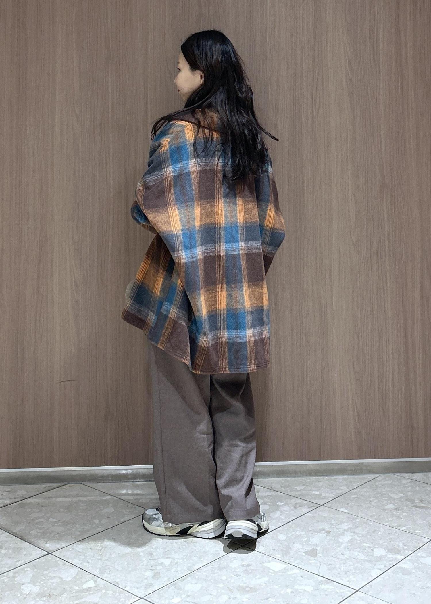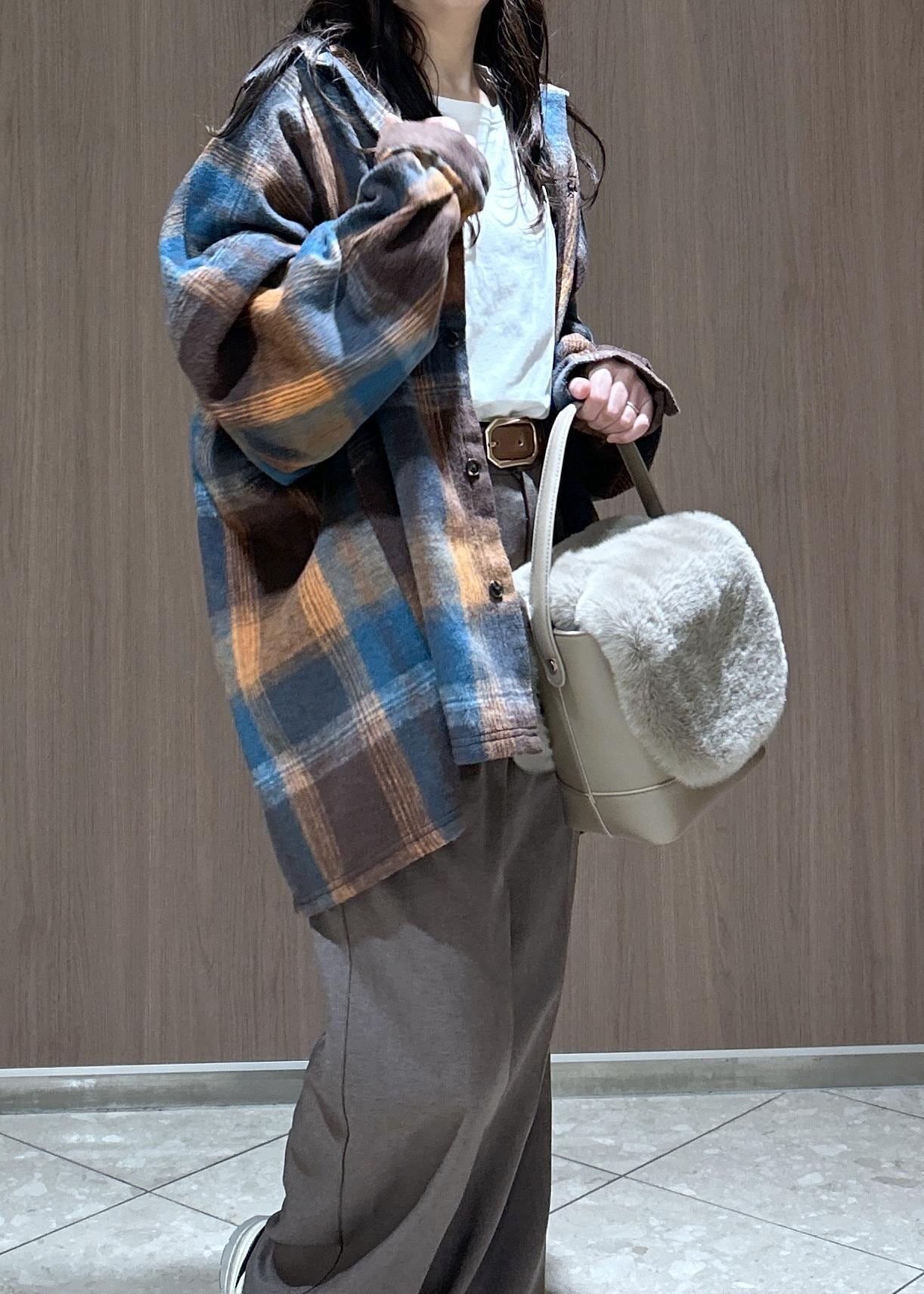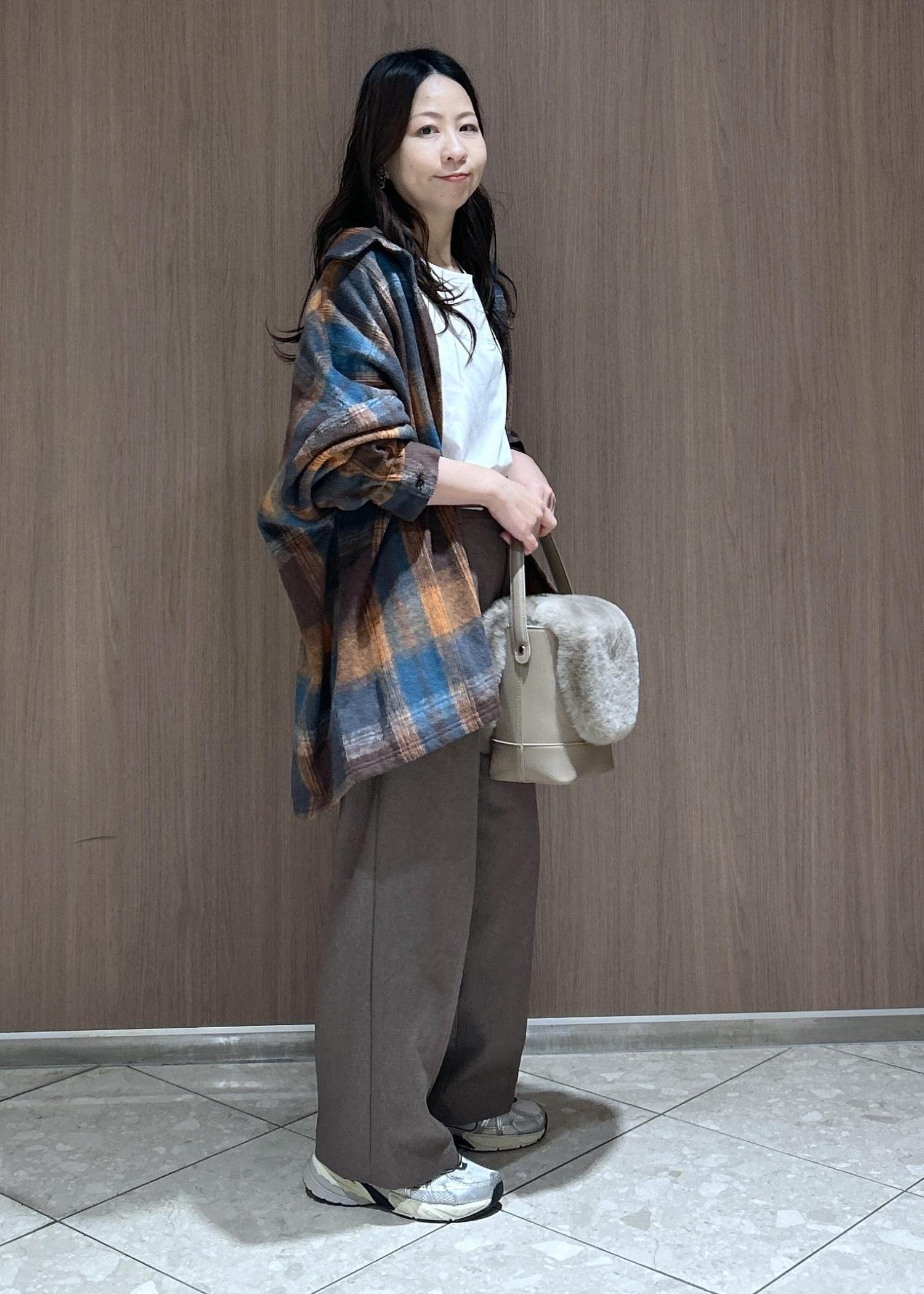 動きやすいスタイルで、オーバーチェックシャツで抜け感を出した着こなしにしてみました。オレンジとブラウンで統一感あるカラーでまとめたので落ち着きあるカジュアルスタイルです。子供と遊ぶ時にも体温調節もできるのでおすすめです。