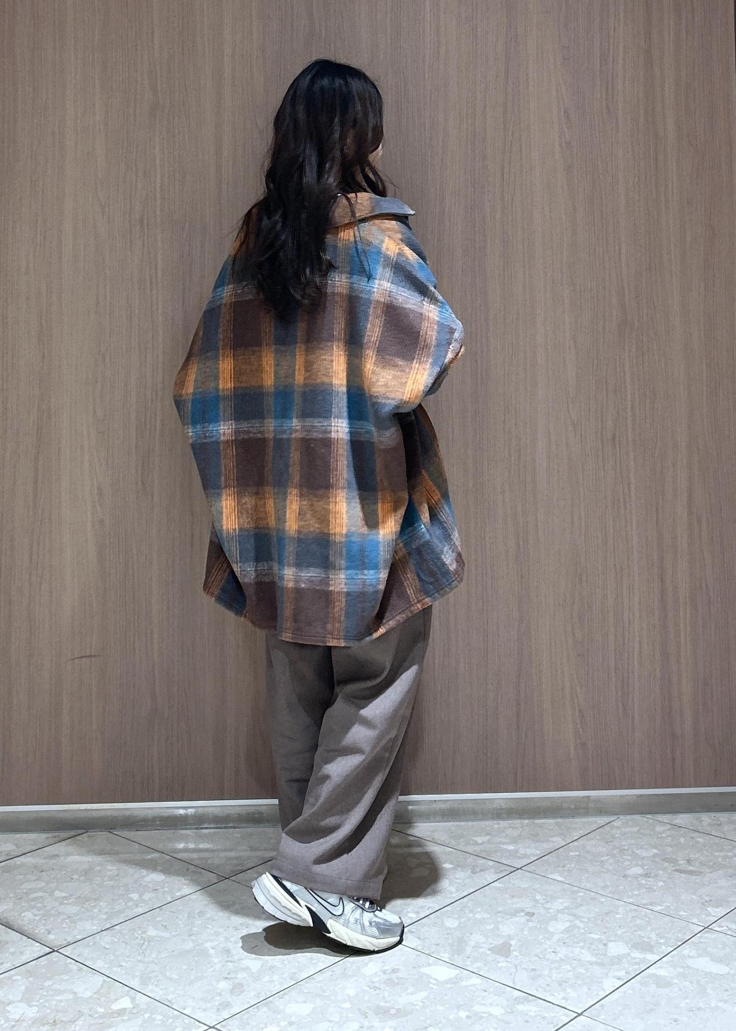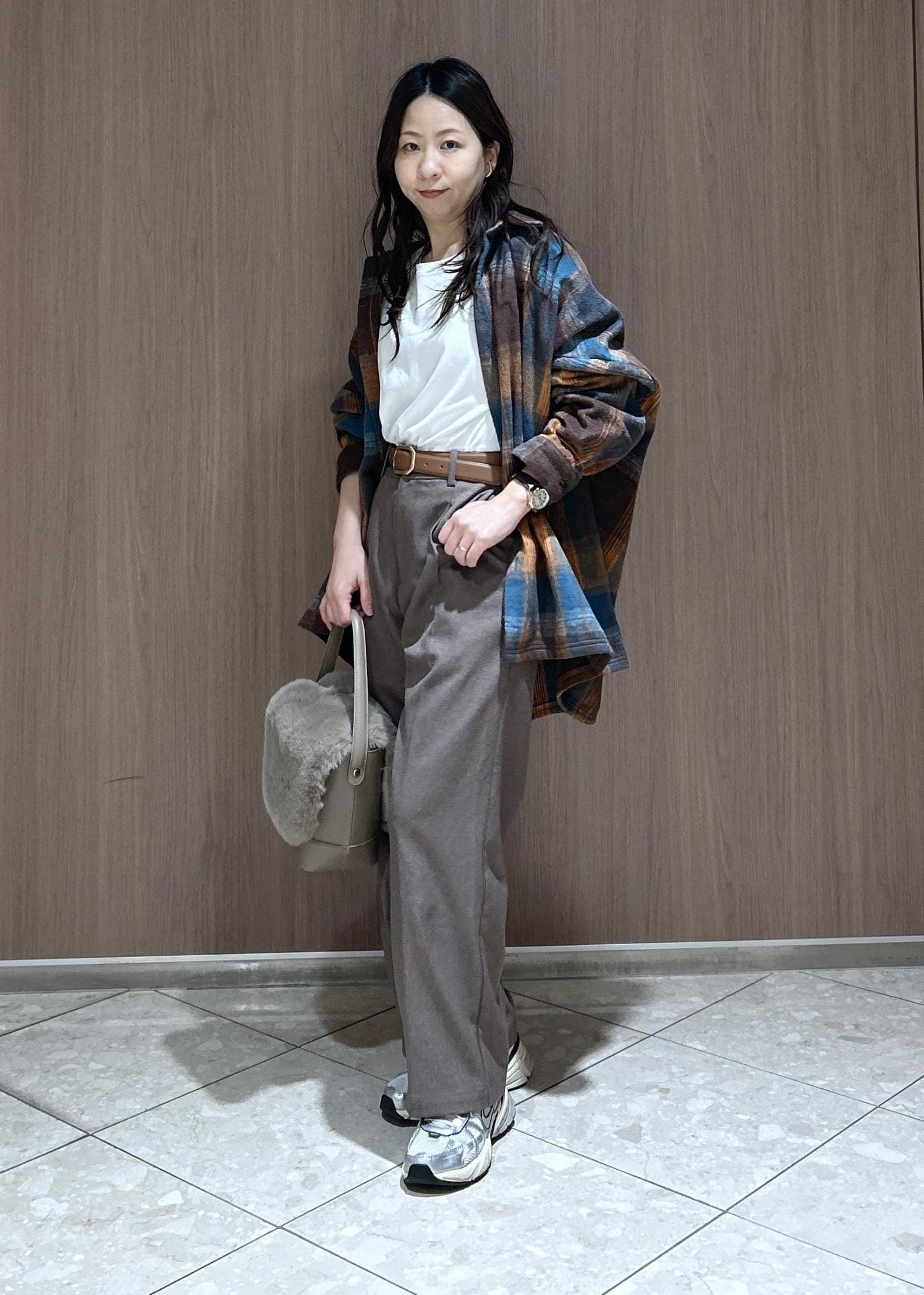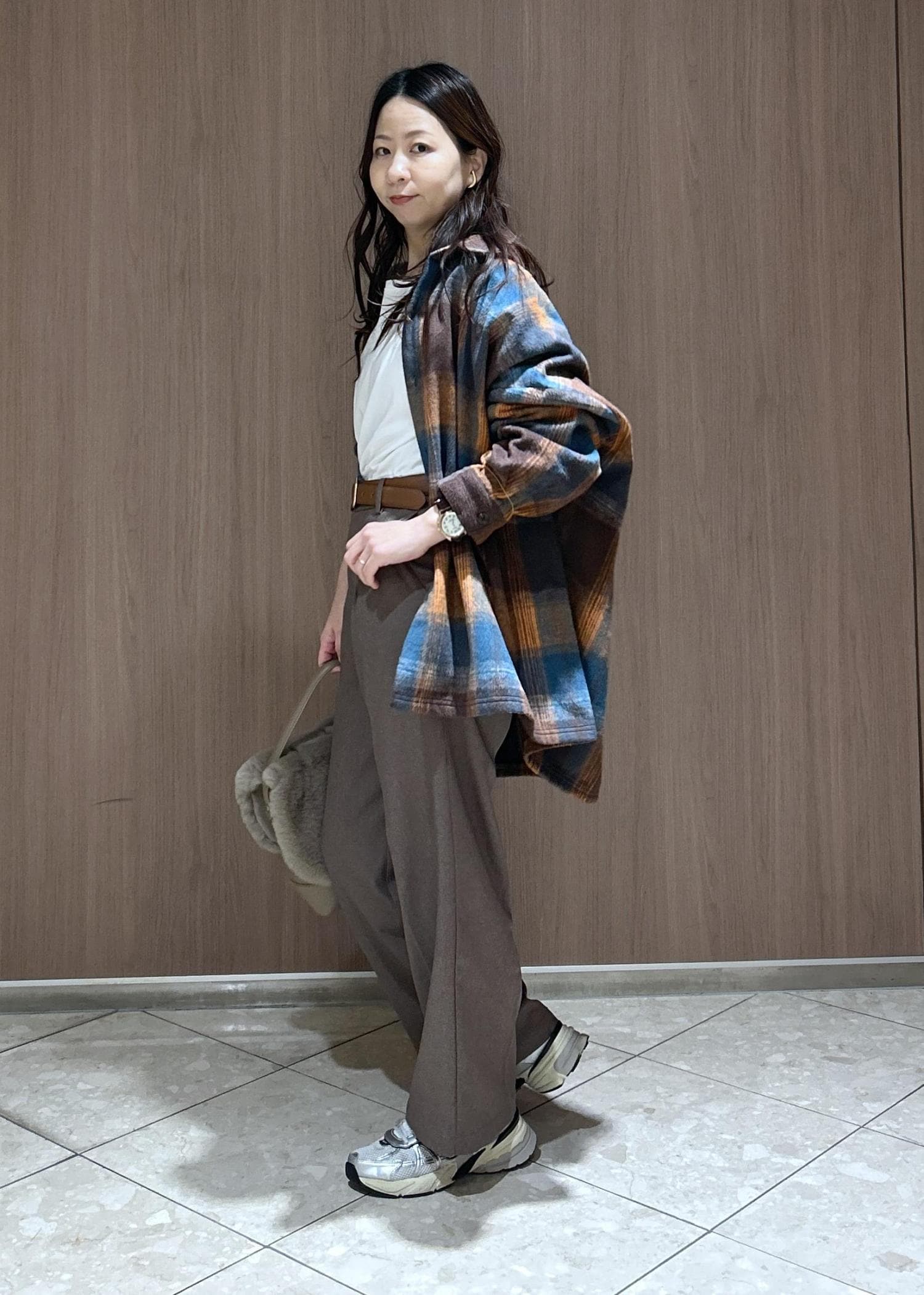 動きやすいスタイルで、オーバーチェックシャツで抜け感を出した着こなしにしてみました。オレンジとブラウンで統一感あるカラーでまとめたので落ち着きあるカジュアルスタイルです。子供と遊ぶ時にも体温調節もできるのでおすすめです。