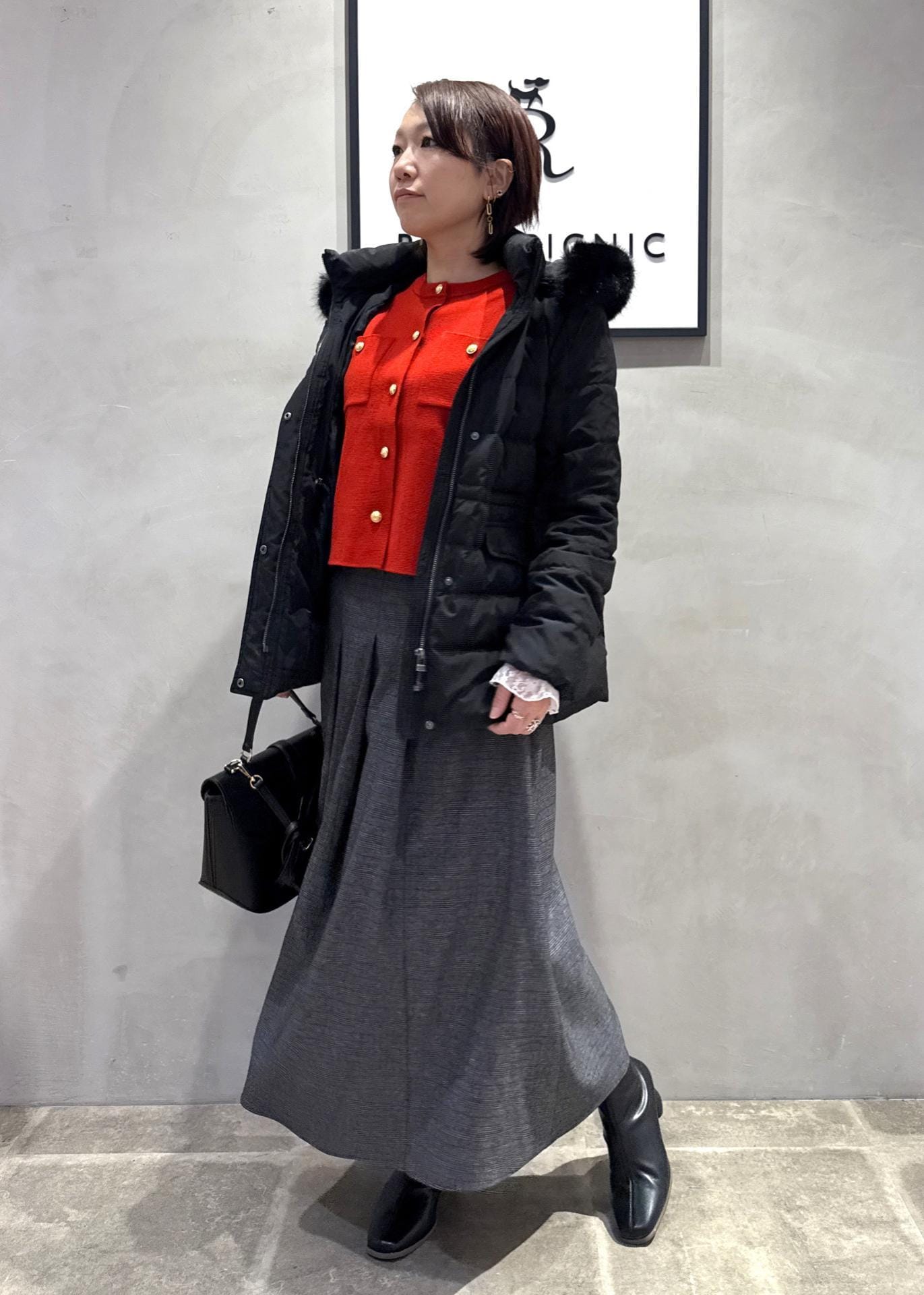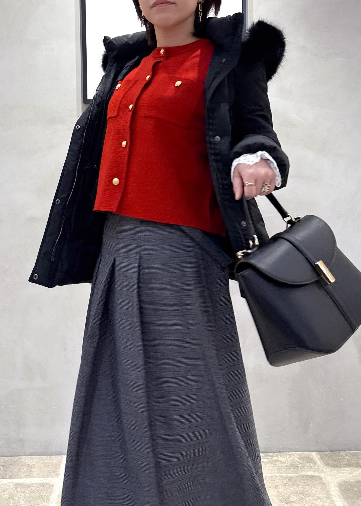 差し色のレッドニットが主役の冬スタイリング。