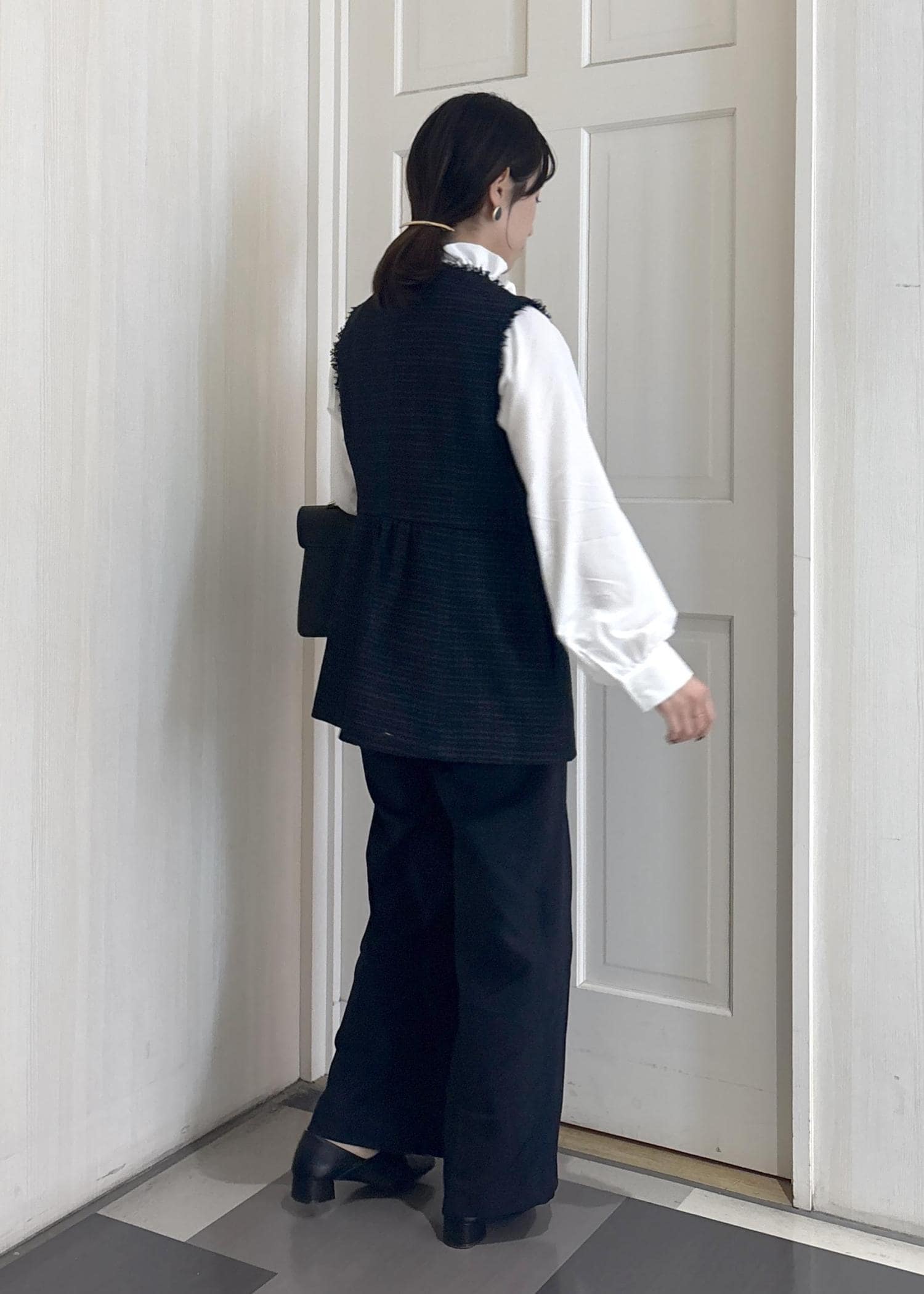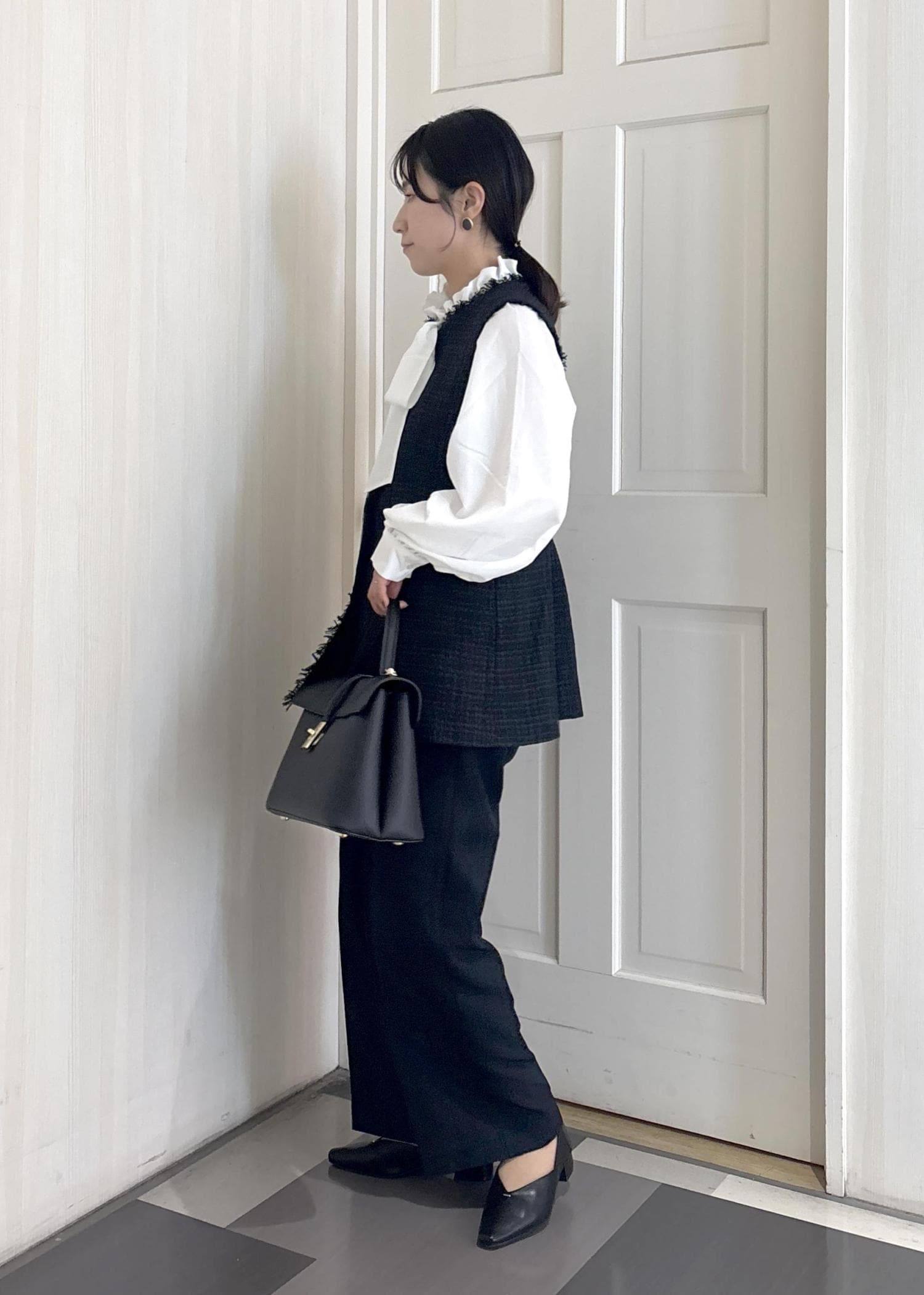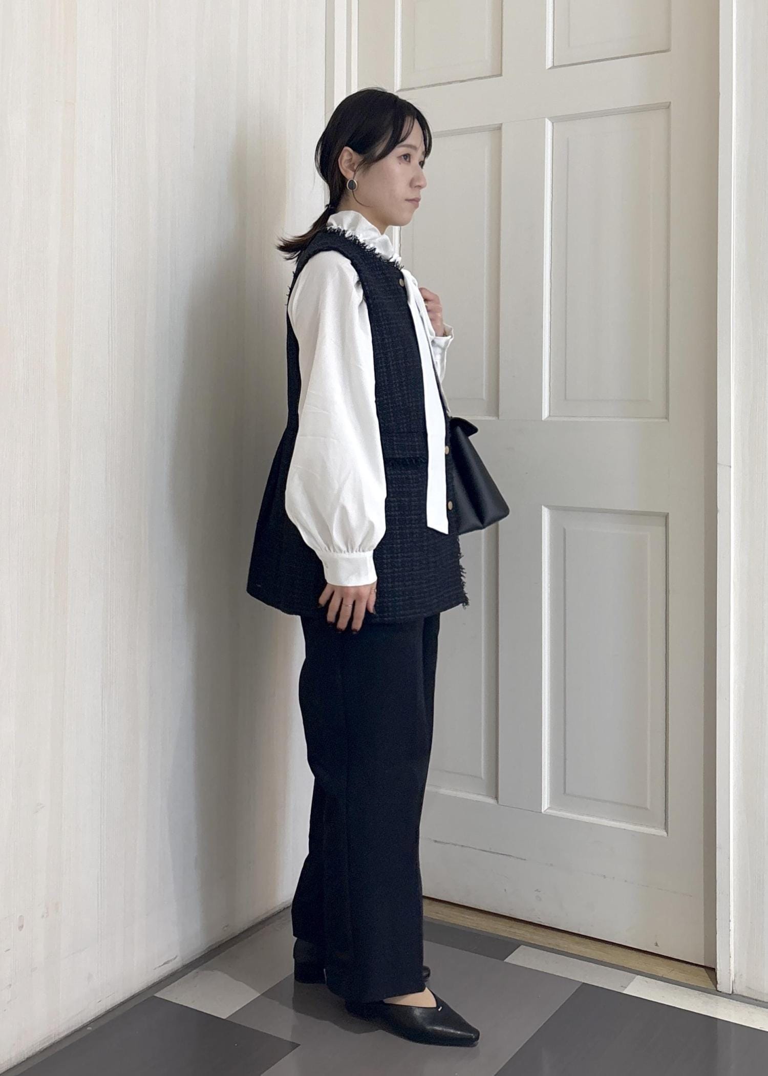 ブラウスはフリル多めで首が詰まるので、私は片リボン結びで着てみました☺︎