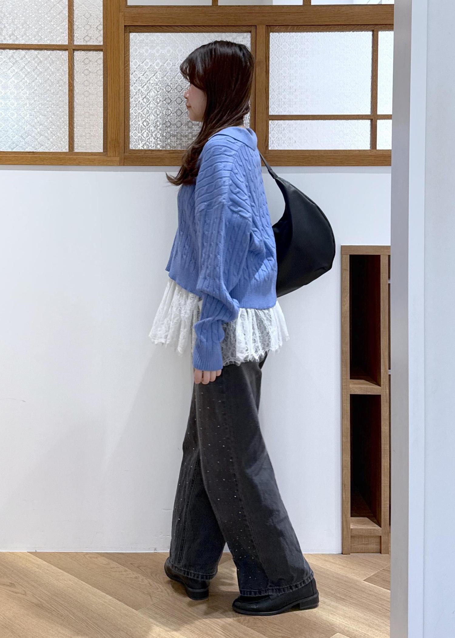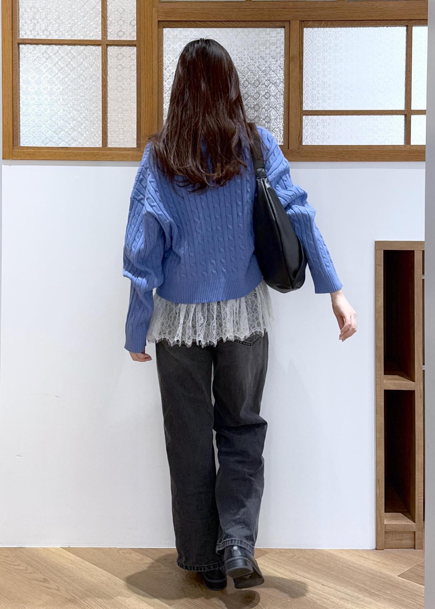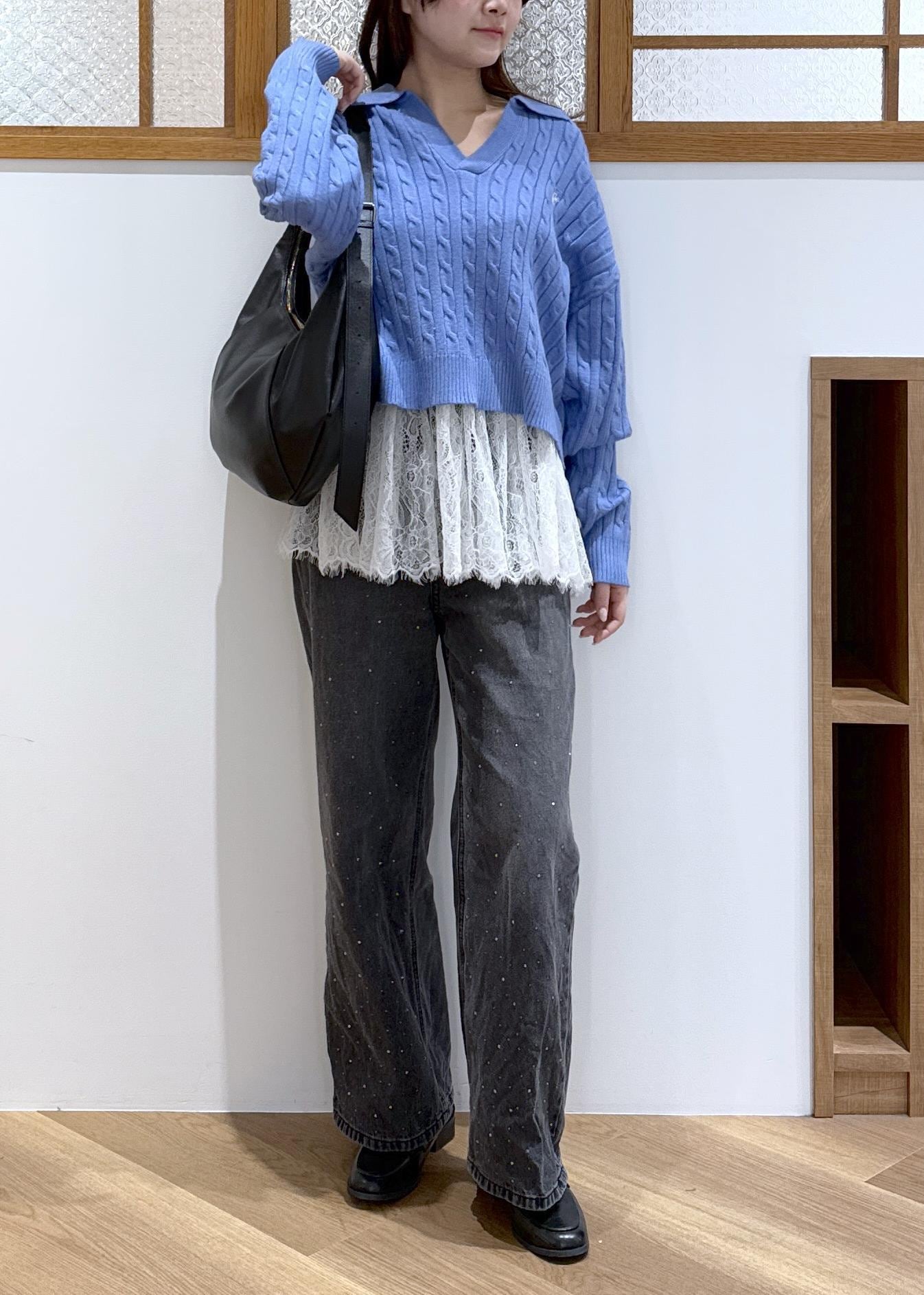 ブルー×ブラックのかっこよさを感じる色味の合わせに、レースビスチェをレイヤードし甘辛コーデを組みました。
