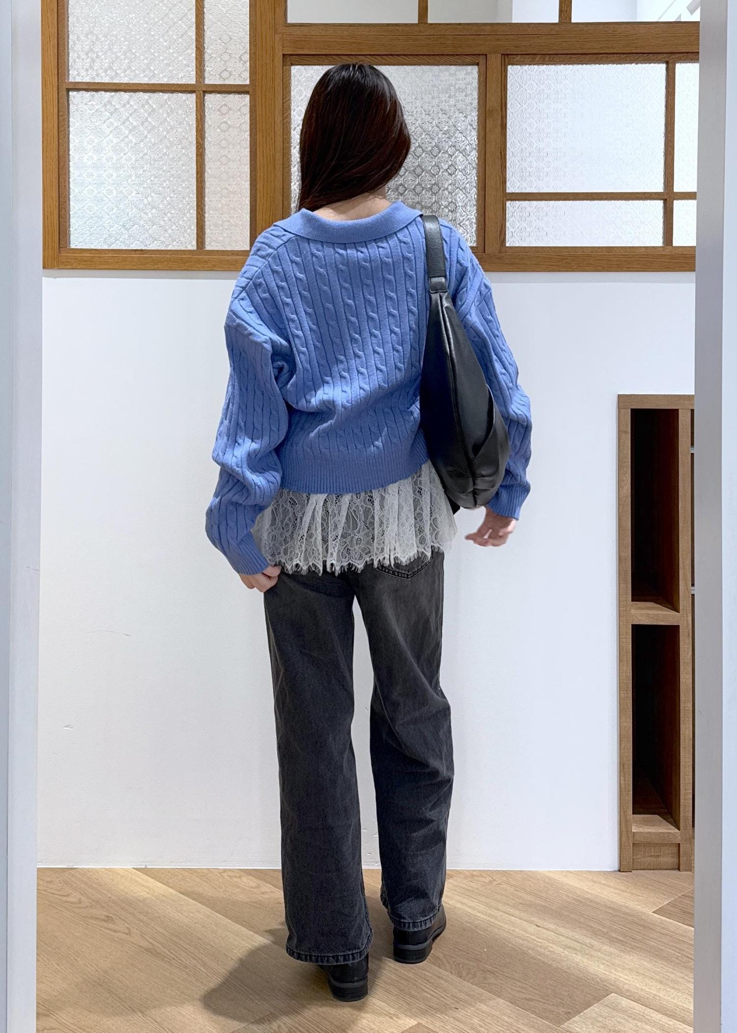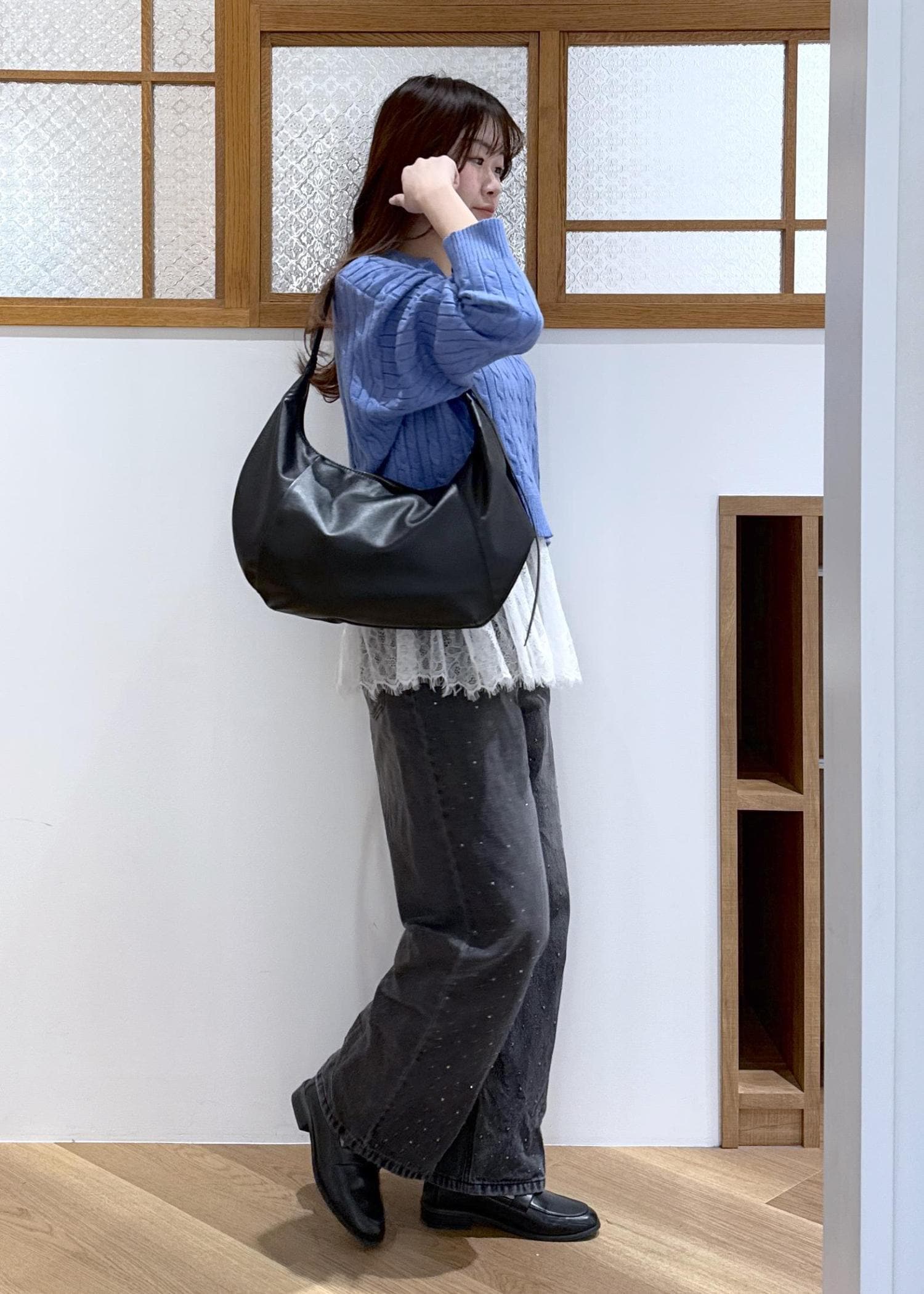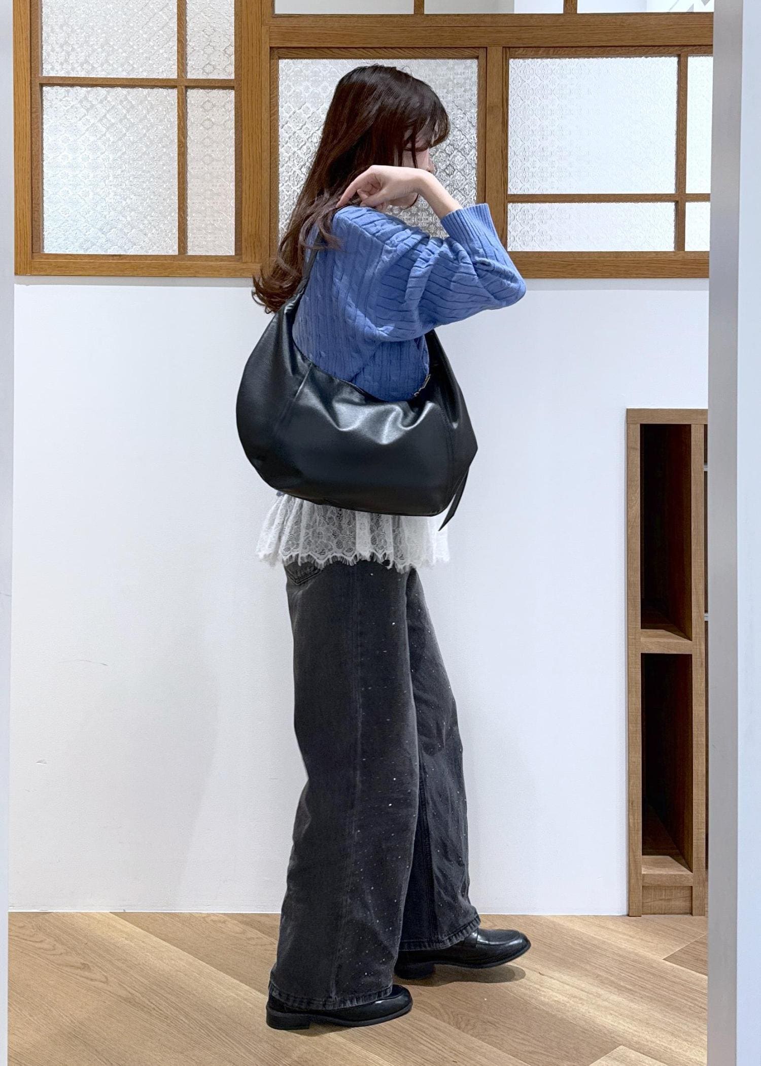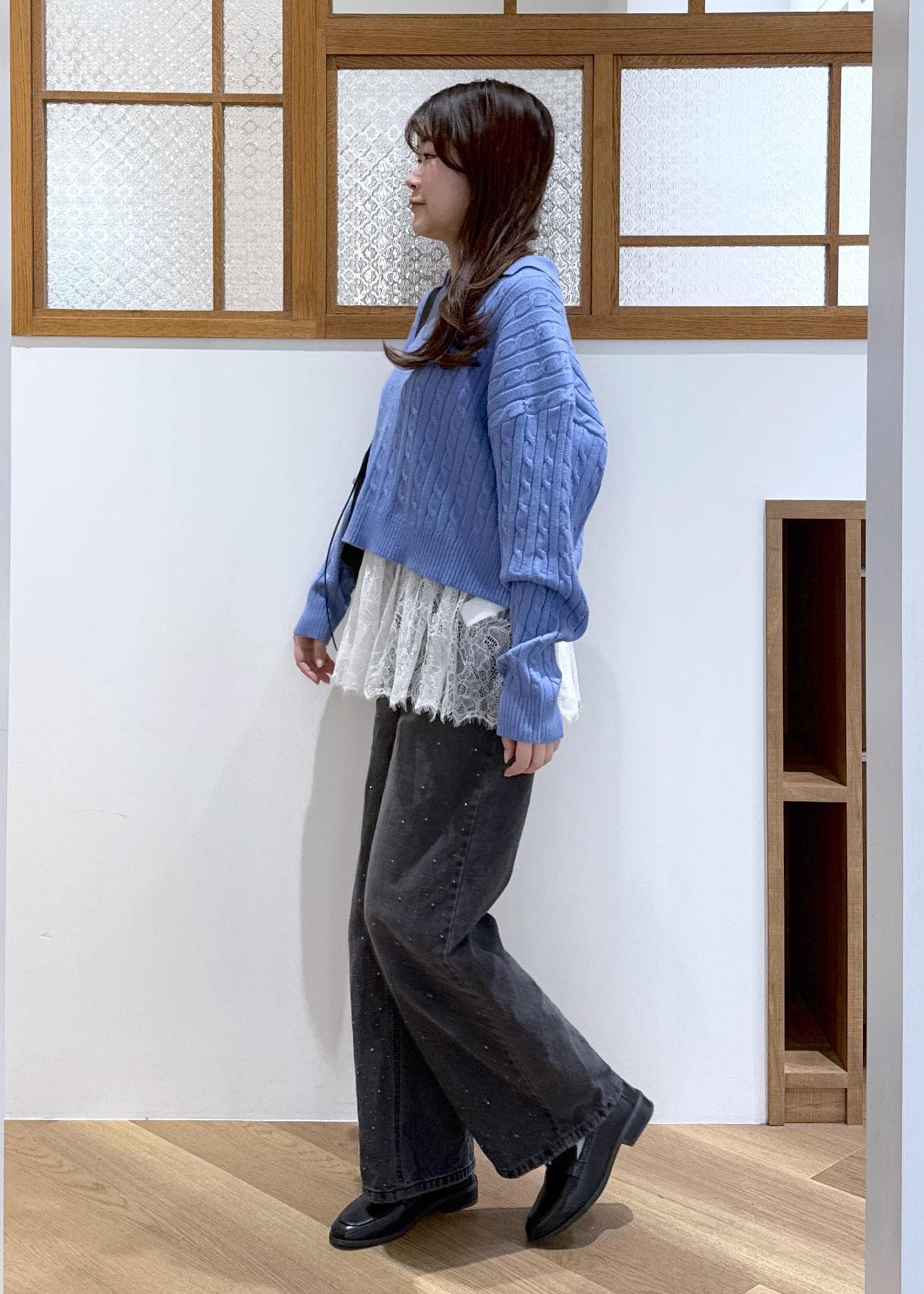 ブルー×ブラックのかっこよさを感じる色味の合わせに、レースビスチェをレイヤードし甘辛コーデを組みました。