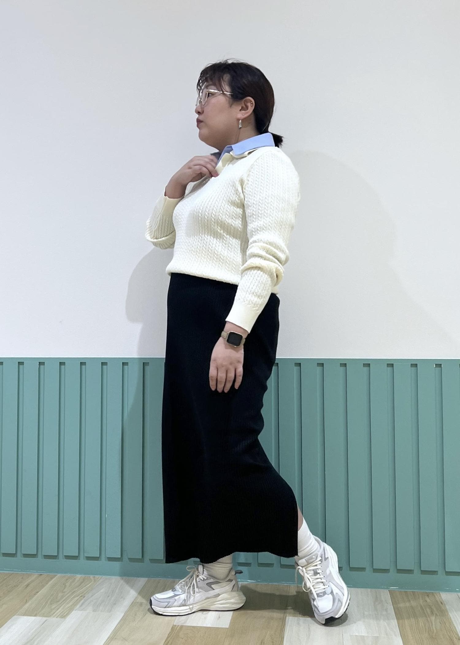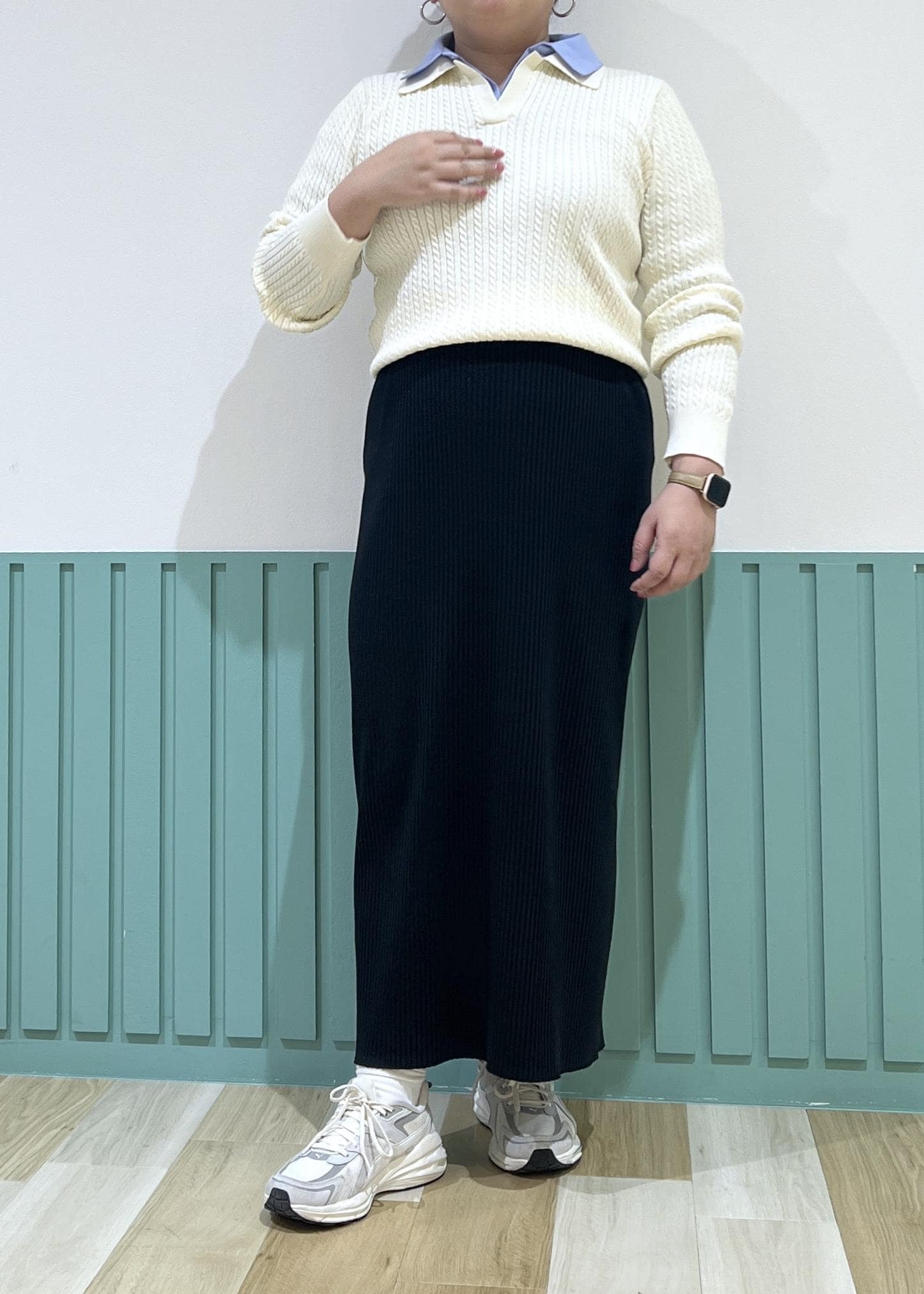 レイヤード風のニットの襟元のカラーがアクセントに。