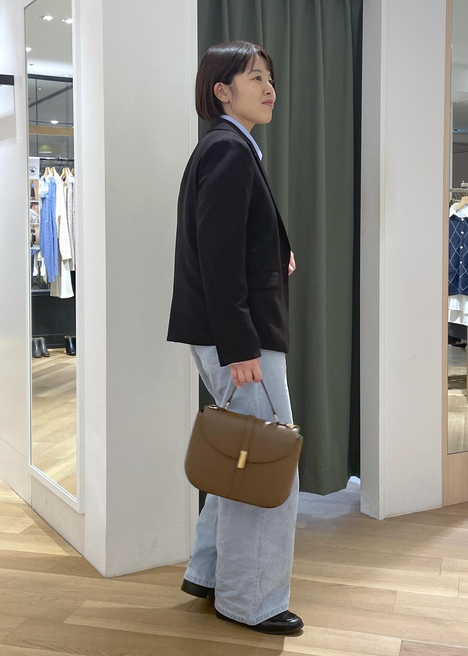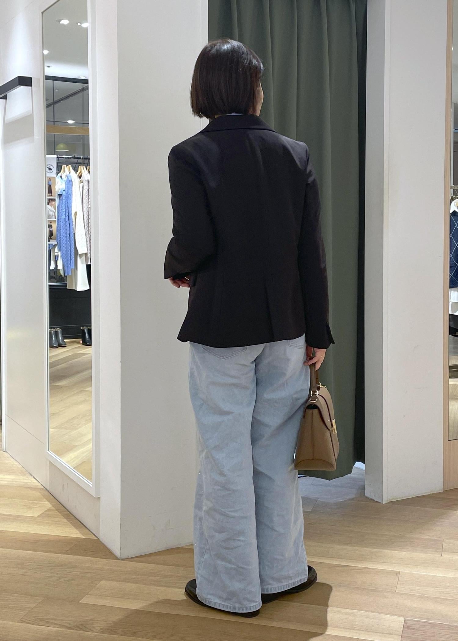 かっちりした印象のテーラードジャケットにビジューのデニムを合わせた、お出かけにも使える、ジャケットのカジュアルダウンコーデです!