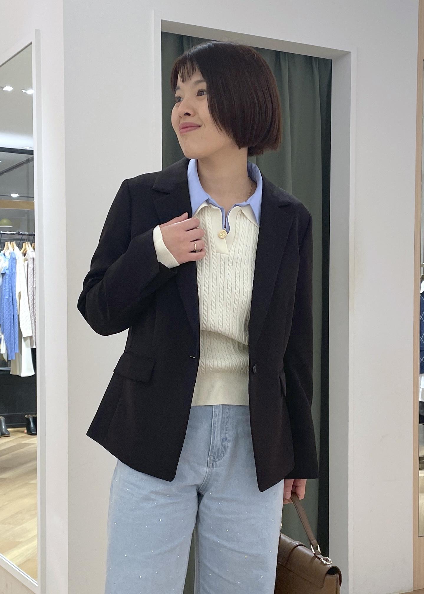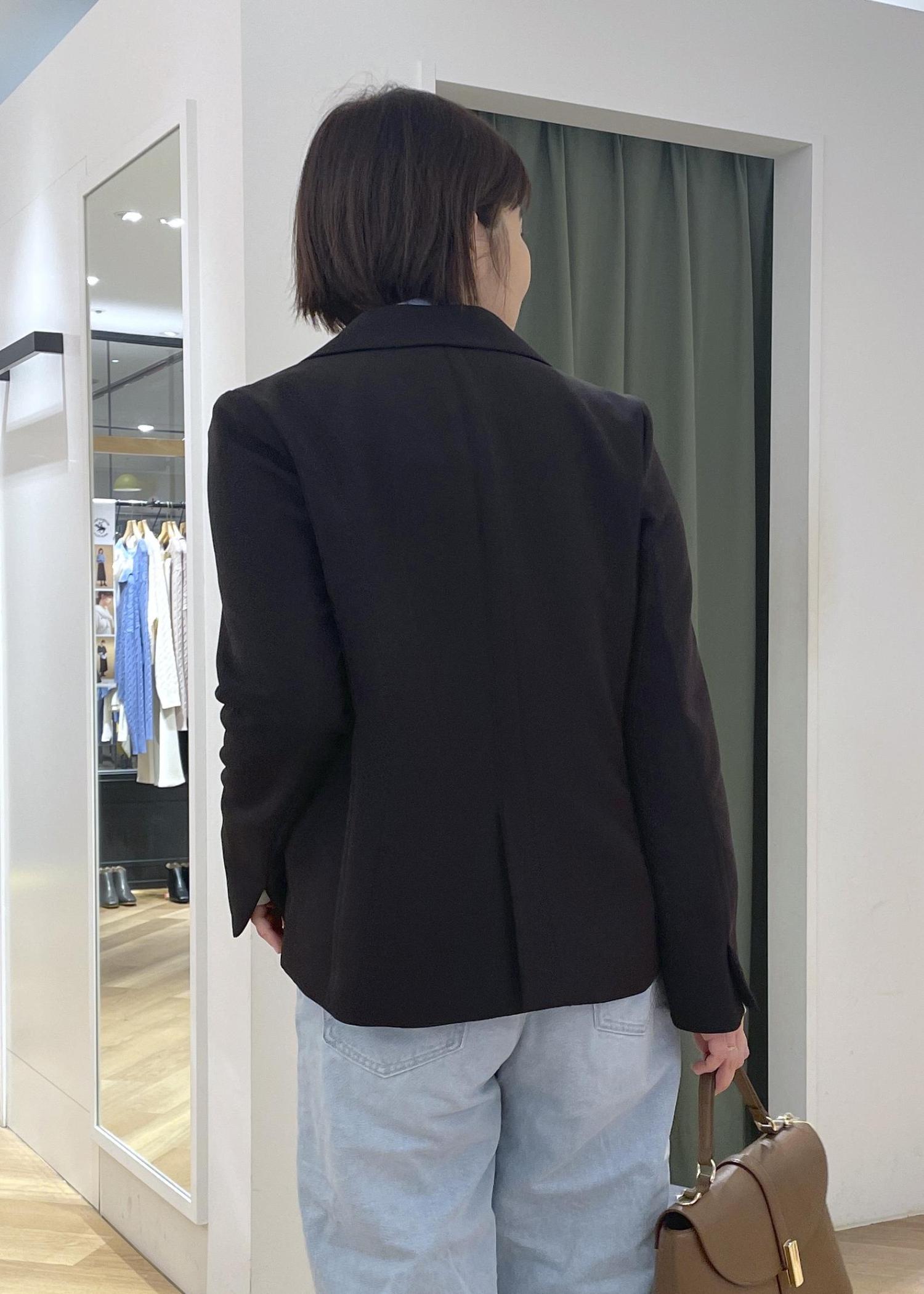 ジャケットのインナーにはレイヤードっぽく見えるダブルカラーのニットを合わせてトレンド感あるコーデに◎
