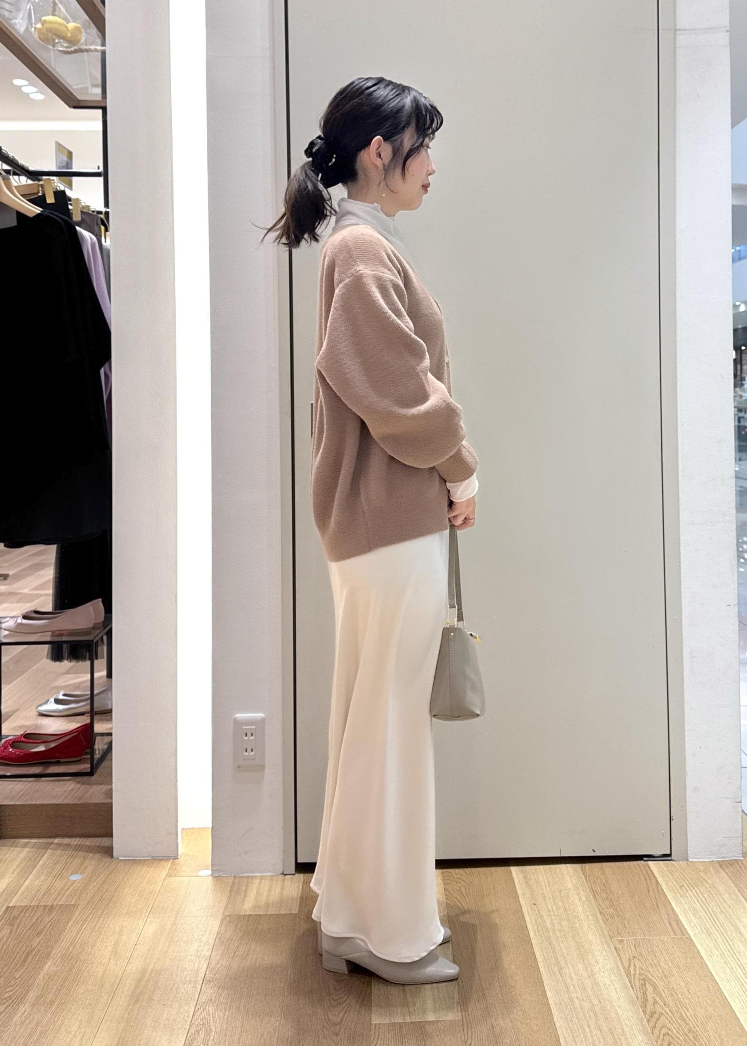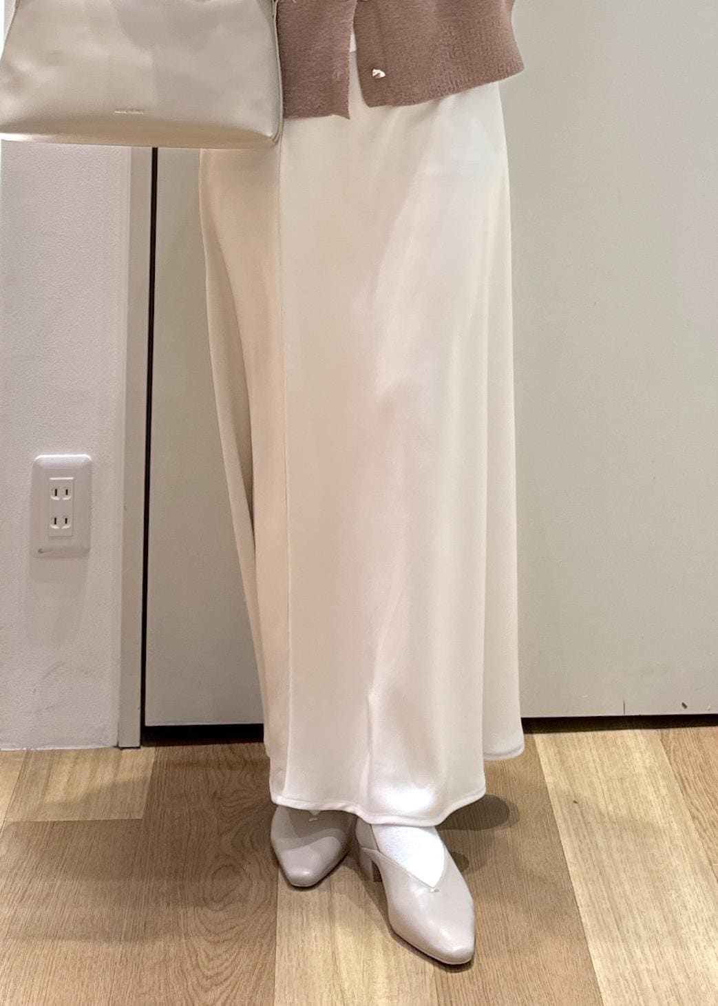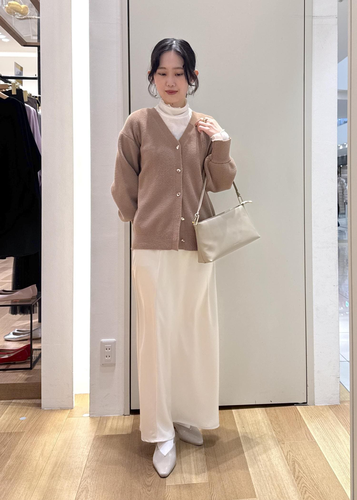 春見えするようなフェミニンコーデに仕上げたかったので、シアータートルを重ねたり、色も他のアイテムは白や明るいベージュにまとめてみました◎