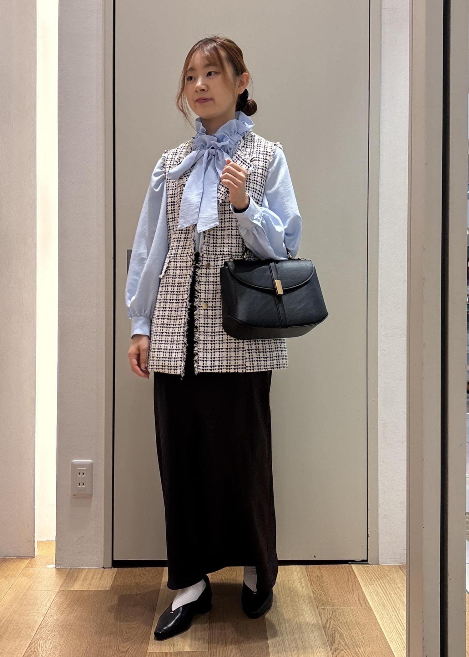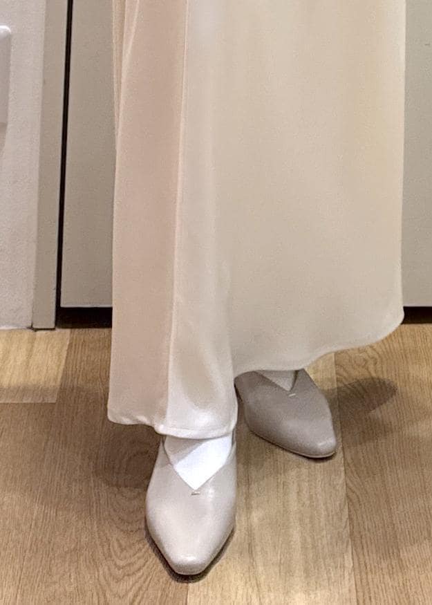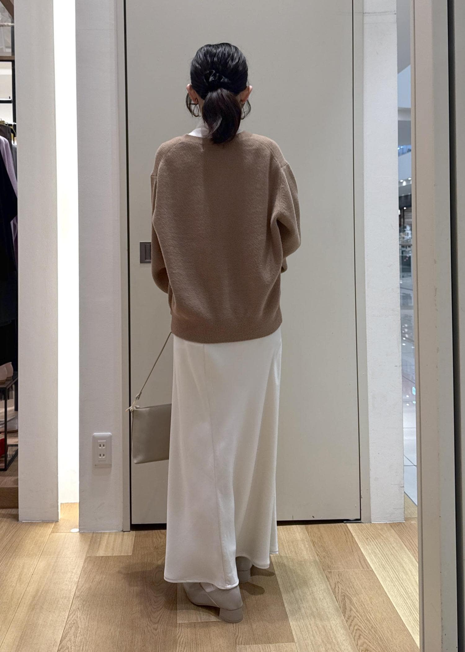 春見えするようなフェミニンコーデに仕上げたかったので、シアータートルを重ねたり、色も他のアイテムは白や明るいベージュにまとめてみました◎