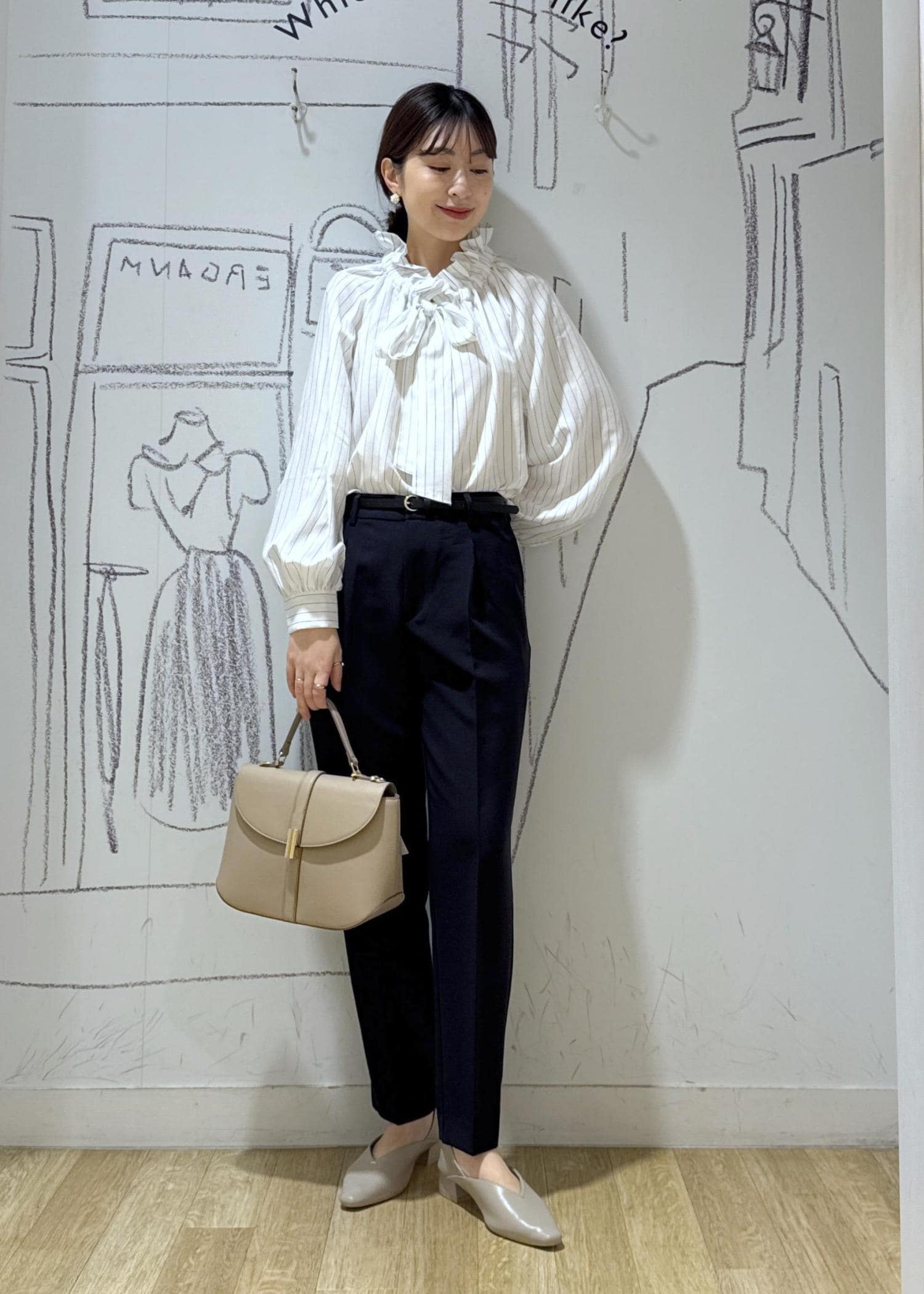 ROPÉ PICNICネックコンシャスデザインシャツ/イージーケアホワイト系 / F¥5,995レビューシワが気になりにくいポリエステル生地。薄手で柔らかいので羽織ものとの相性もいいです。襟元の開き具合はボウタイを絞ったり緩めたりして調整可能。顔まわりが一気に華やぐ一枚です。