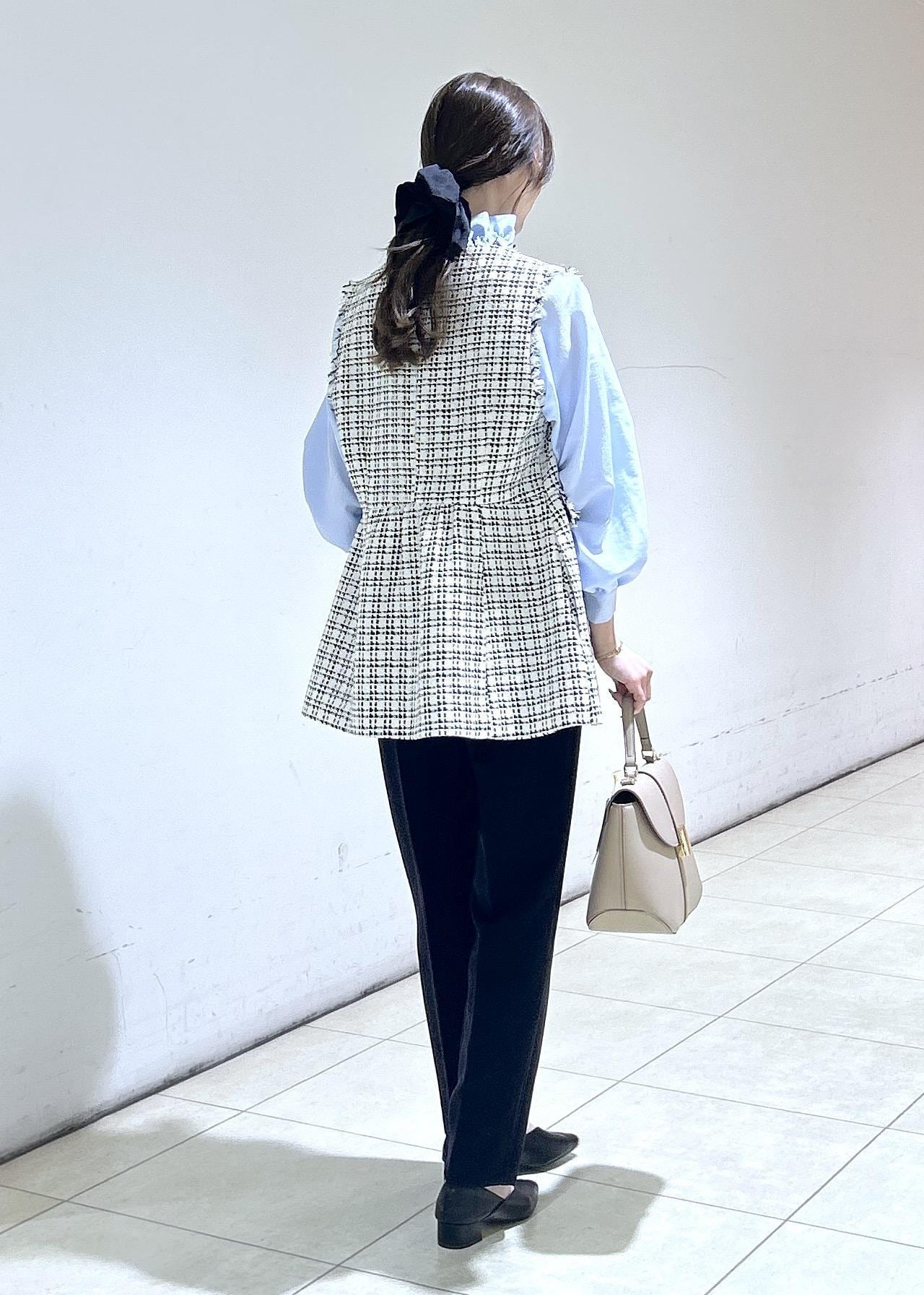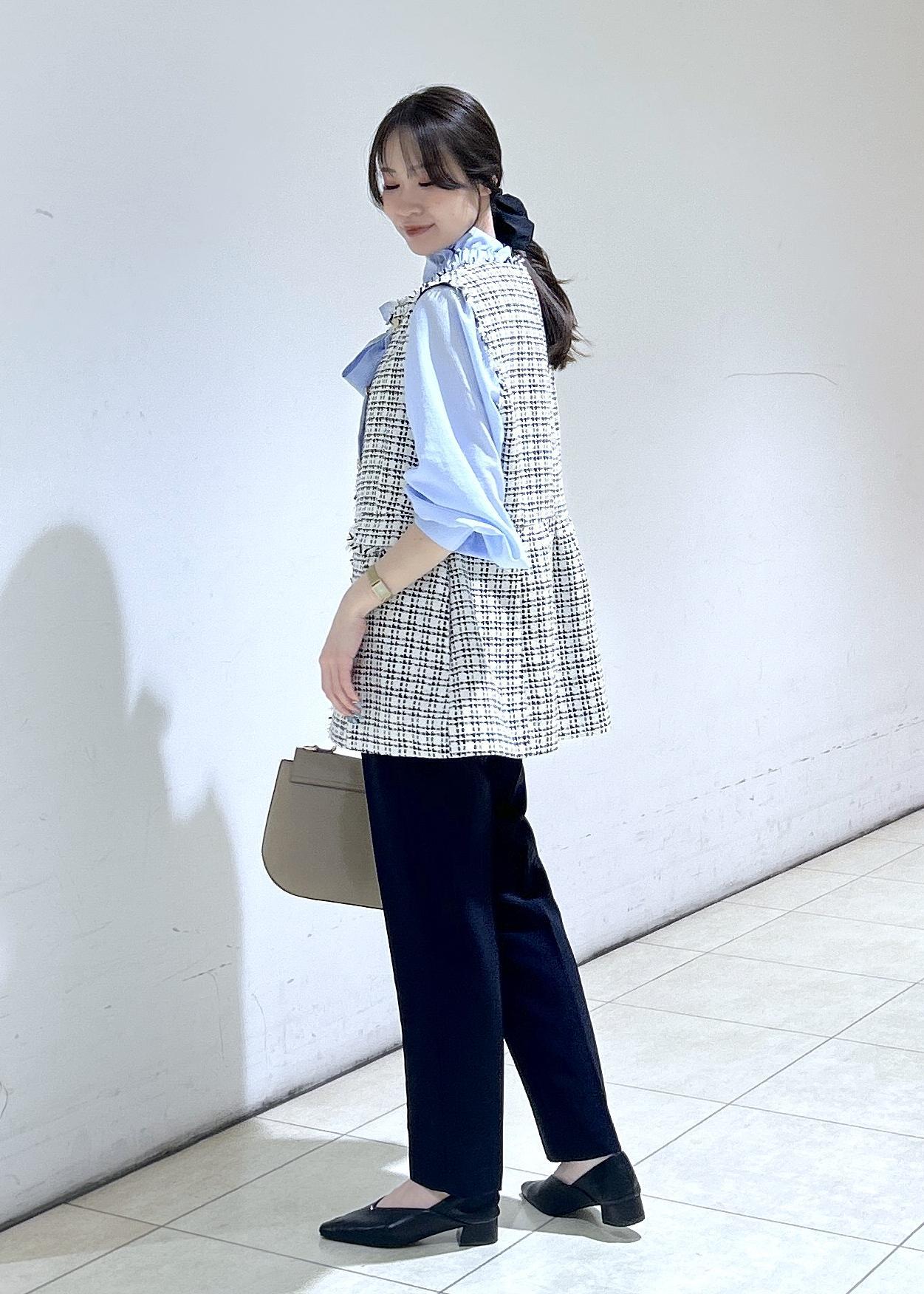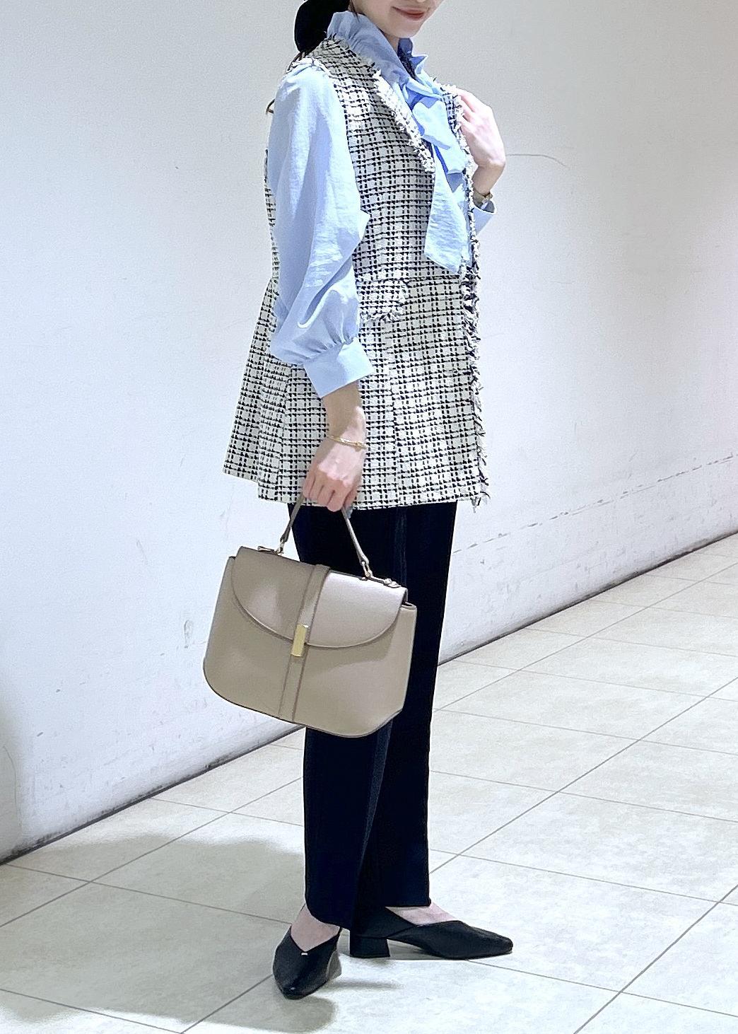 ブルーのブラウスにジレとキレイめと可愛らしさを取り入れたセレモニーコーデにしました。