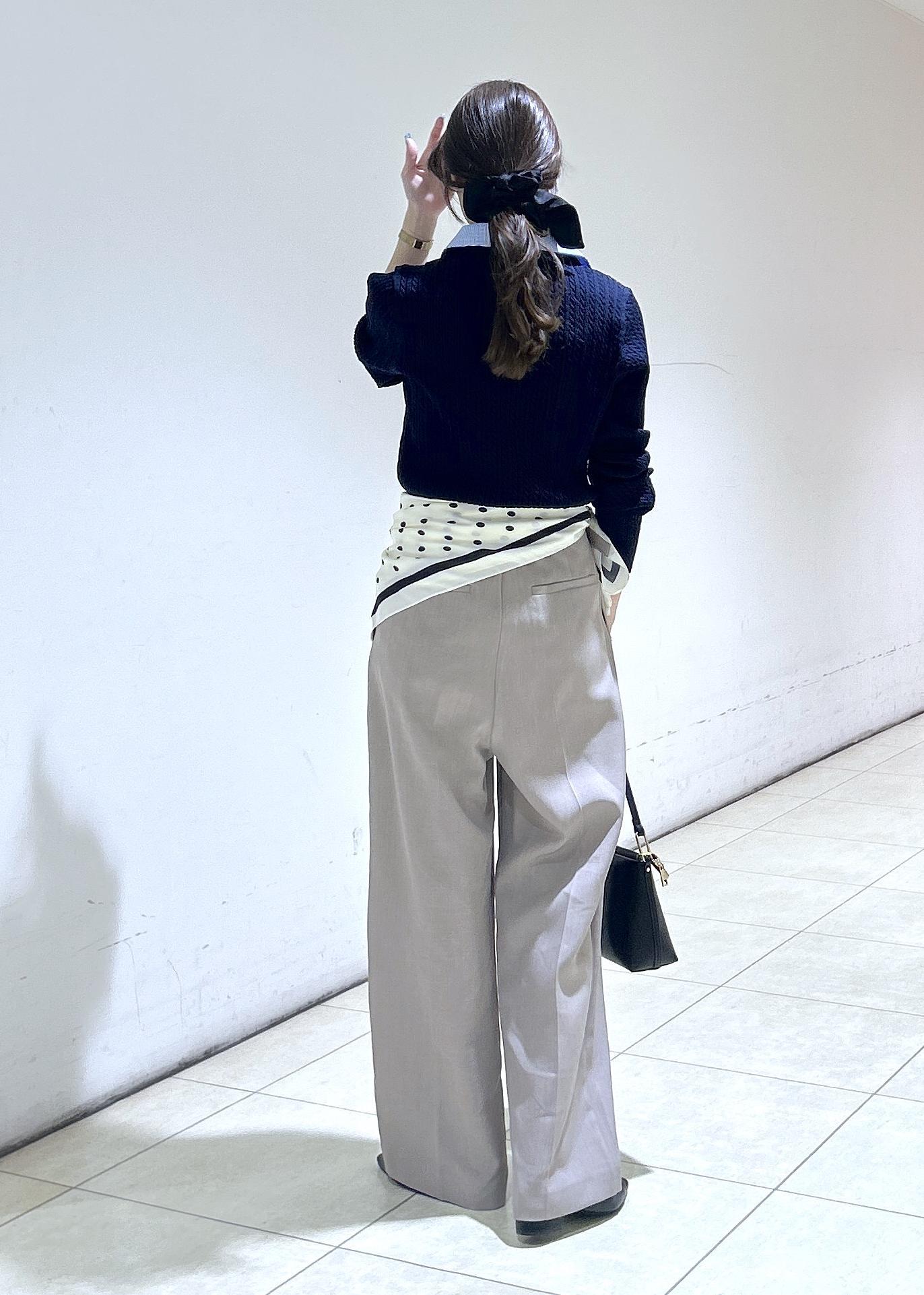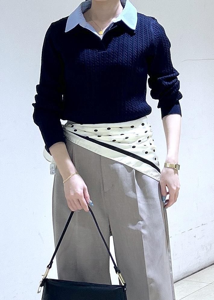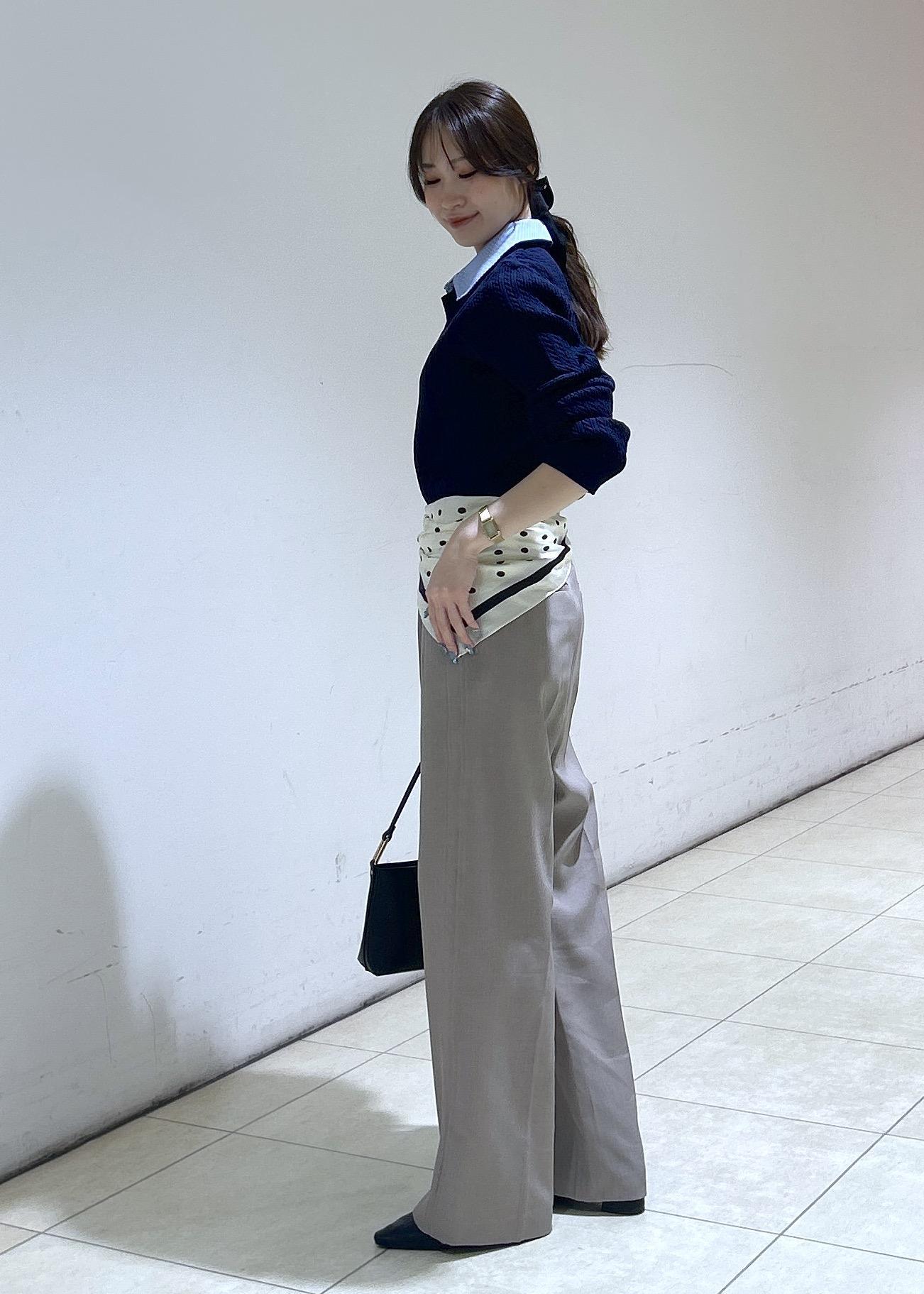 一枚で重ね着が楽しめるトップスにパンツはベージュで春まで使えるスタイリングにしました。