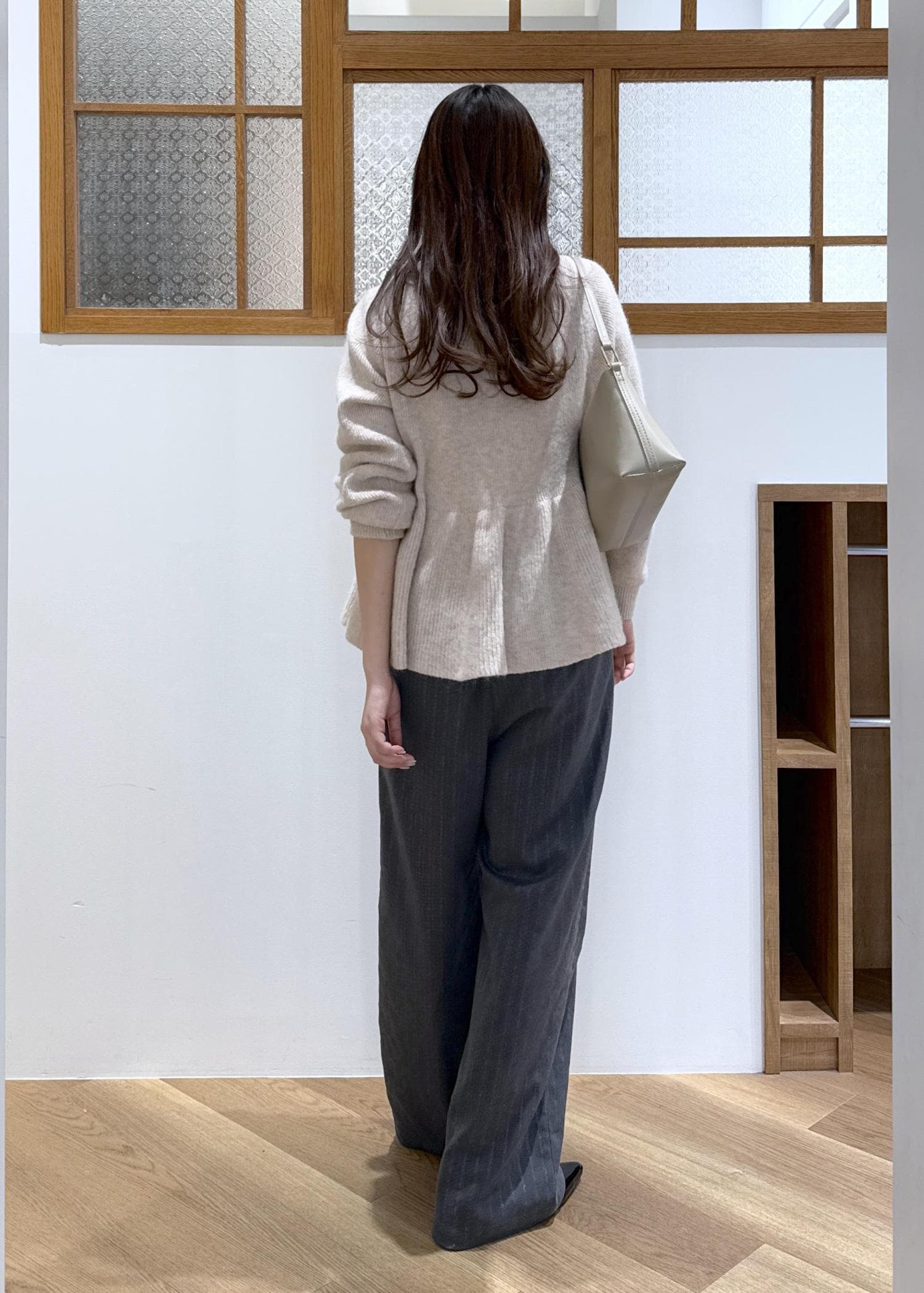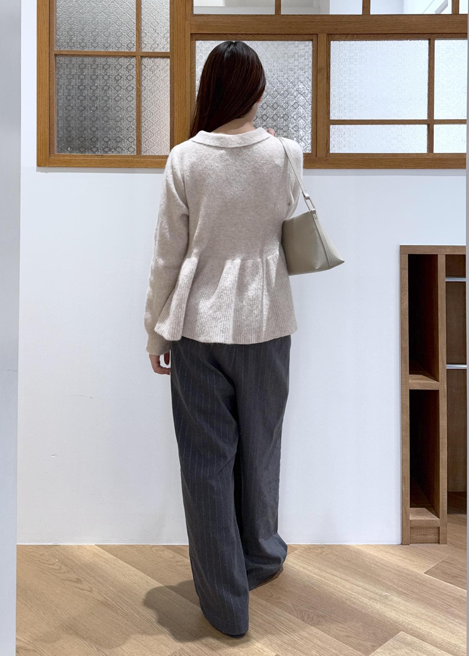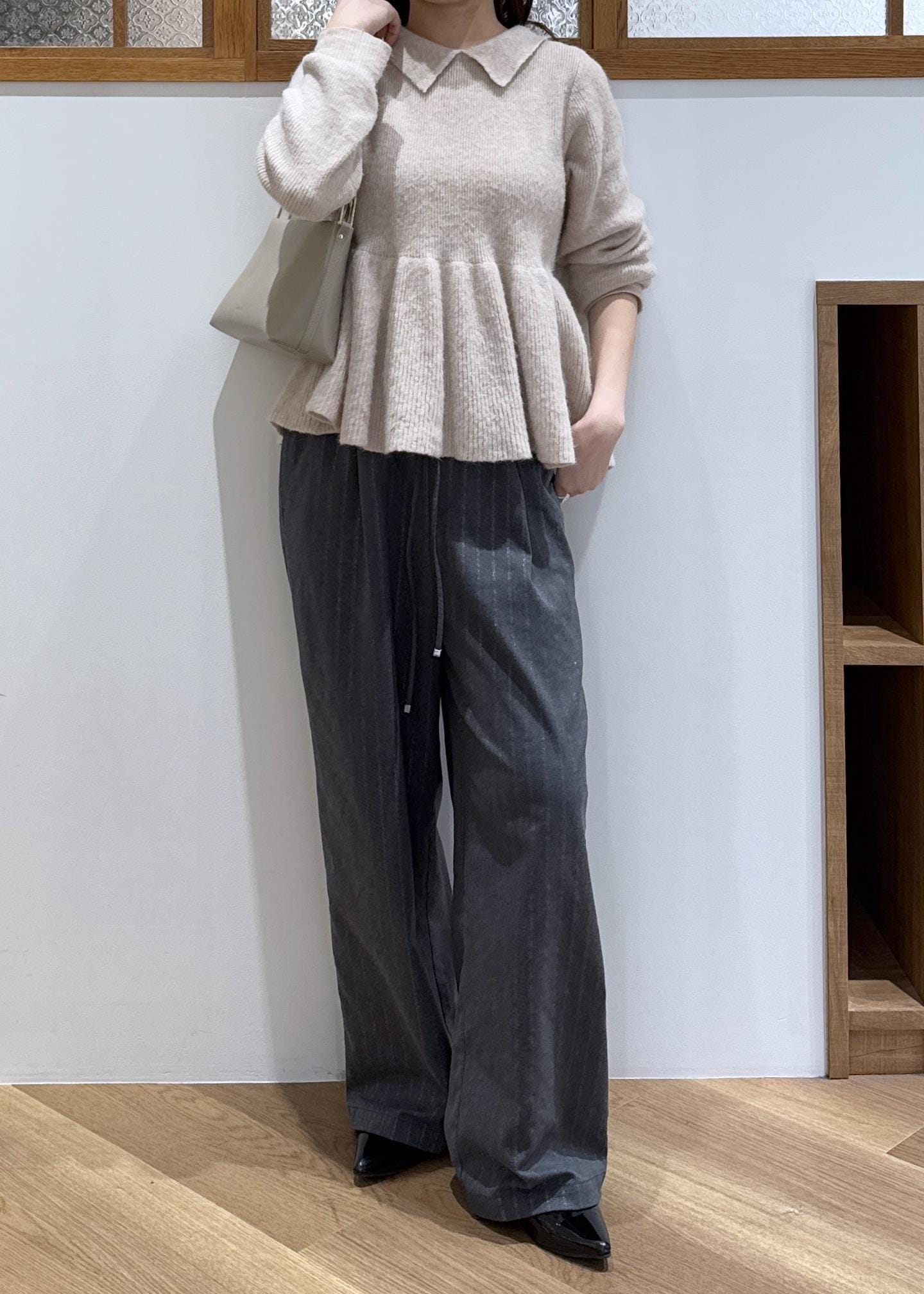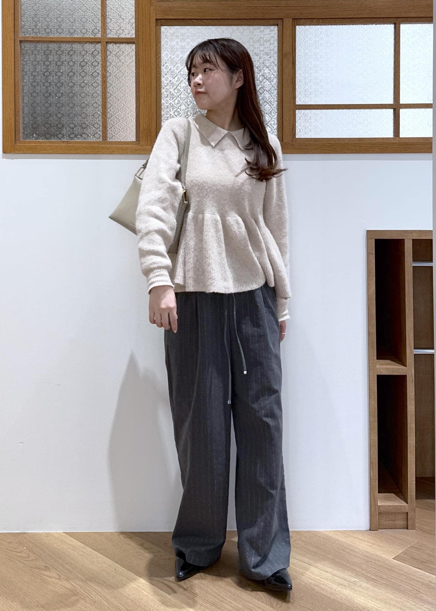 ペプラムと襟が可愛らしい印象のトップスはよりフェミニンな雰囲気を演出できるベージュカラーをチョイス。