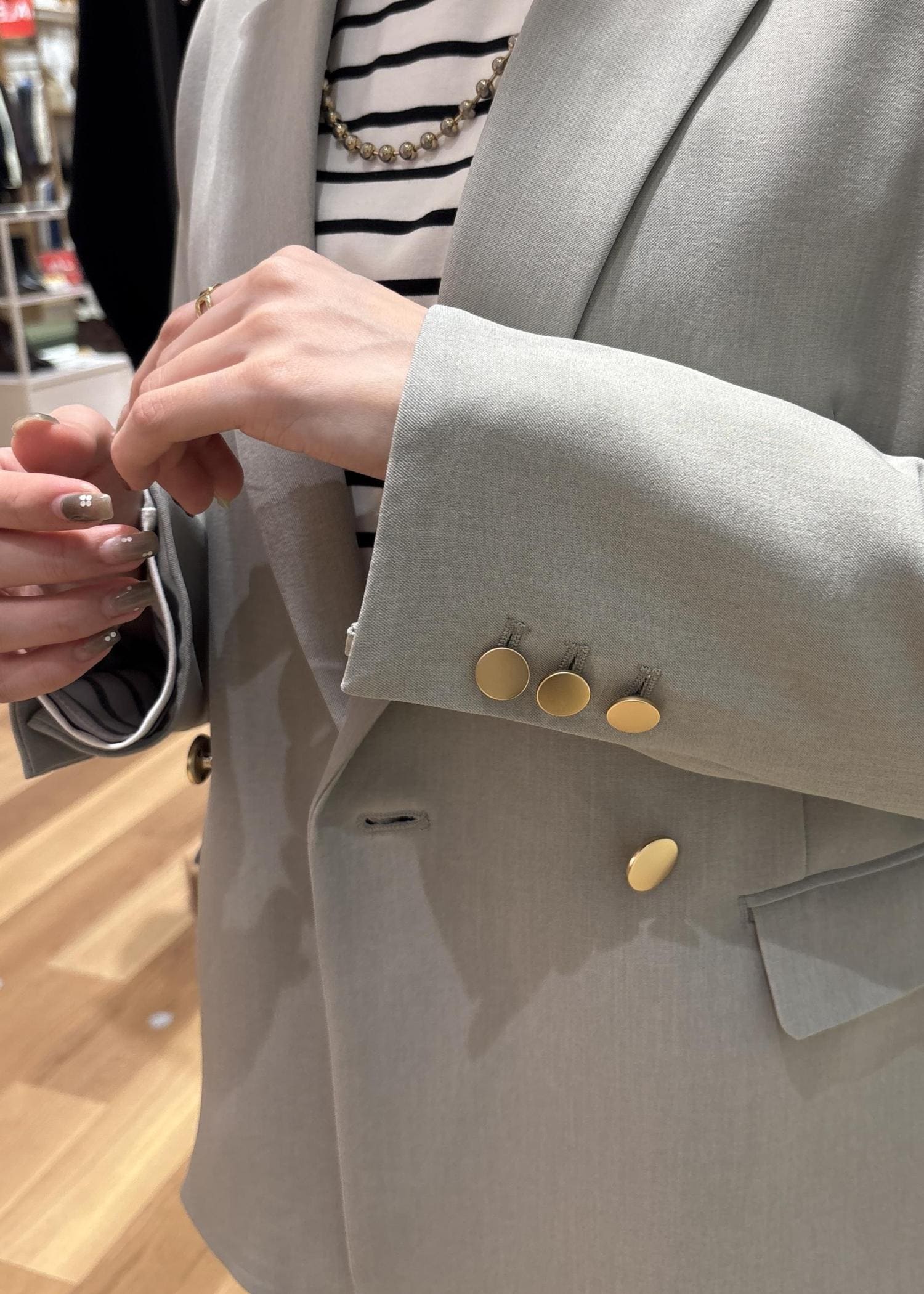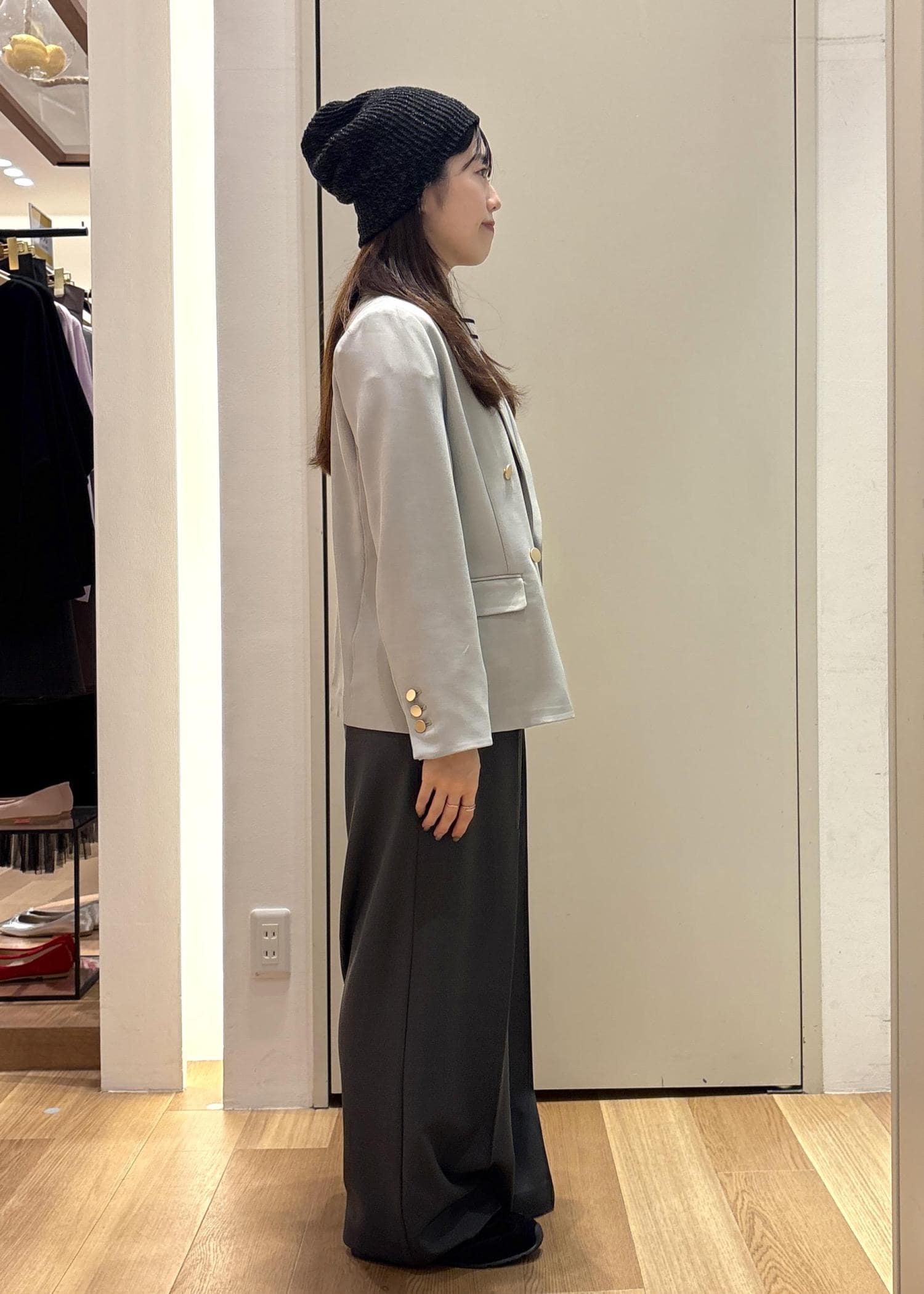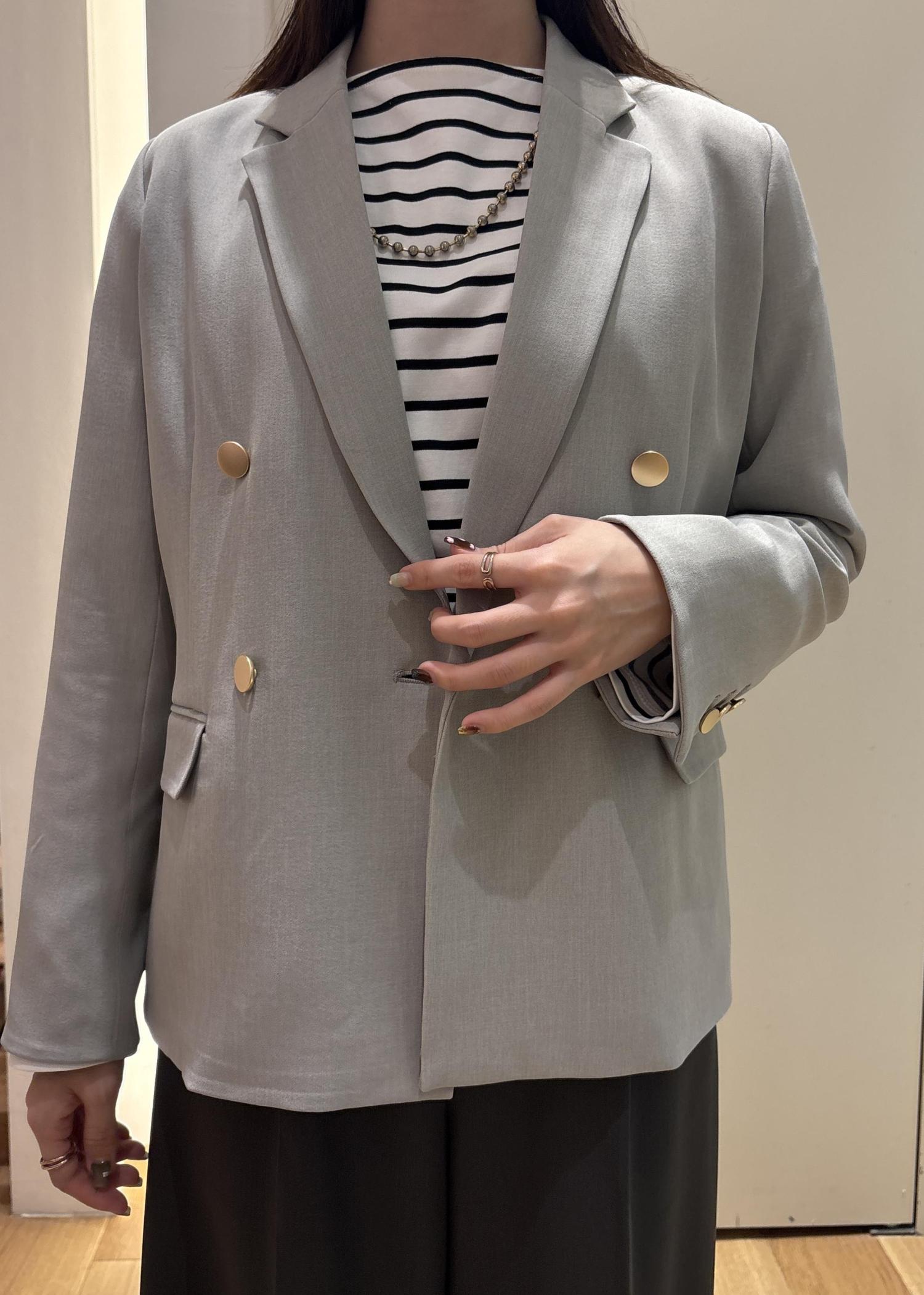 金ボタンが程よいアクセントになり、シンプルな合わせでも華やかさをプラスしてくれます。