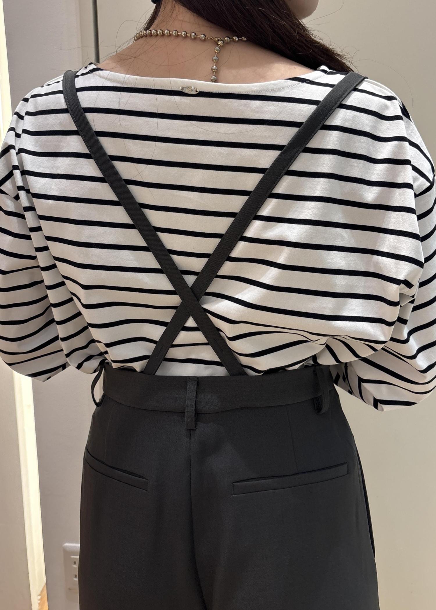 サスペンダー付きなので、シンプルなトップス合わせでもコーデが完成します。